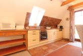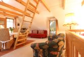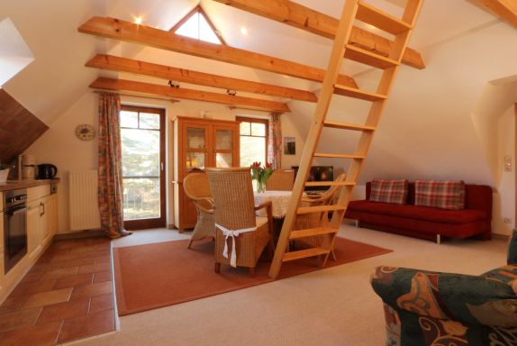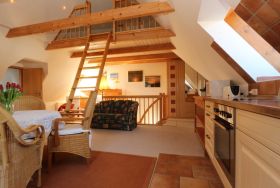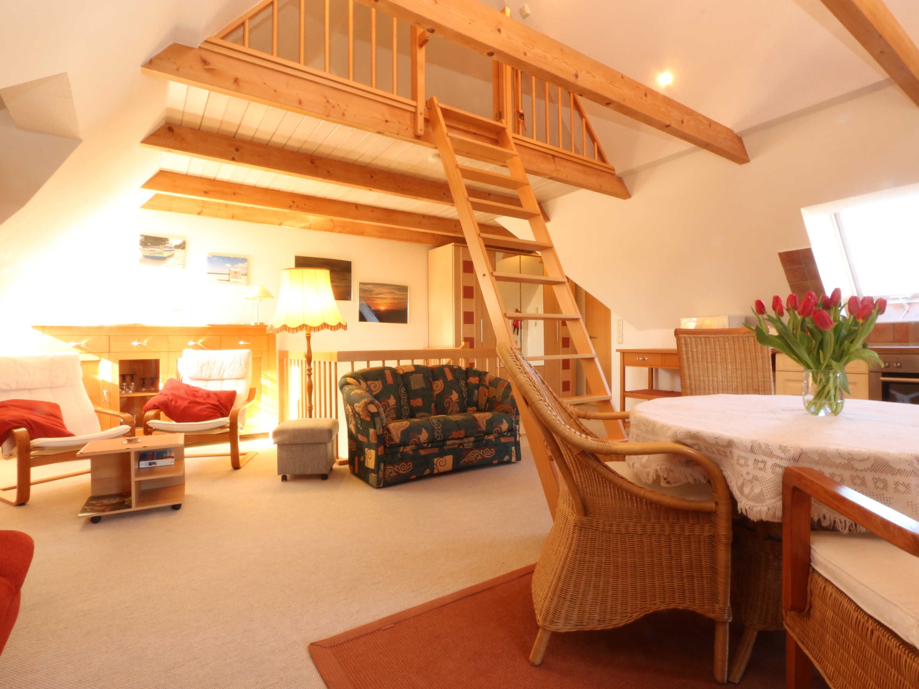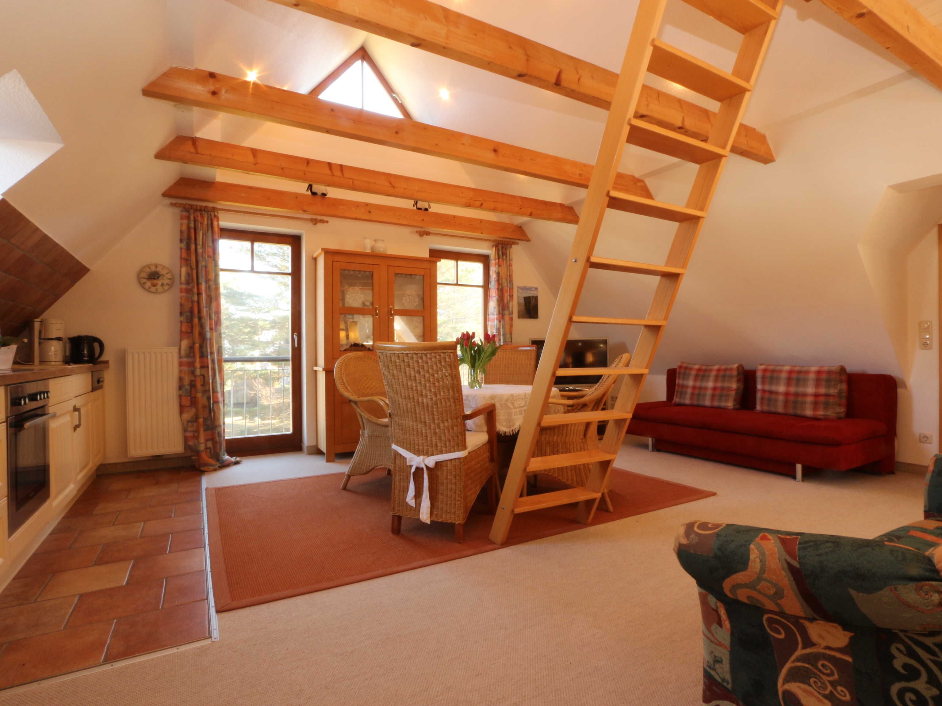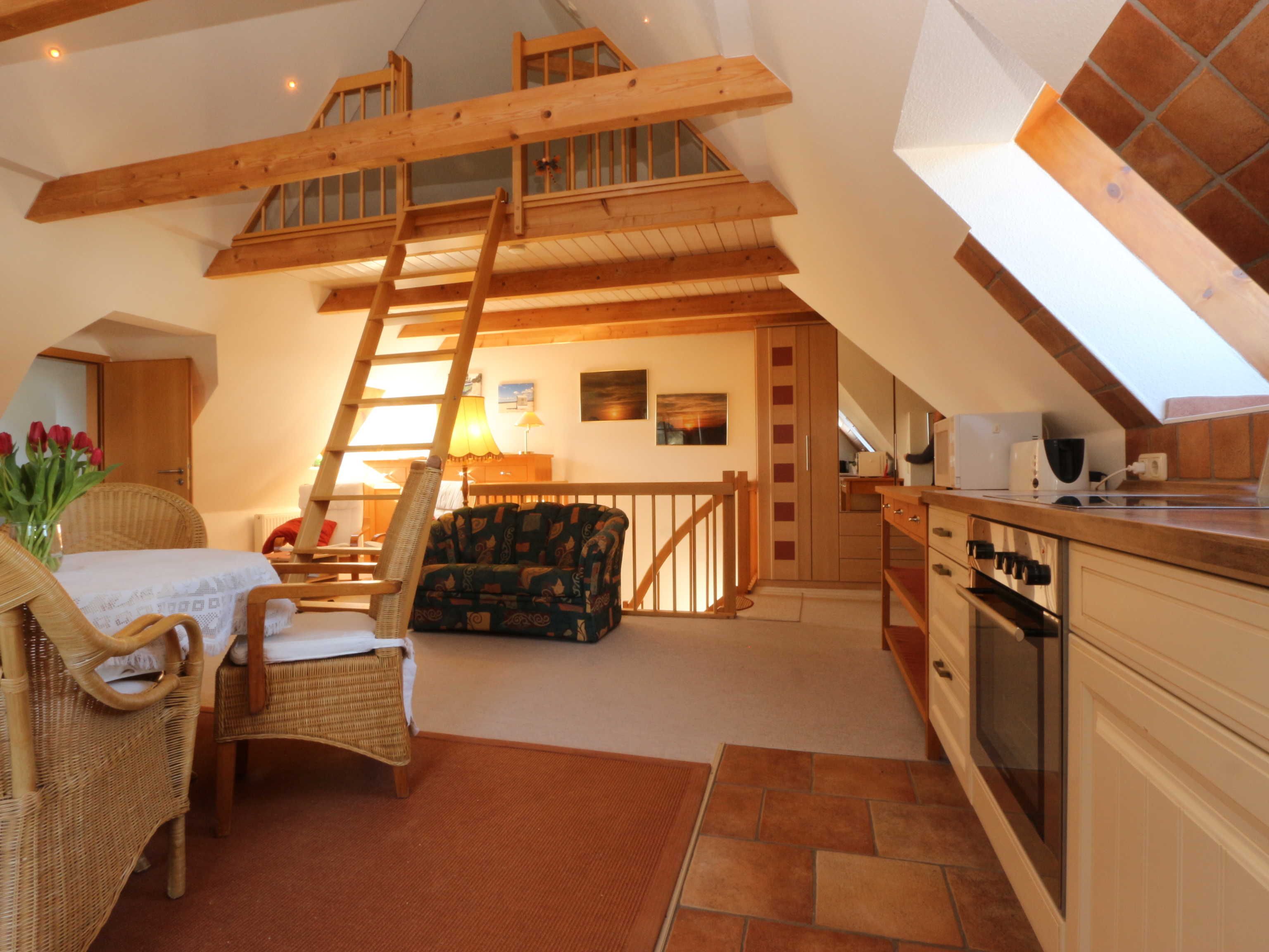 Zur Wohnung gehört eine Schlafzimmer, ein Bad mit Dusche, ein offener Schlafboden und ein Wohn- und Esszimmer mit Küchenzeile.