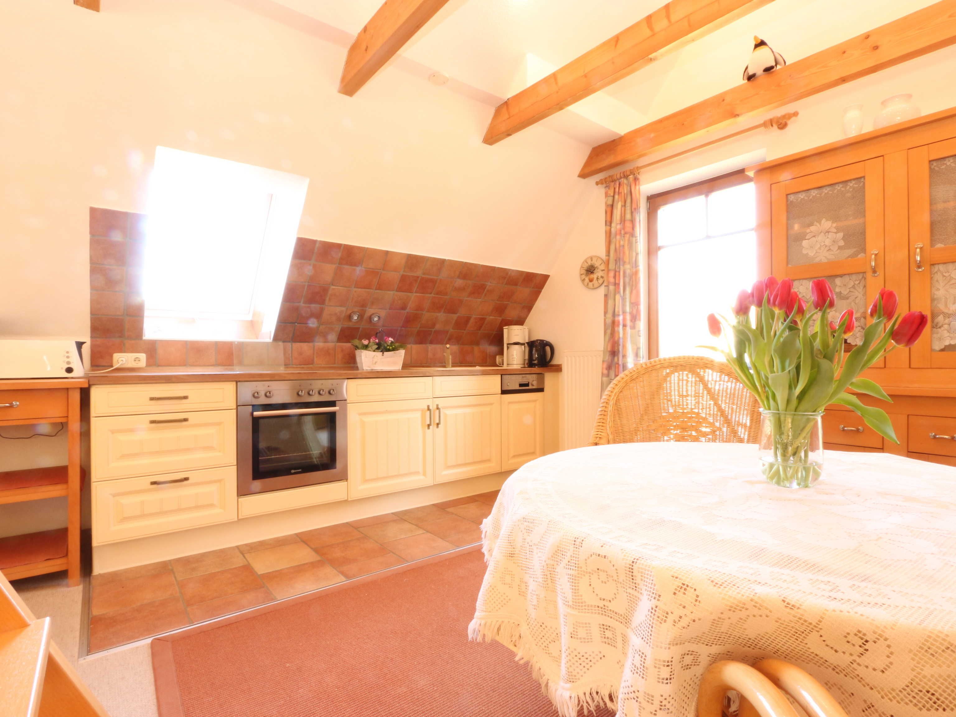 Die Küchenzeile ist mit Kühlschrank, Herd, Spülmaschine, Mikrowelle, Kaffeemaschine, Eierkocher, Toaster, Wasserkocher und reichlich Geschirr ausgestattet.