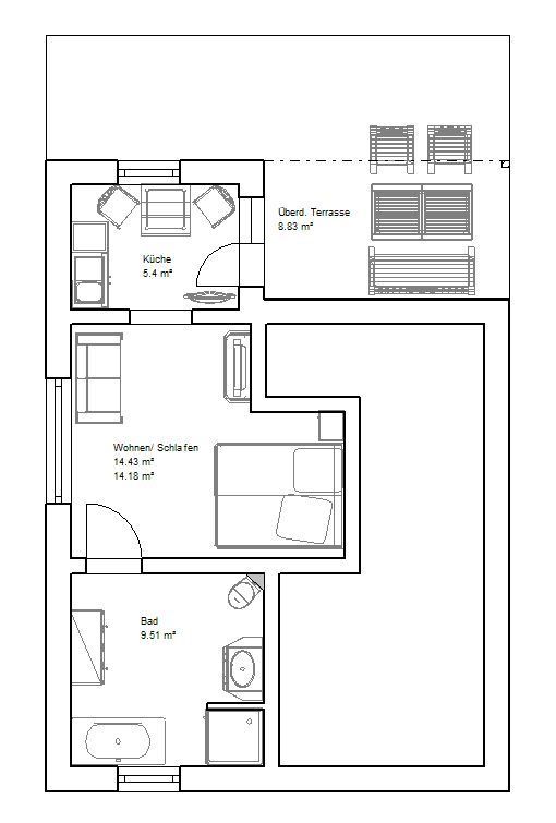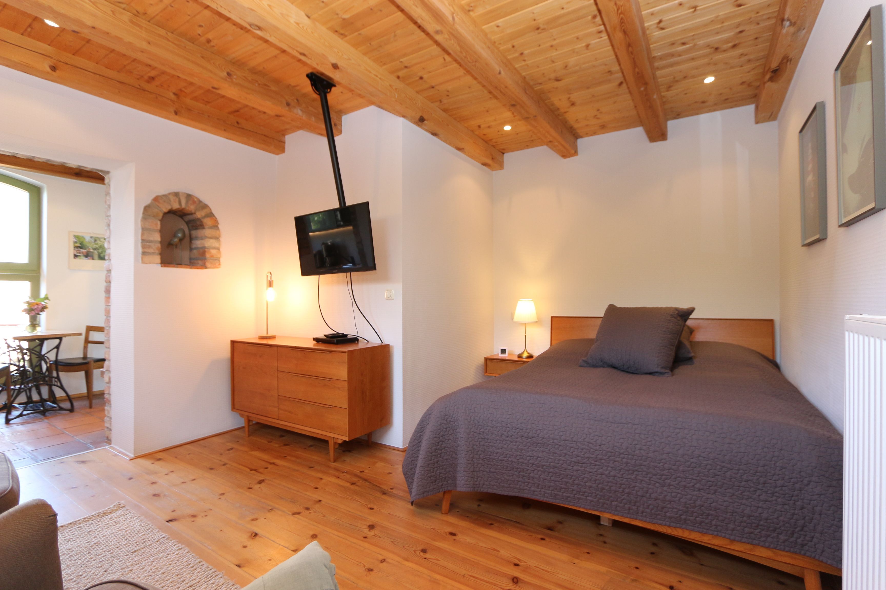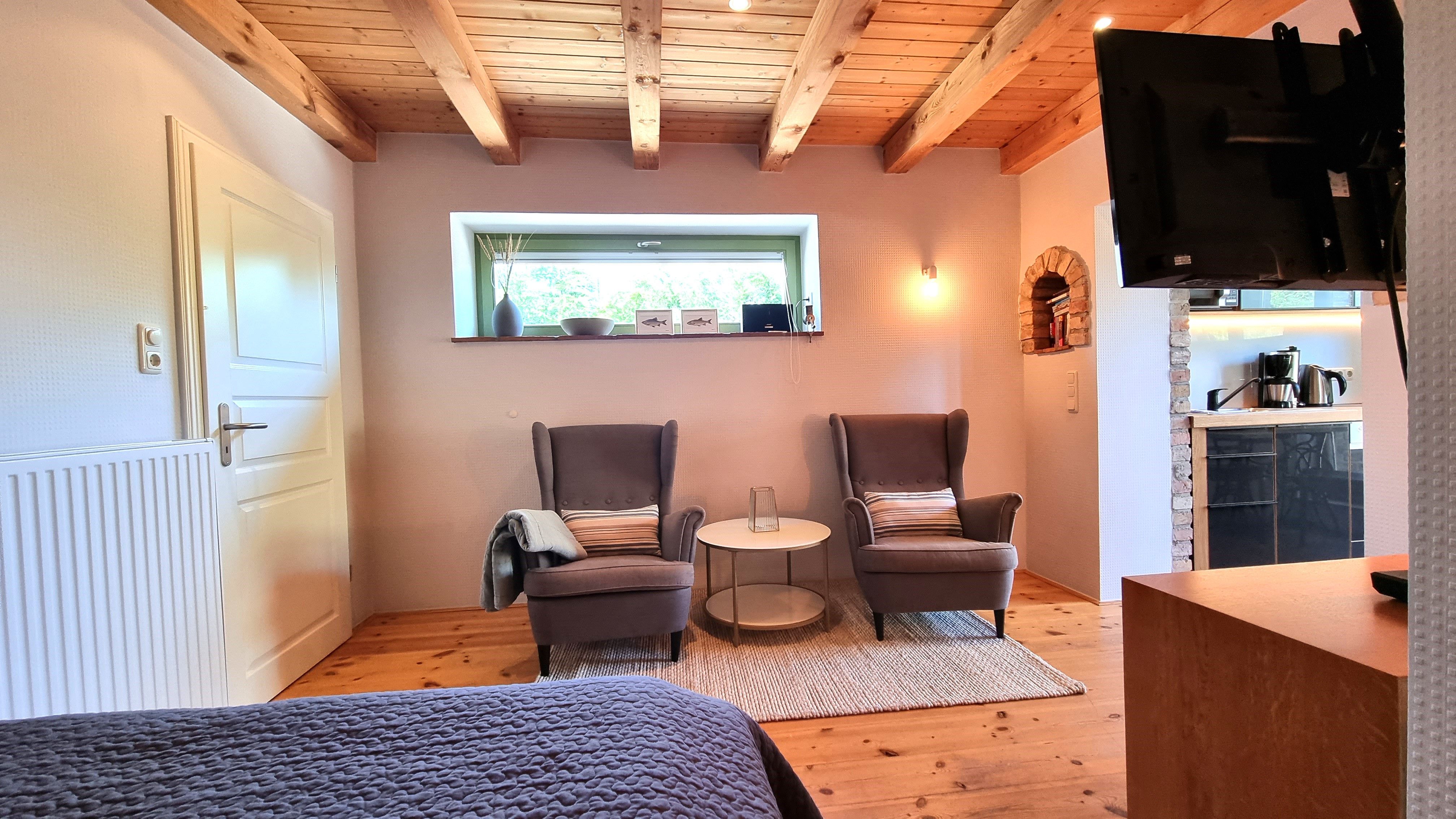 • 1 kombinierter Wohn- und Schlafraum mit einem Doppelbett (1,8 x 2,00m), zwei Sesseln und einem Flachbildfernseher
