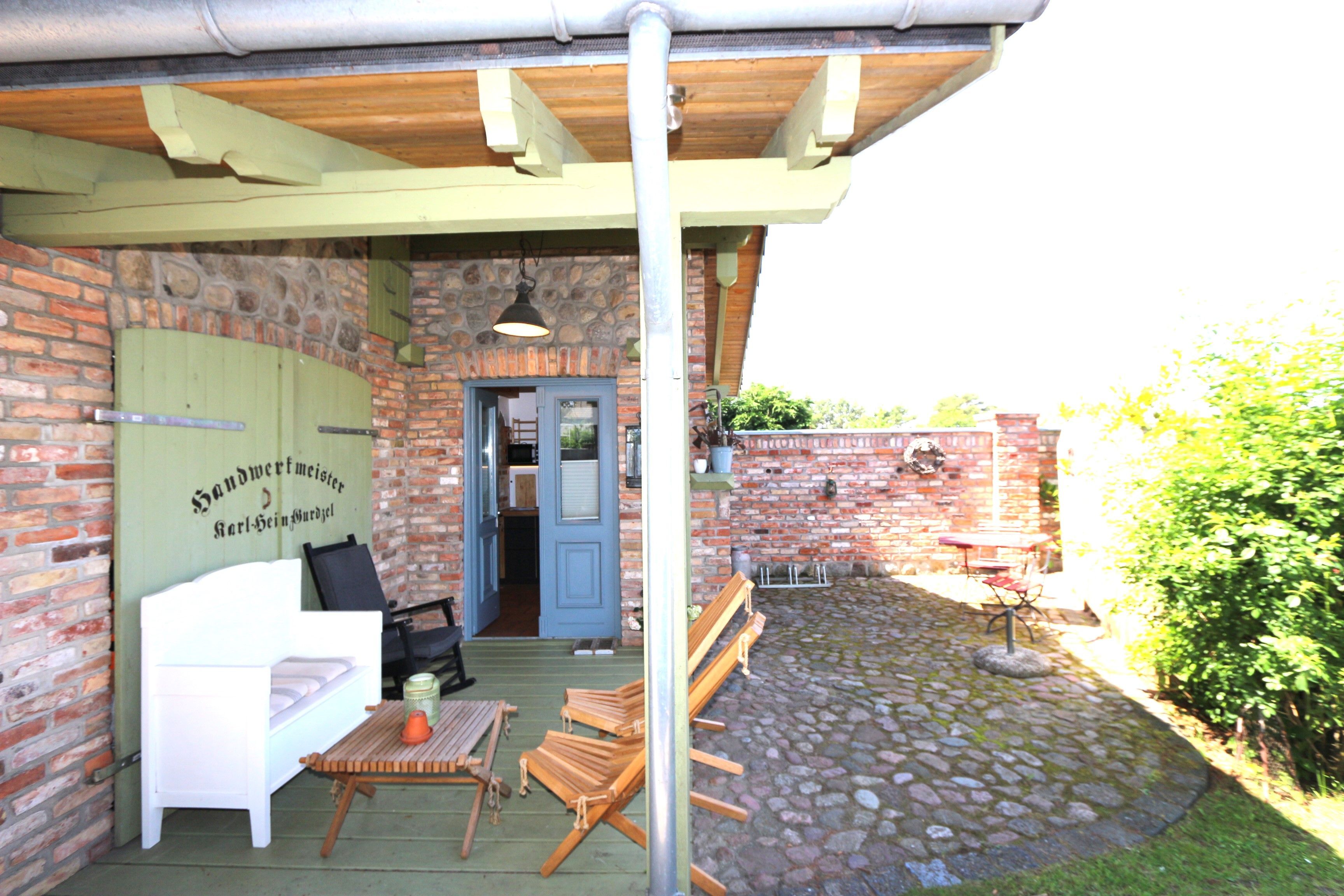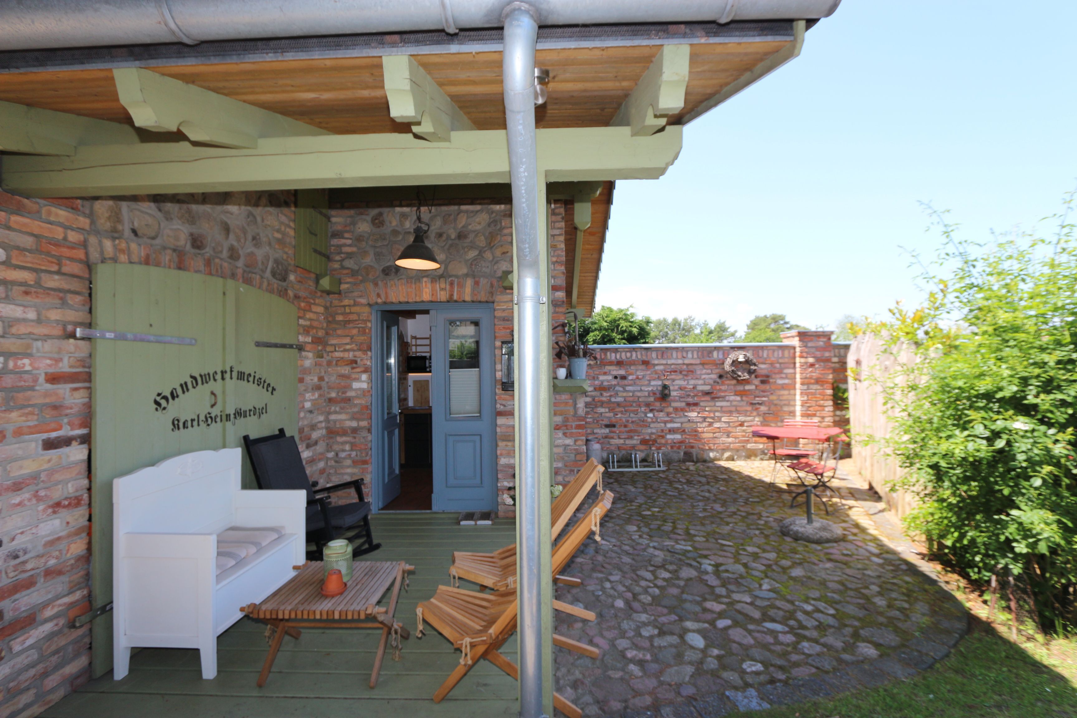 • 1 idyllische überdachter Sitzbereich (Terrasse) an der Küche mit Außenkamin, einem Tisch und Stühlen