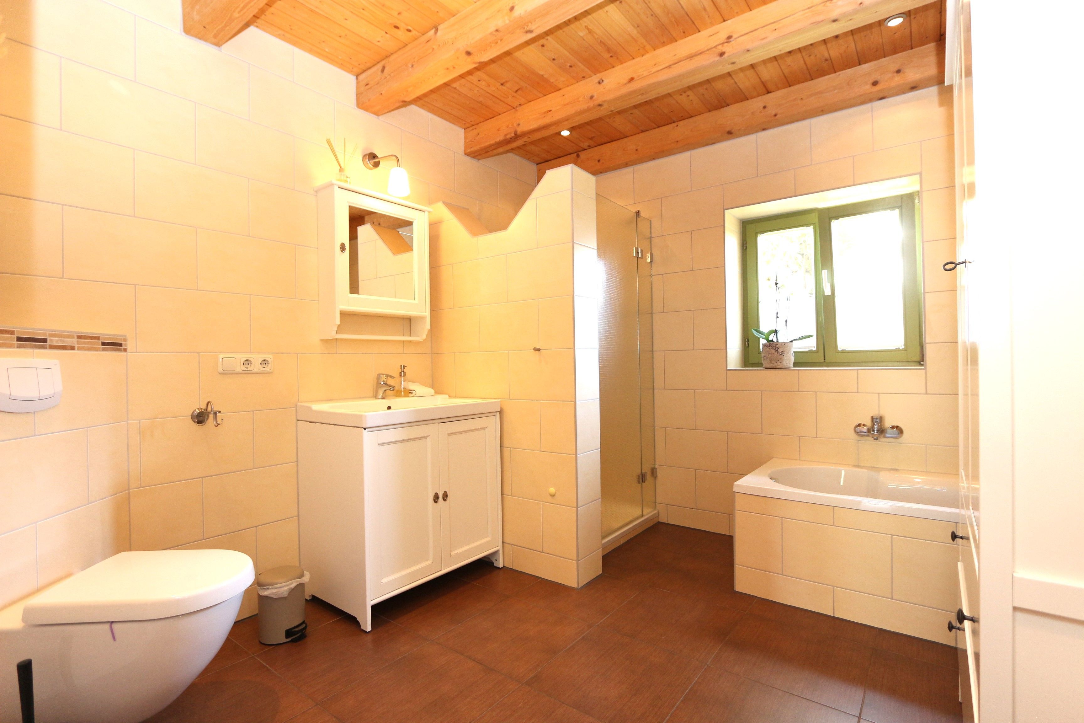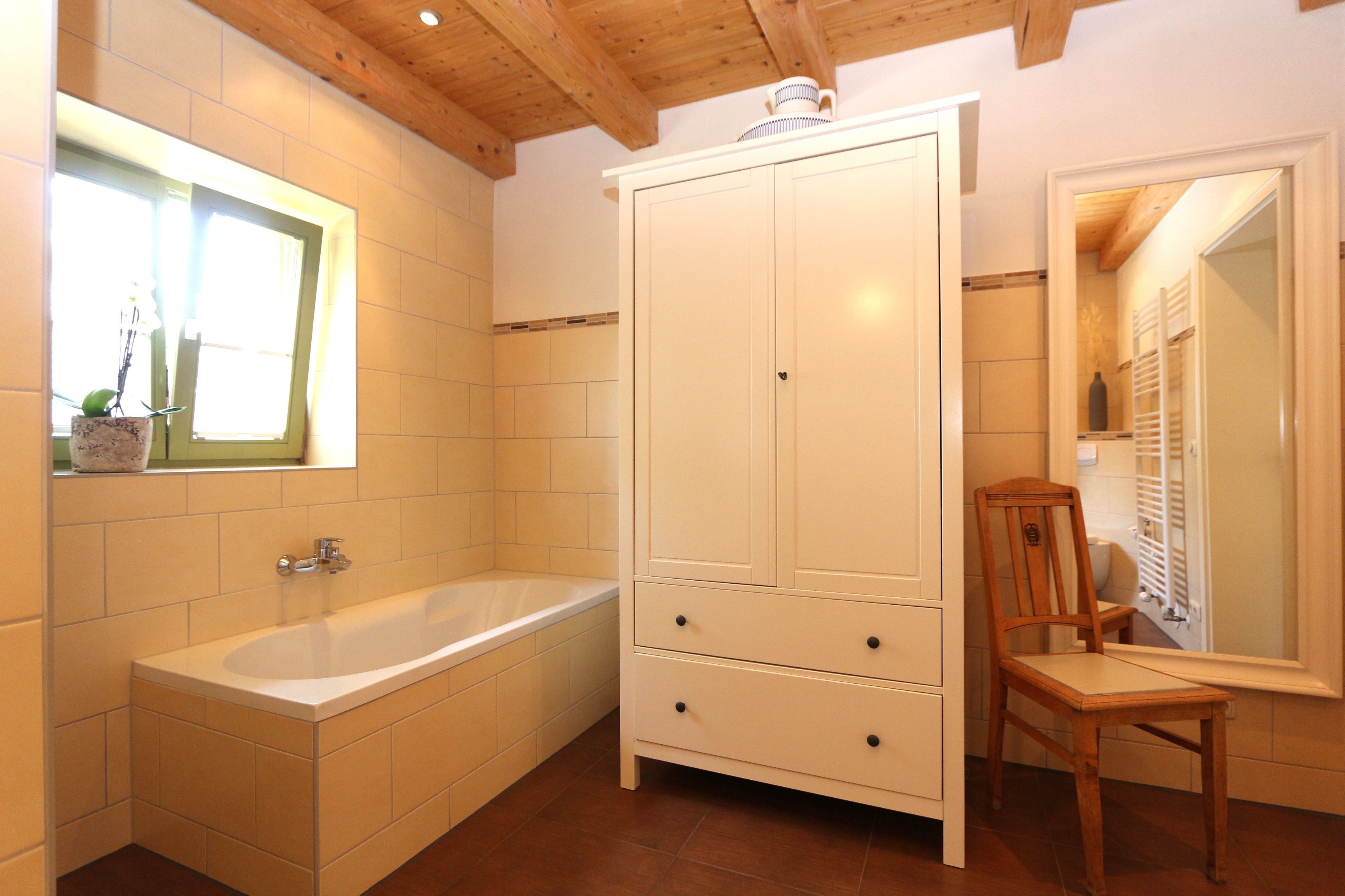 • Das Badezimmer verfügt über eine Dusche, eine Badewanne, ein Waschbecken, ein WC und einen Handtuchtrockenheizkörper