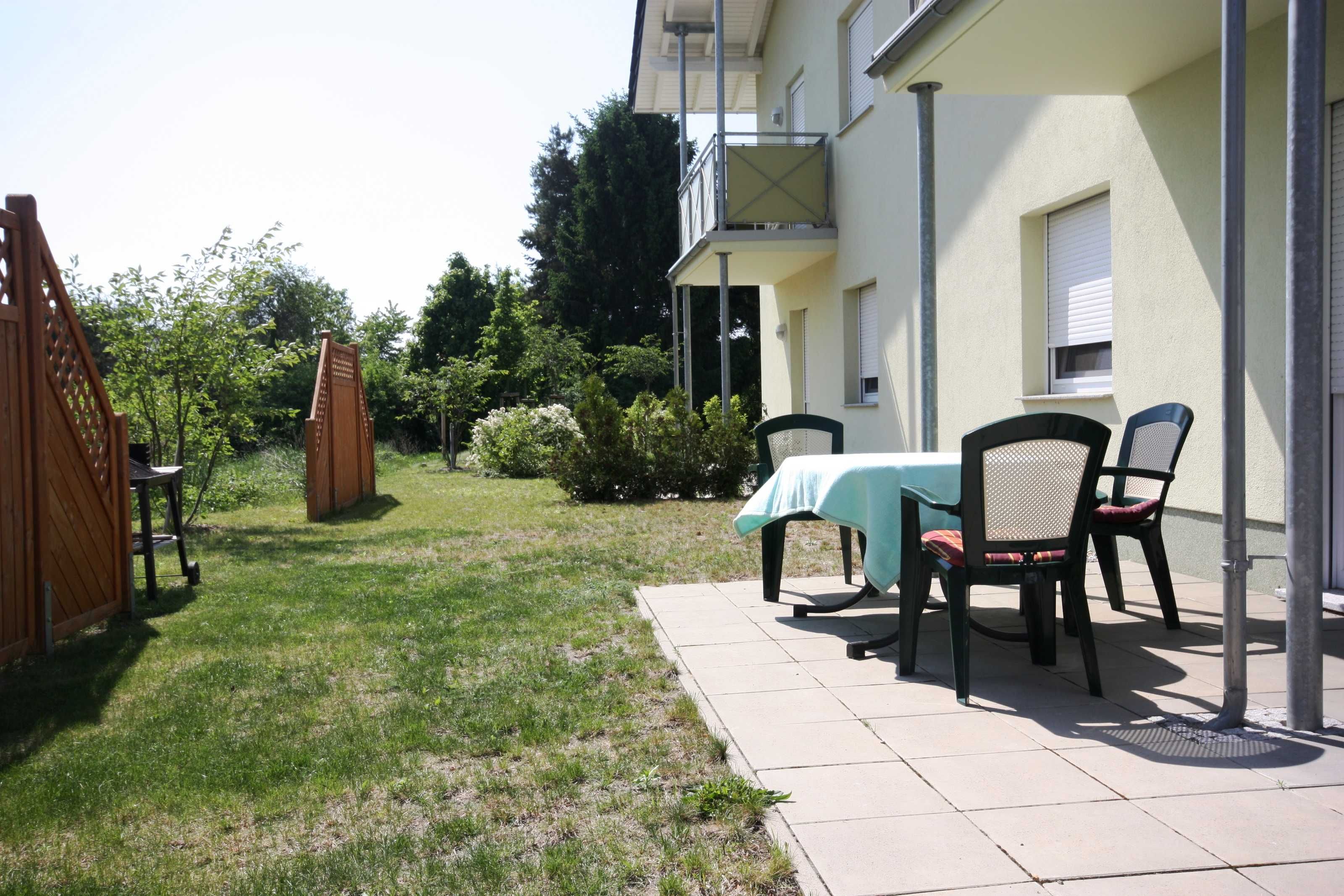 • Terrasse mit Tisch, Stuhl, Sonnenschirm