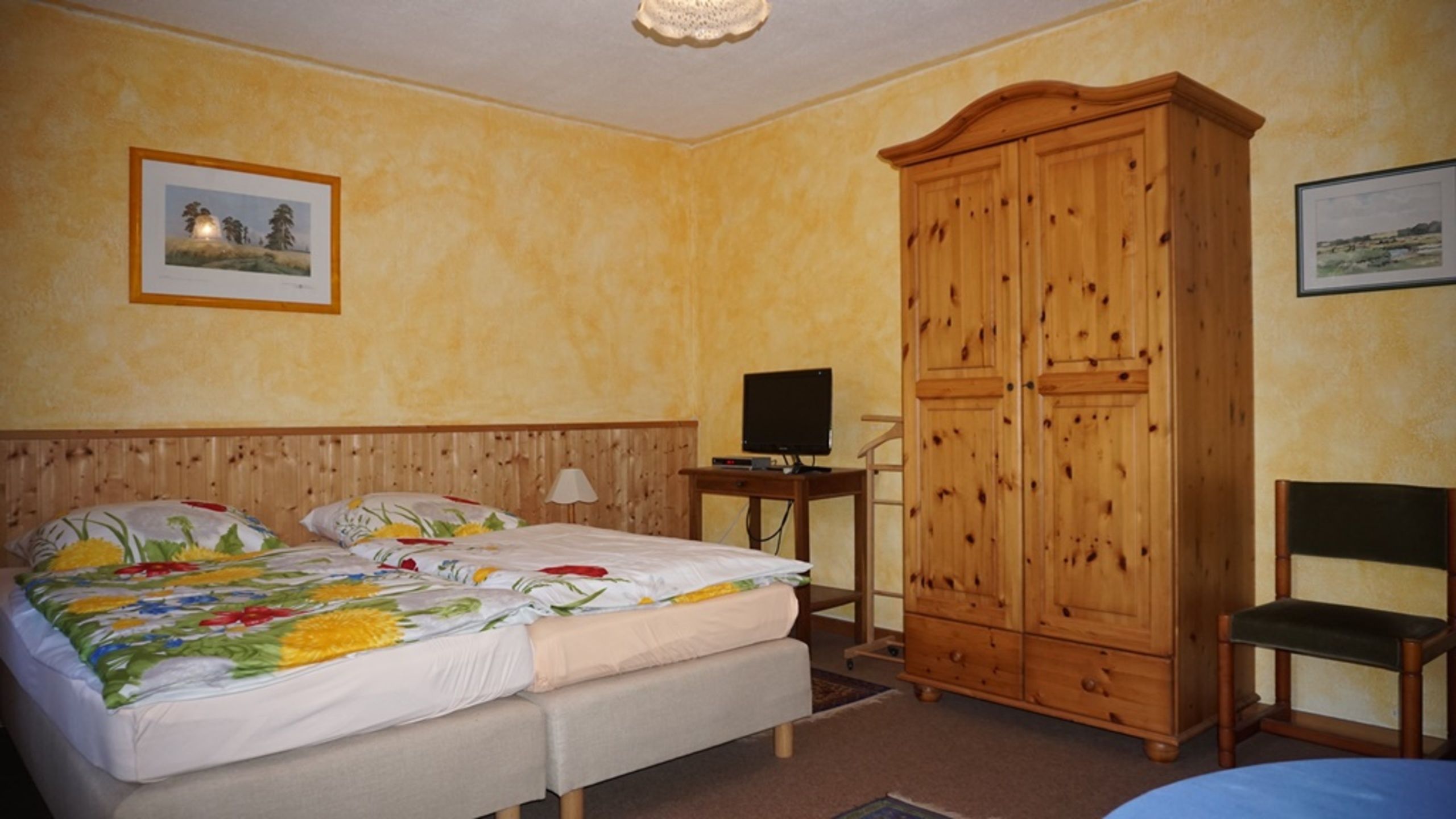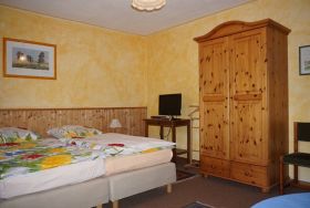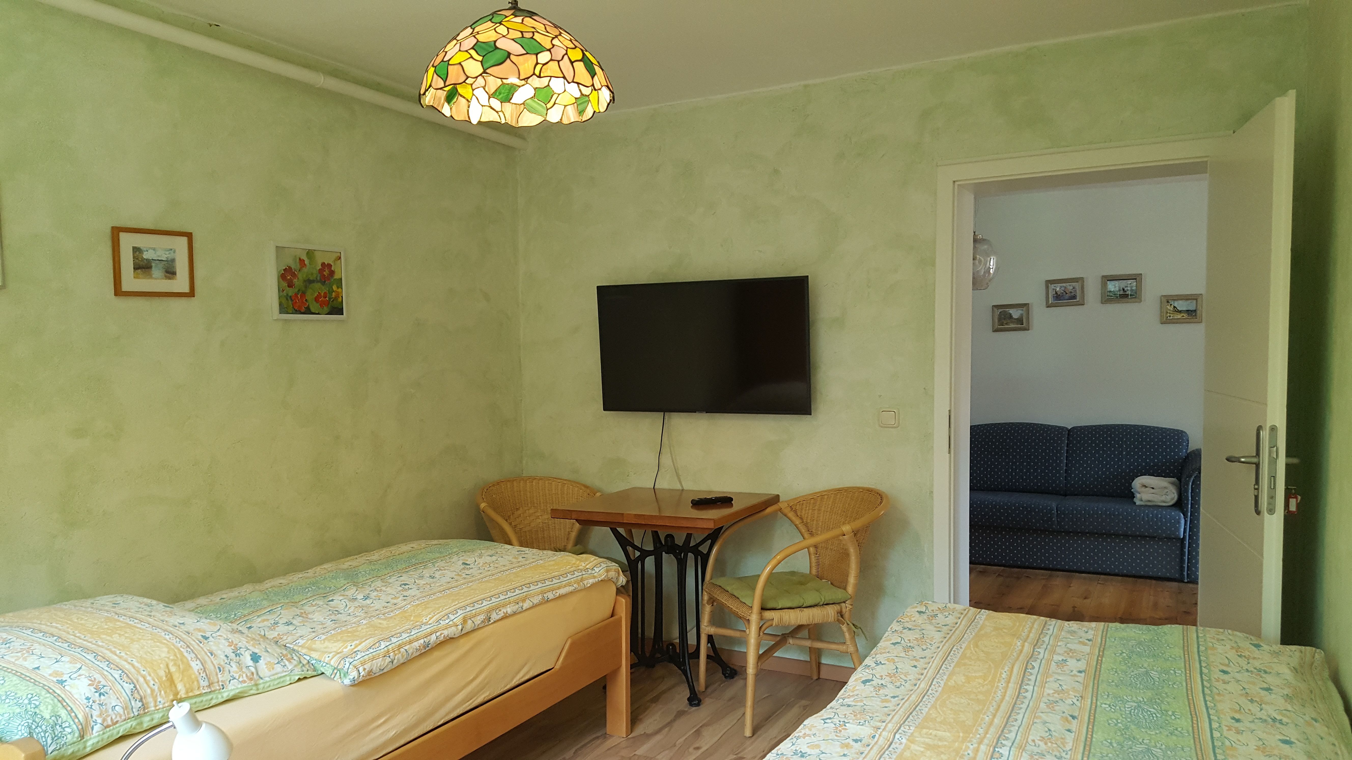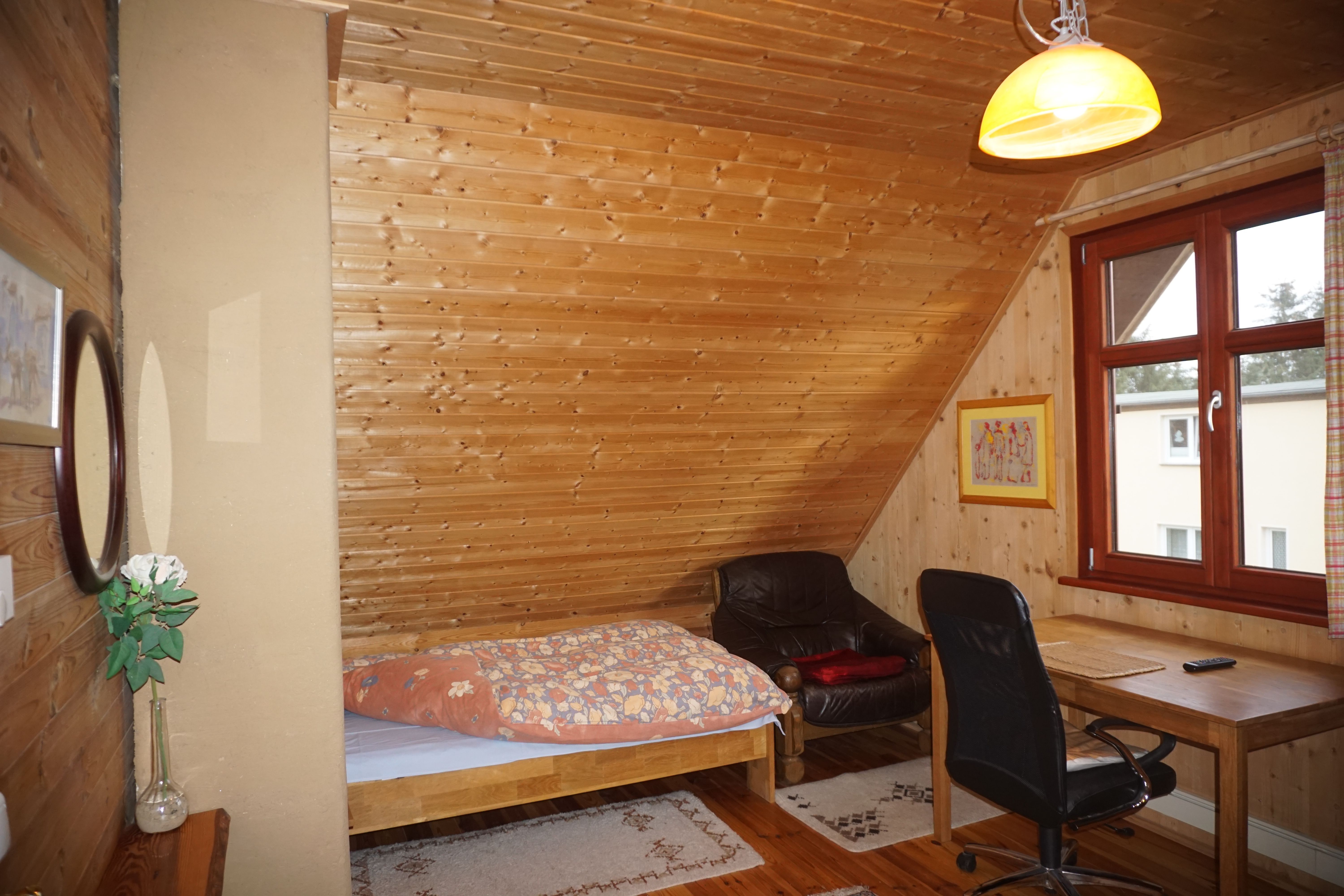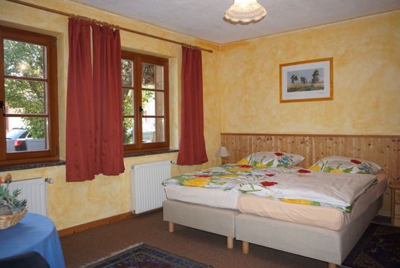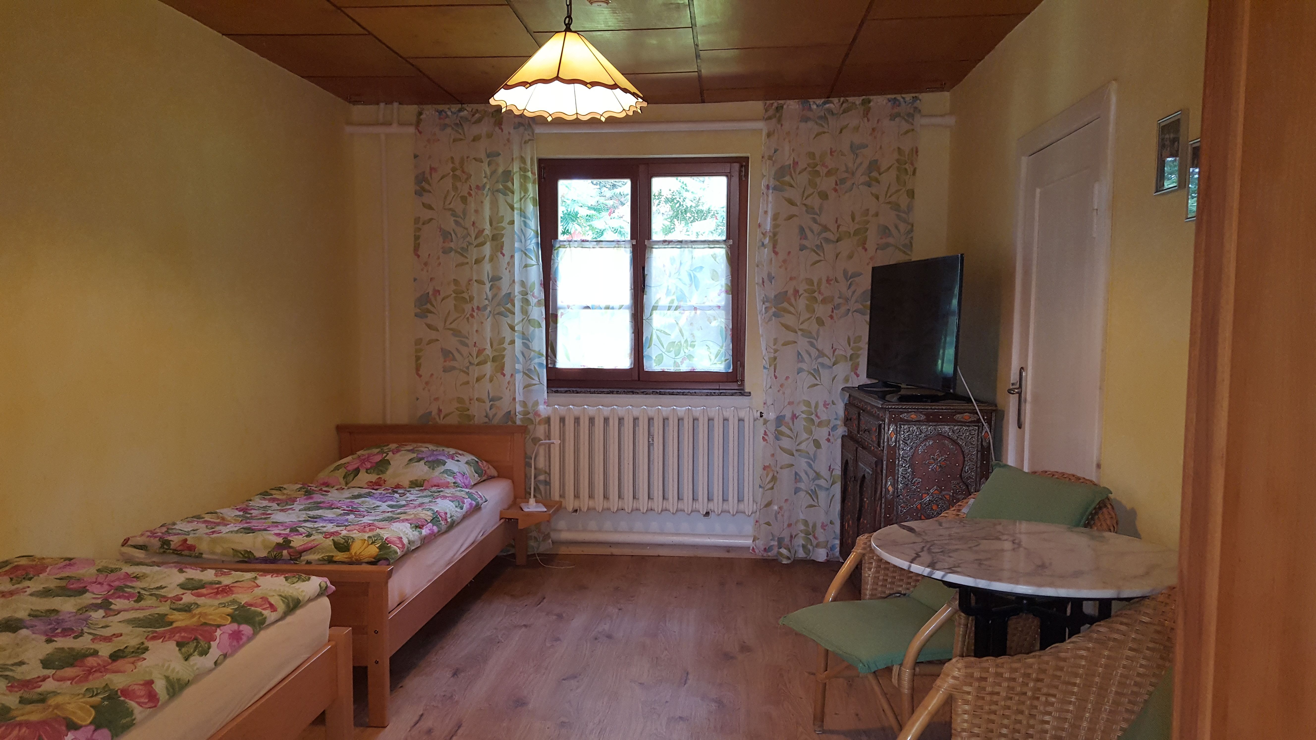 Das Zweibettzimmer befindet sich im Kleinen Steinhaus (Baujahr 1995; Komplettsanierung 2022) und ist ganz individuell mit Holzmöbeln ausgestattet. Zwei Fenster zum Hof geben Ausblick auf einen ehemaligen Bauernhof. Es ist ausgestattet mit TV, Bettwäsche und Handtüchern. Das Bad mit Dusche und WC befindet sich in einem separaten Raum und wird gegebenenfalls mit einem Gast in einem Einzelzimmer gemeinsam genutzt. Die Küche wird von allen Gästen genutzt. Ein Reisekinderbett (10,- Euro) und ein Kinderhochstuhl (3,- Euro) wird Ihnen auf Anfrage zur Verfügung gestellt.