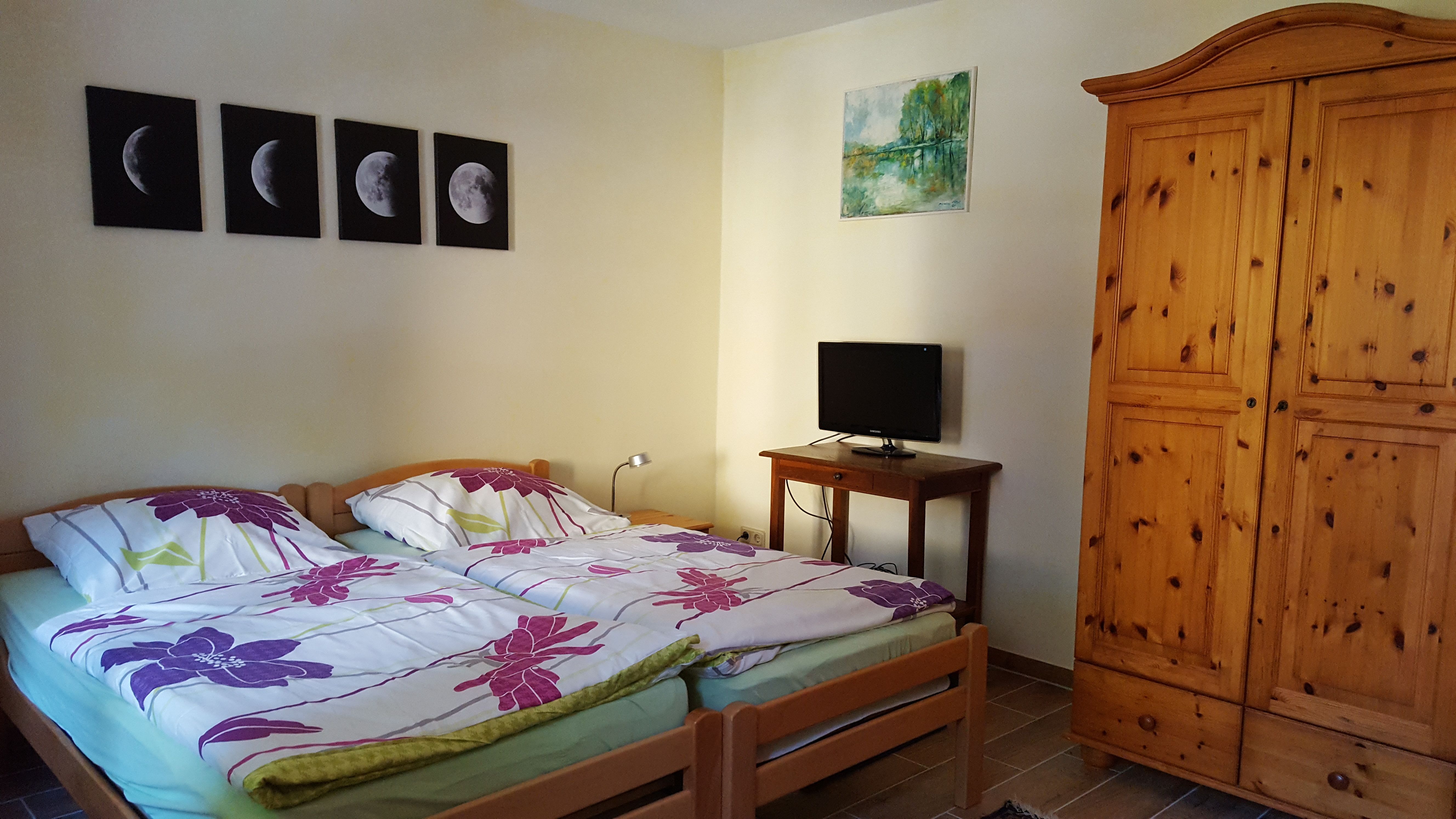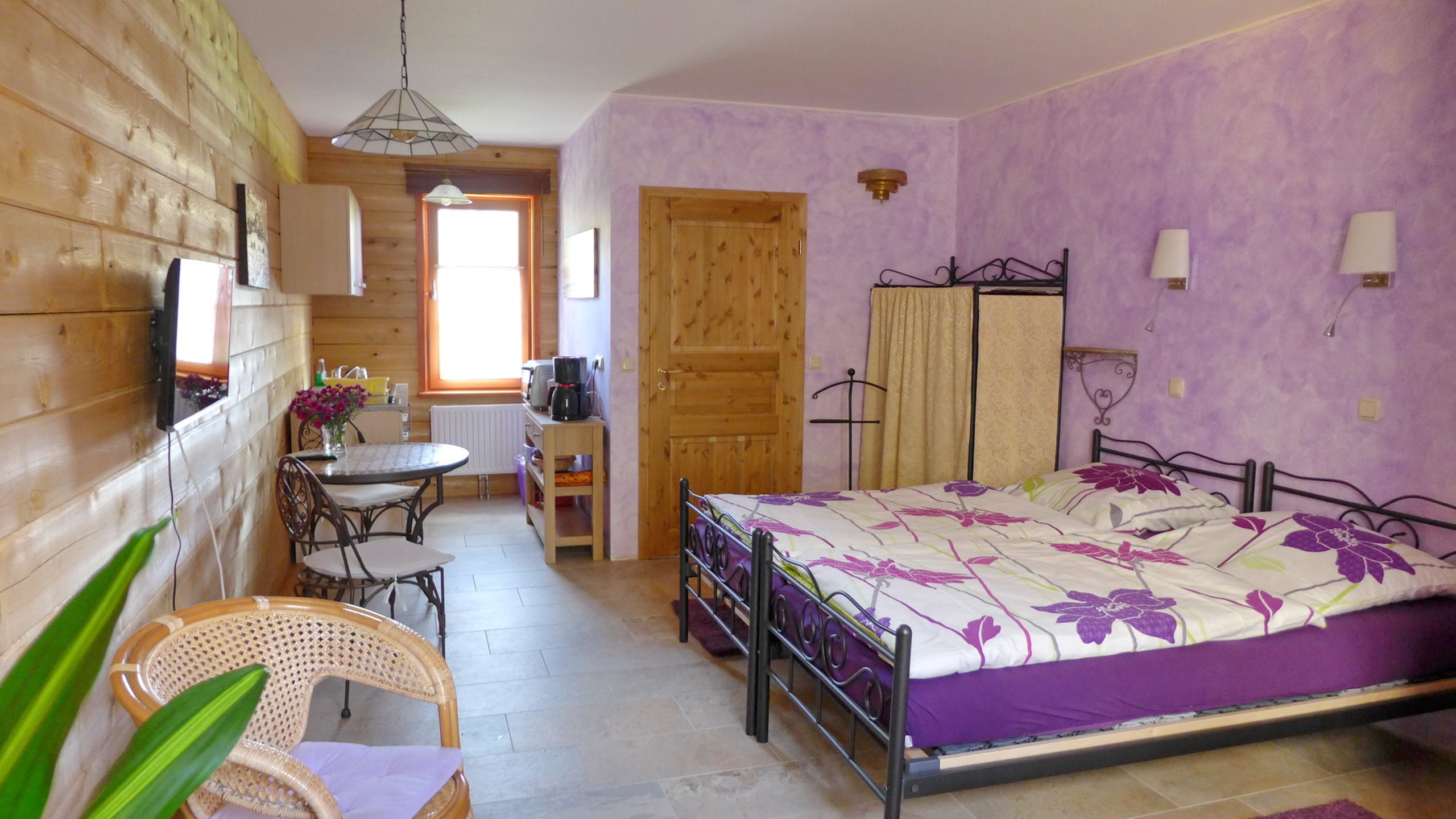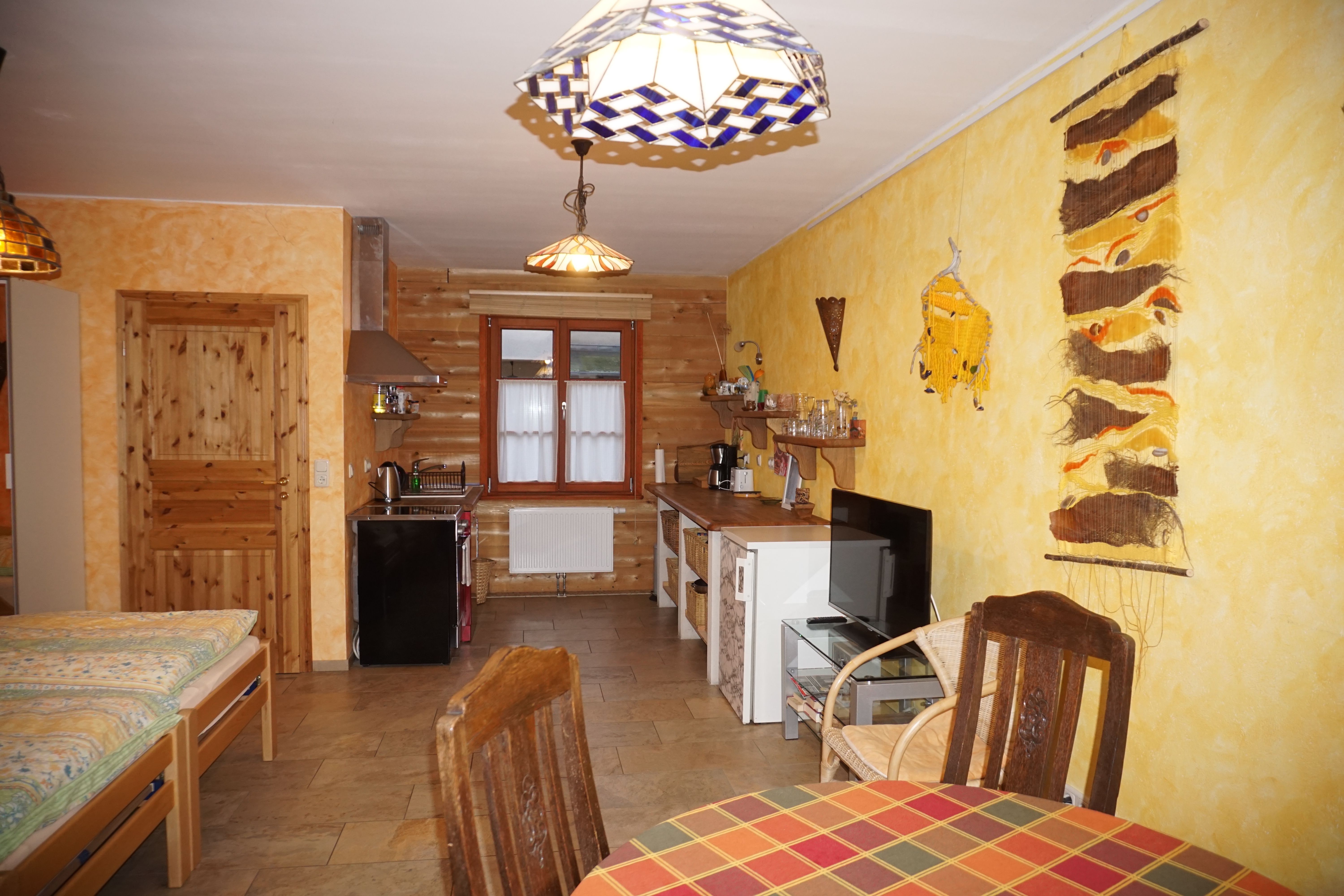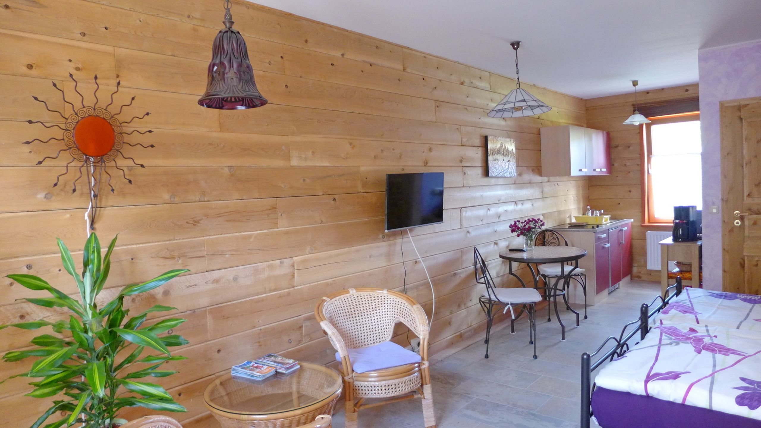 Das Zweibettzimmer Anna befindet sich im Zedernblockhaus (Baujahr 2006). Eingerichtet ist es mit zwei Einzelbetten, die je nach Bedarf beisammen oder getrennt stehen können, einer Sitzecke, einem Esstisch mit Stühlen und einem Flachbildfernseher. Eine Miniküche mit Kühlschrank, 2 Cerankochfeldern, Wasserkocher, Kaffeemaschine, Toaster und Minibackofen ist ebenfalls integriert. Das Bad ist mit ebenerdiger Dusche und Duschvorhang, Waschtisch und WC ausgestattet. Ein Reisekinderbett (10,- Euro) und ein Kinderhochstuhl (3,- Euro) wird Ihnen auf Anfrage zur Verfügung gestellt.