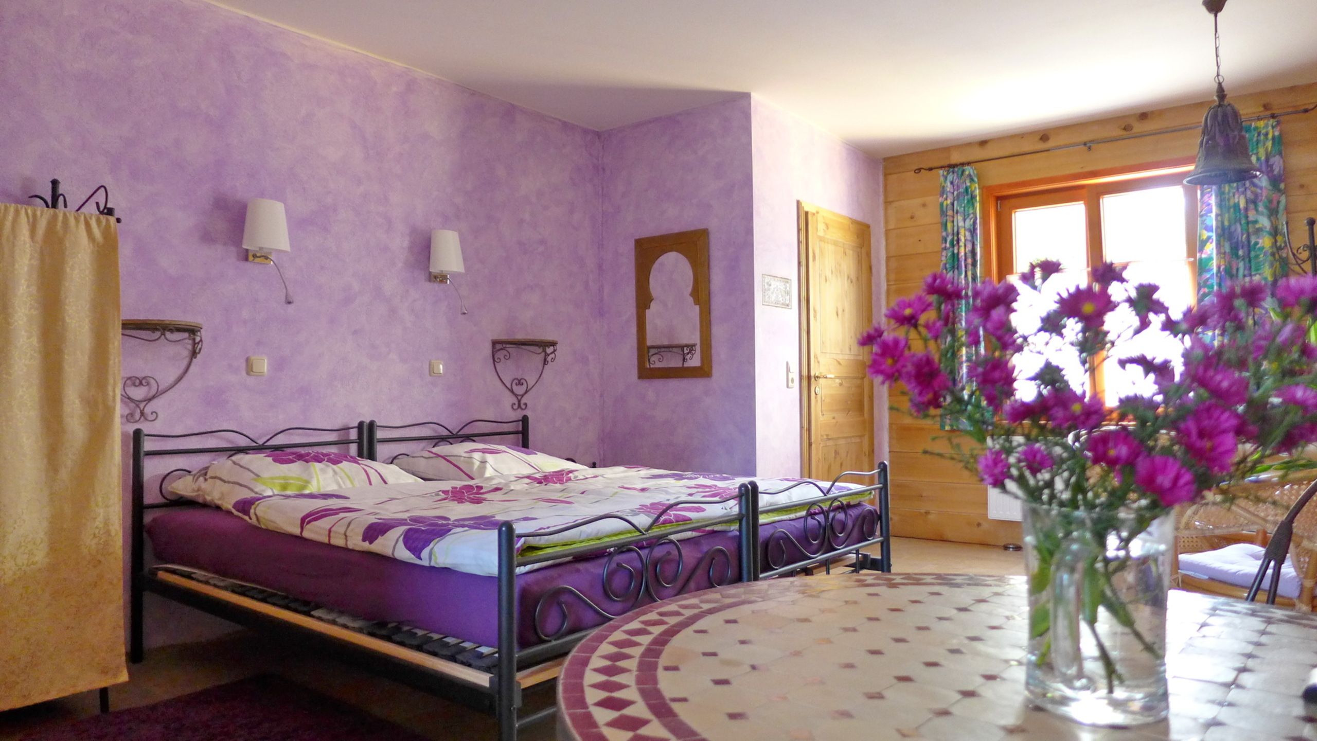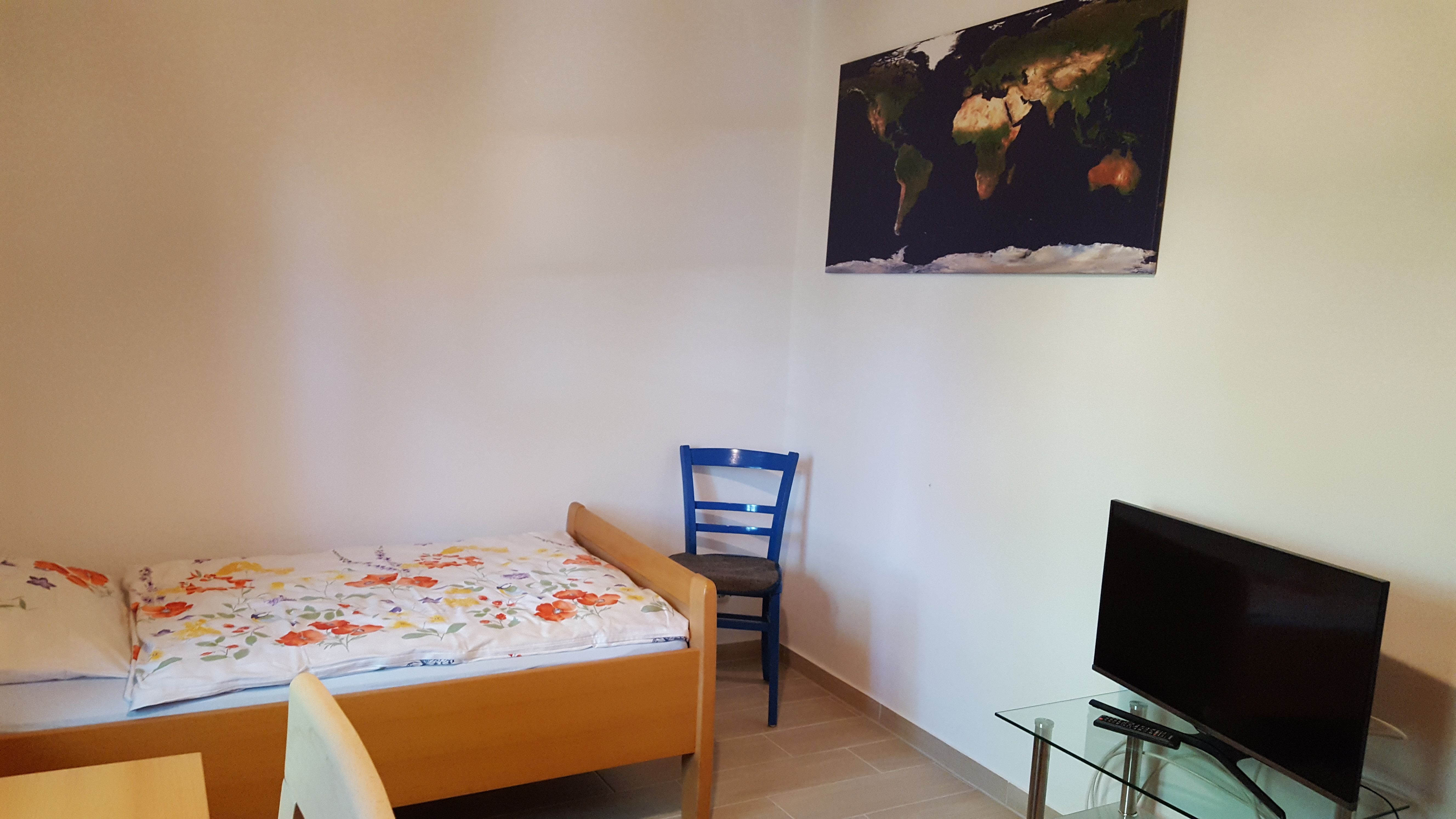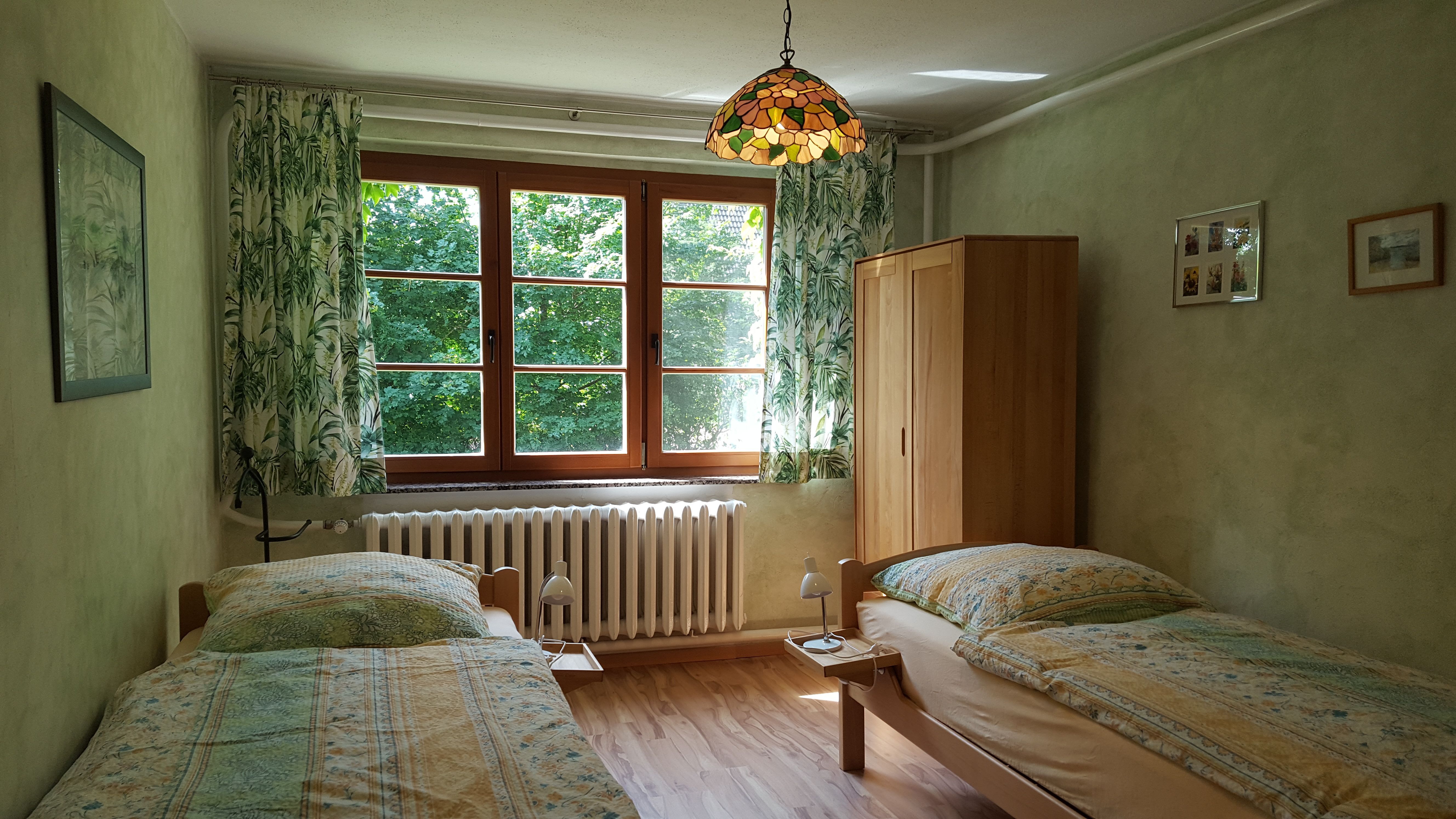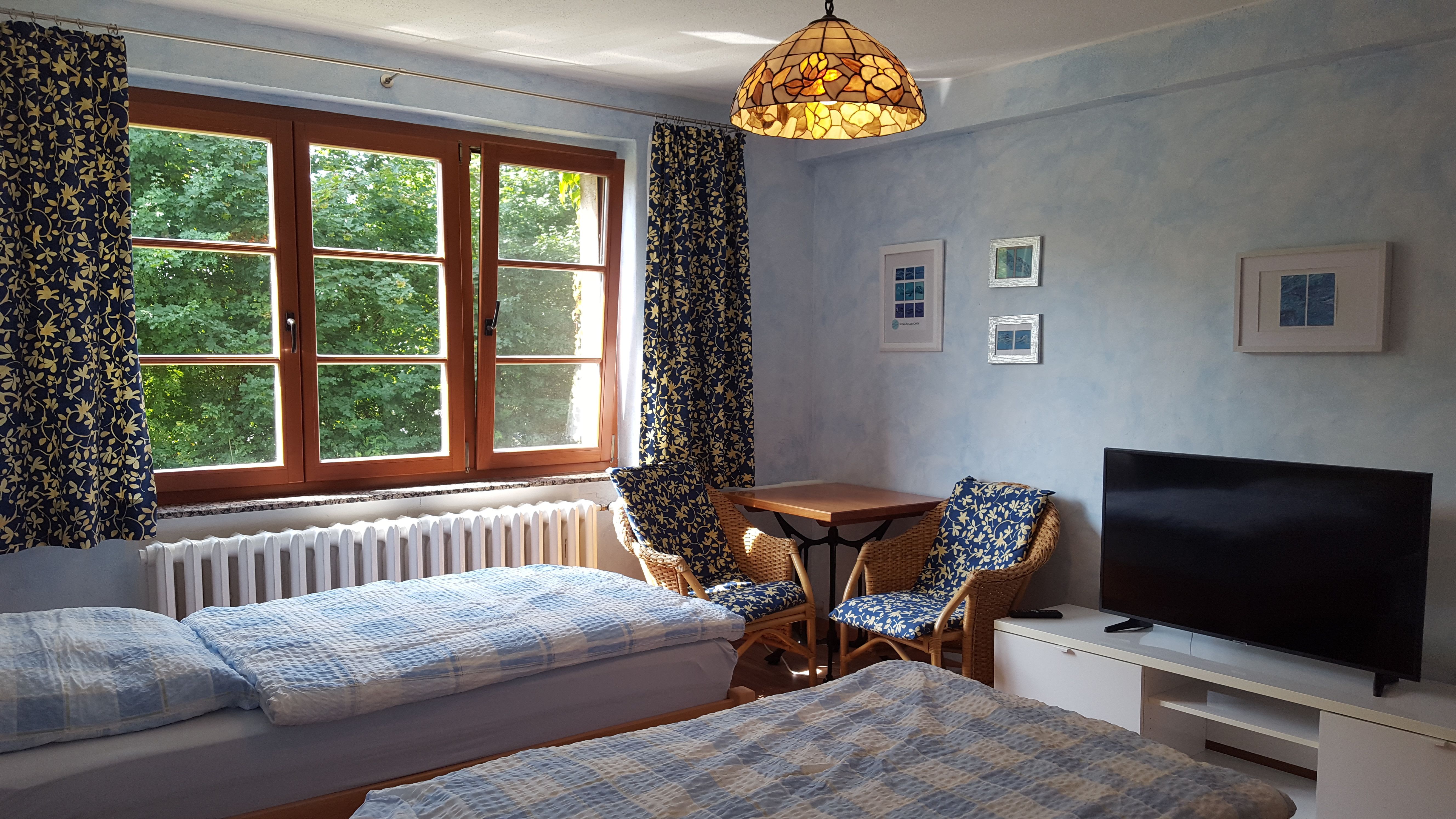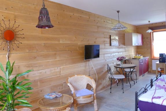 Das Zweibettzimmer Anna befindet sich im Zedernblockhaus (Baujahr 2006). Eingerichtet ist es mit zwei Einzelbetten, die je nach Bedarf beisammen oder getrennt stehen können, einer Sitzecke, einem Esstisch mit Stühlen und einem Flachbildfernseher. Eine Miniküche mit Kühlschrank, 2 Cerankochfeldern, Wasserkocher, Kaffeemaschine, Toaster und Minibackofen ist ebenfalls integriert. Das Bad ist mit ebenerdiger Dusche und Duschvorhang, Waschtisch und WC ausgestattet. Ein Reisekinderbett (10,- Euro) und ein Kinderhochstuhl (3,- Euro) wird Ihnen auf Anfrage zur Verfügung gestellt.