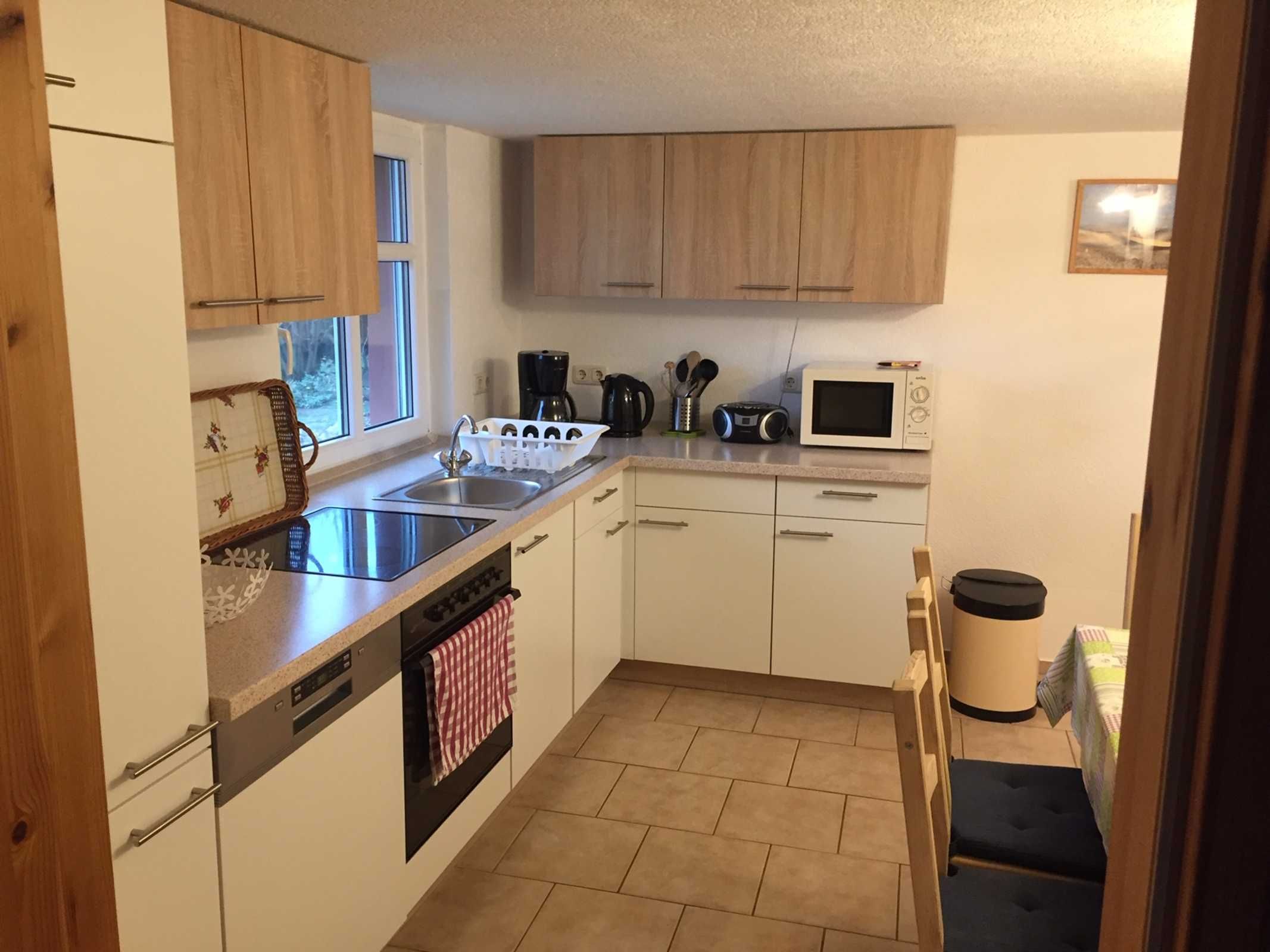 Im Untergeschoß befindet sich ein Wohnzimmer mit Kaminofen, ein Bad mit DU/WC und eine komplett eingerichtete Küche mit Geschirrspüler, Herd mit Ceranfeld, Backofen, Wasserkocher, Kaffeemaschine, Mikrowelle und Radio. In der Küche ist auch ein Eßtisch mit Stühlen vorhanden.