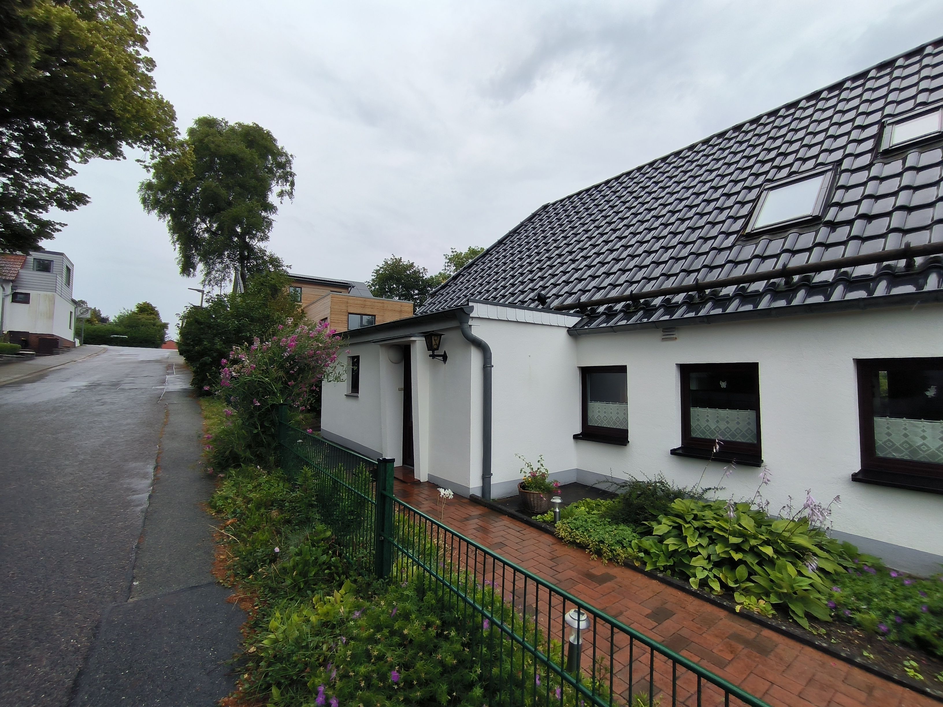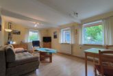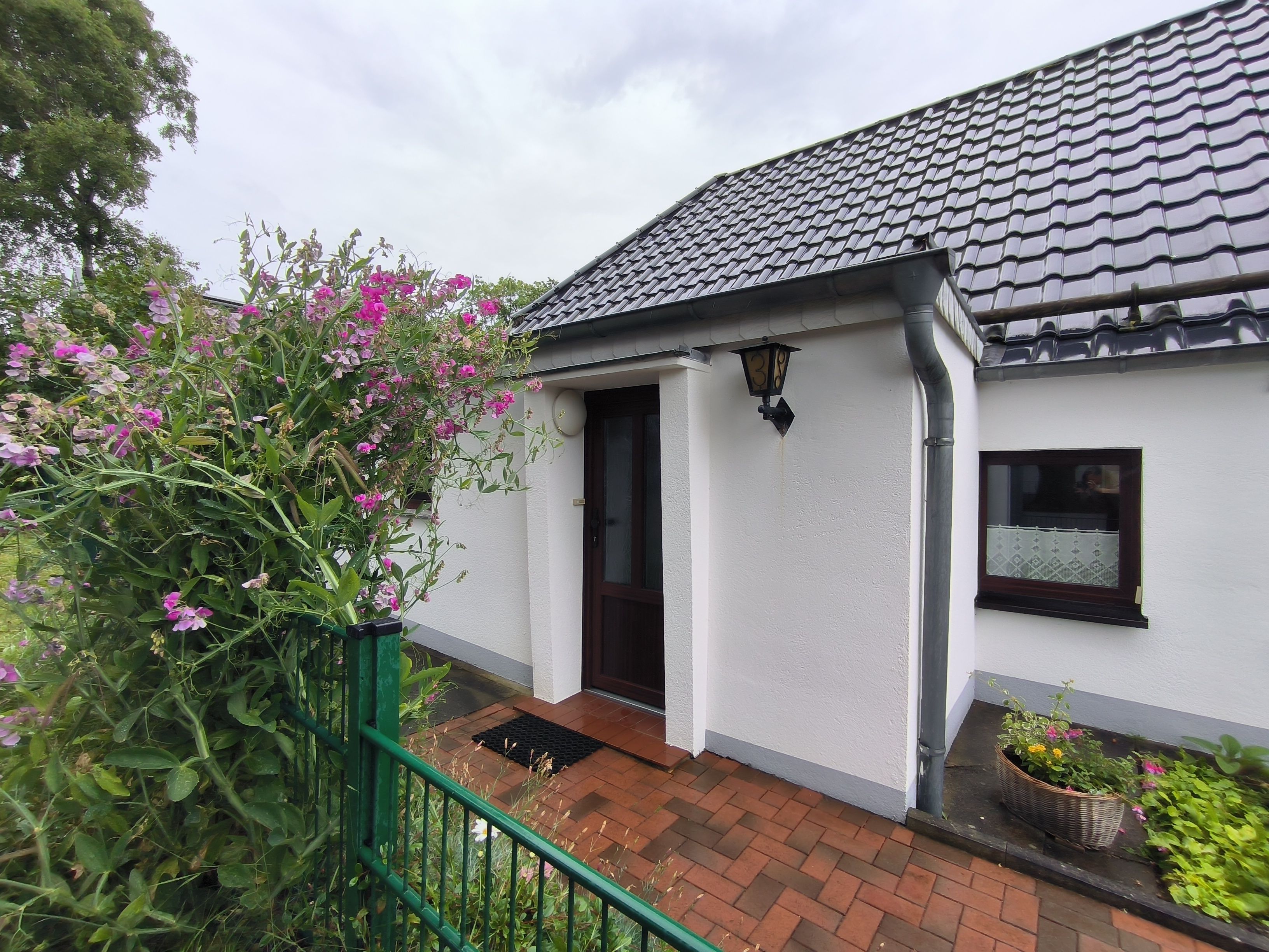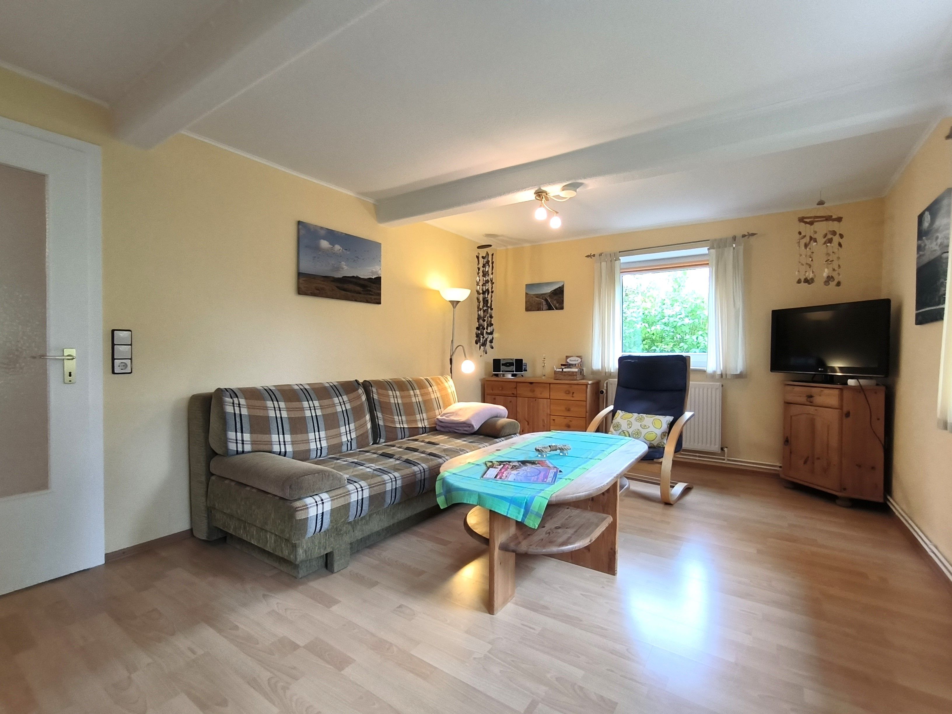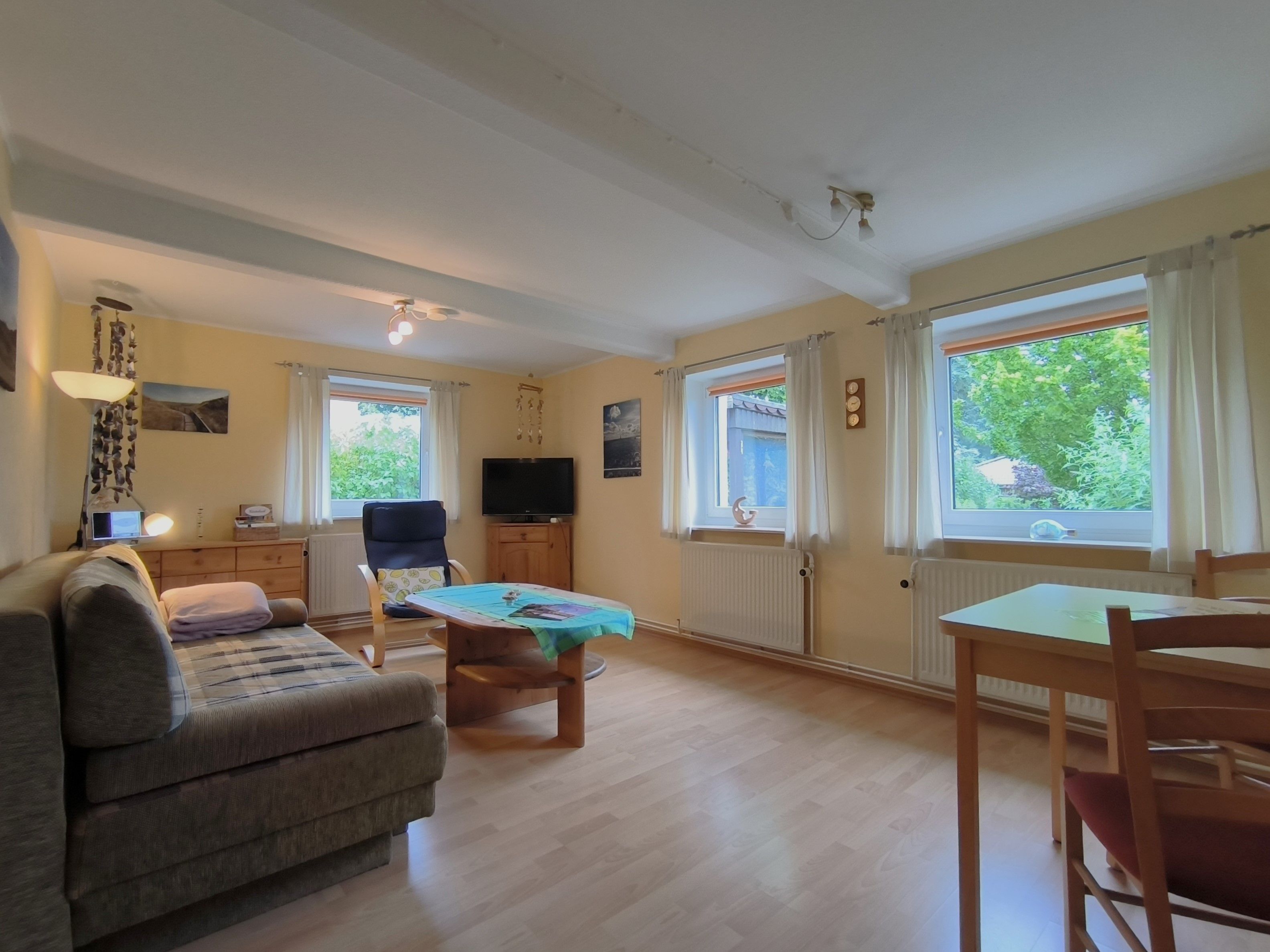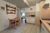 Im Eingangsbereich der Wohnung geht vom kleinen Flur das moderne Badezimmer mit Toilette, Waschbecken und Dusche und Fenster ab. Vom Flur weiter geradeaus geht es in die gut ausgestattete Küche (Kochfeld, Backofen, Wasserkocher, Kaffeemaschine) mit Esstisch und Stühlen. Von der Küche gehen das Schlafzimmer und das Wohnzimmer ab. Im Schlafzimmer gibt es ein Doppelbett (zwei zusammengestellte Betten) und einen großen Kleiderschrank. Das Wohnzimmer ist mit Sofa, Lesesessel, TV und noch einem kleinen Tisch ausgestattet. Zur Ferienwohnung gehört eine kleine Gartenlaube hinter dem Haus und mit Blick in den hübschen Garten: hier können sie windgeschützt und trocken sitzen.
