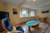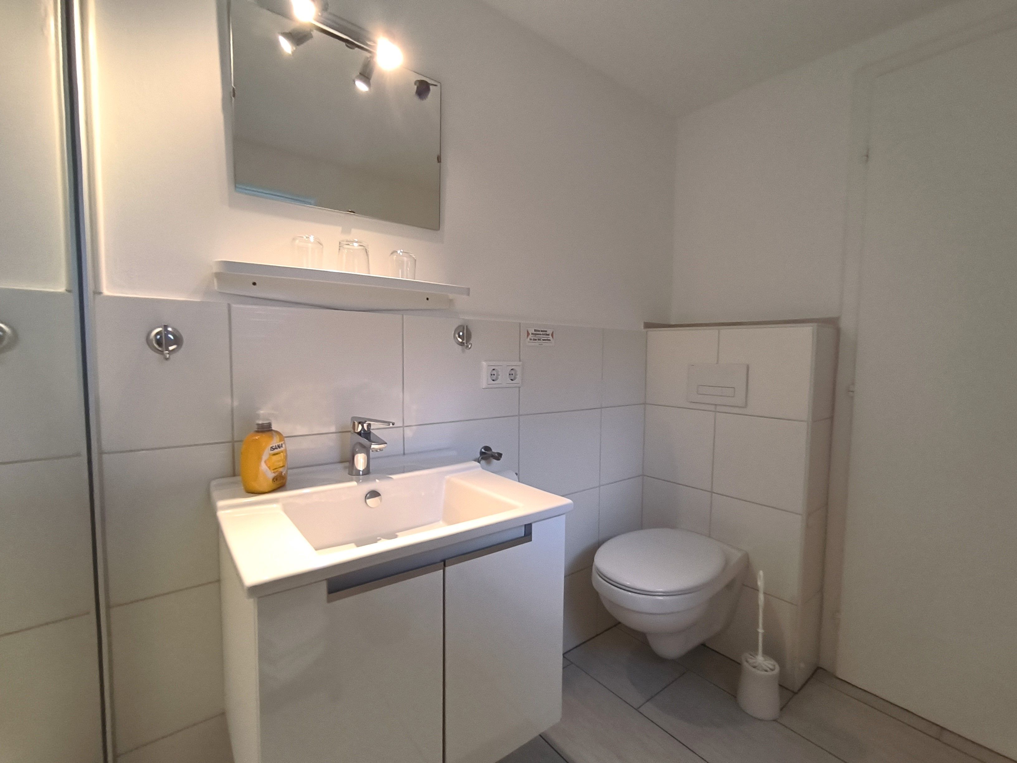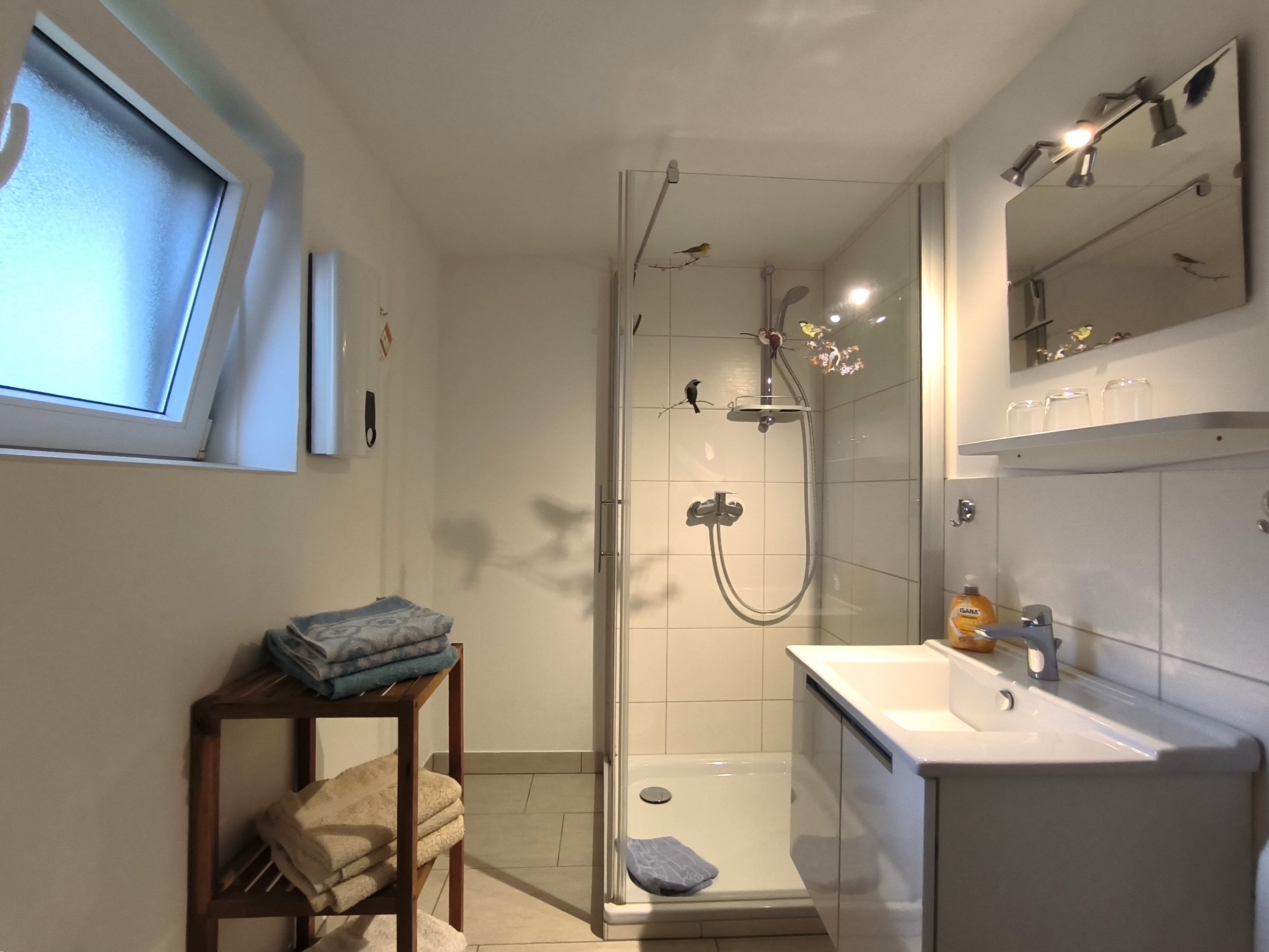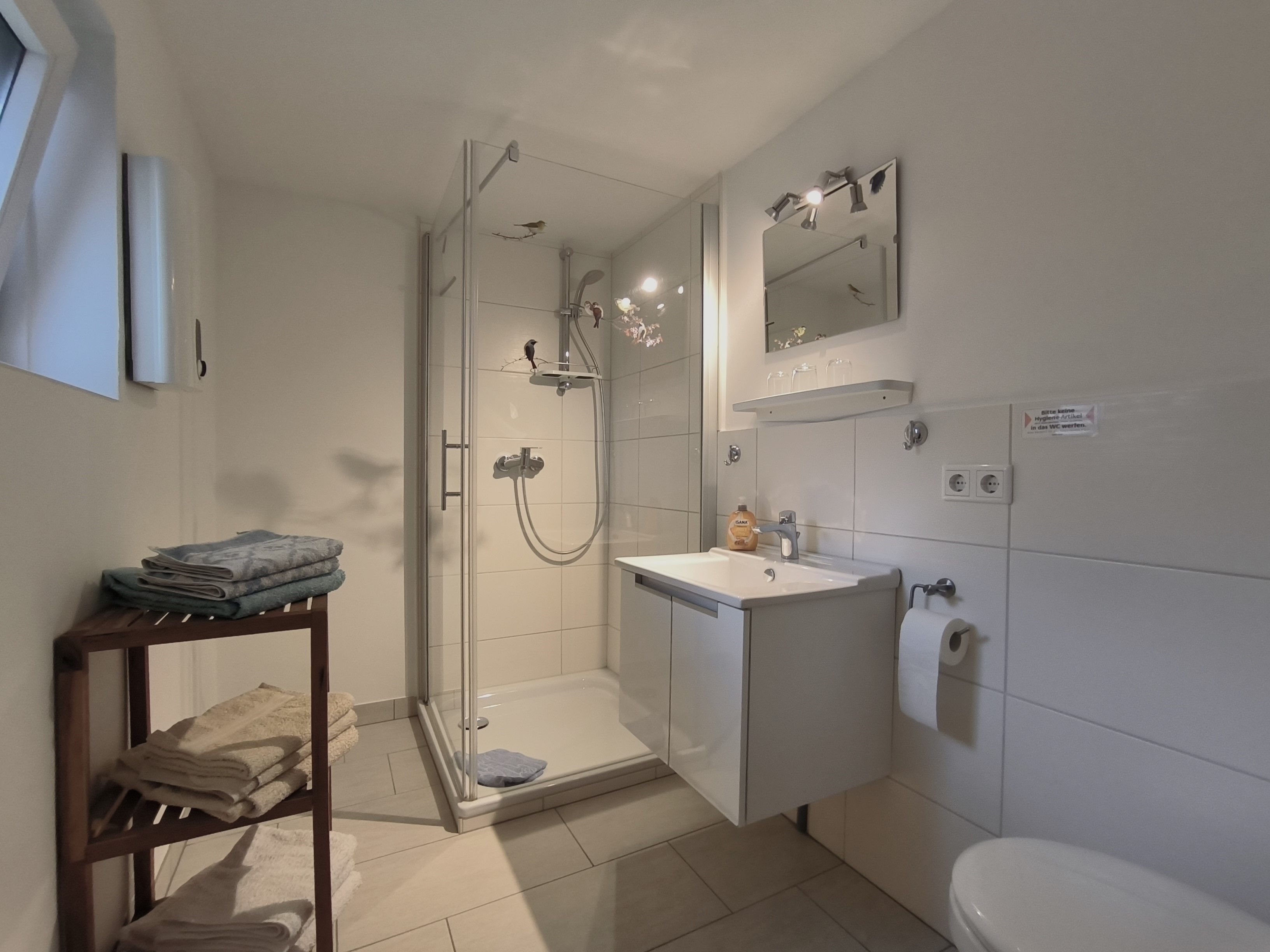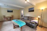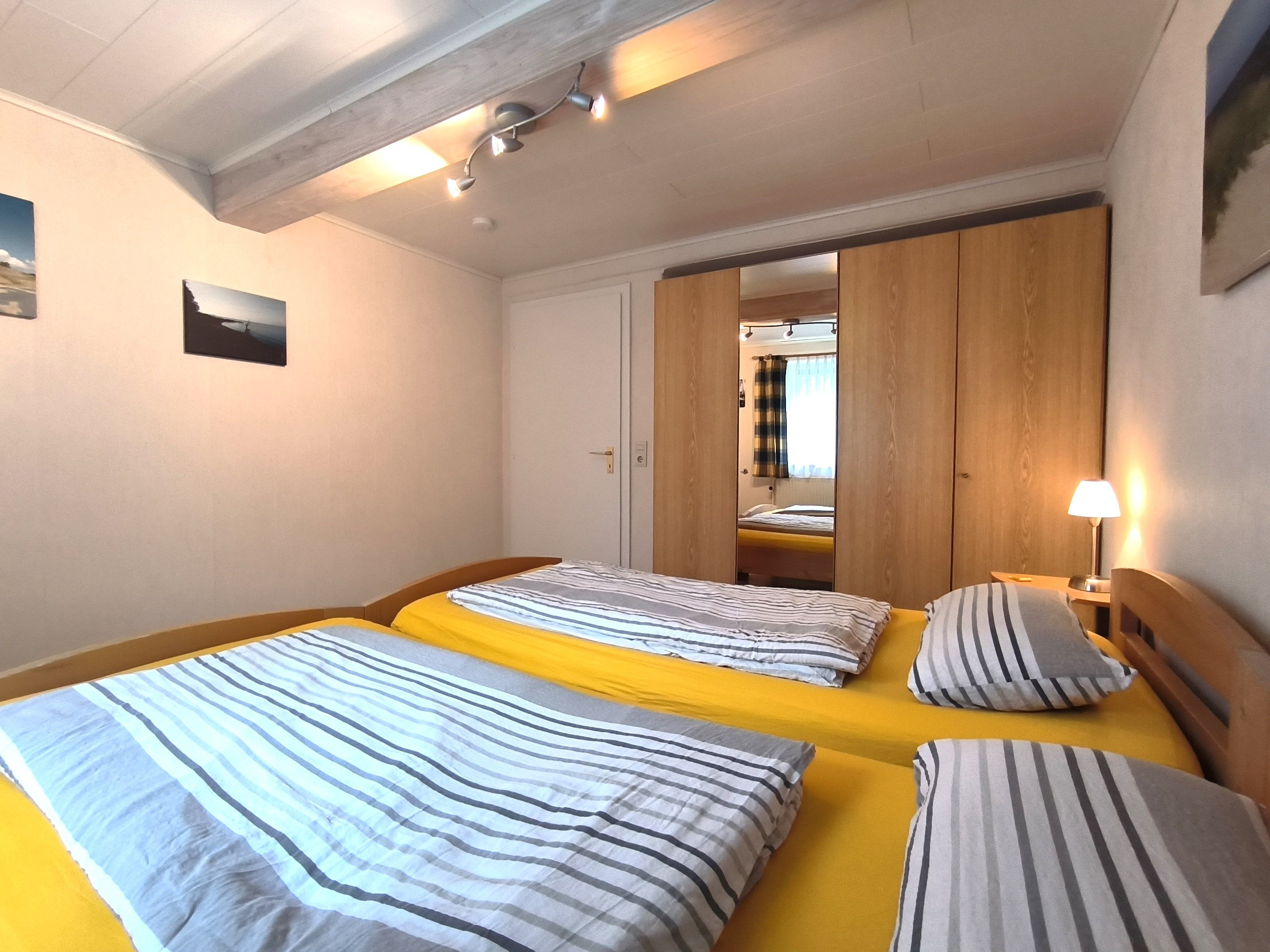 Im Eingangsbereich der Wohnung geht vom kleinen Flur das moderne Badezimmer mit Toilette, Waschbecken und Dusche und Fenster ab. Vom Flur weiter geradeaus geht es in die gut ausgestattete Küche (Kochfeld, Backofen, Wasserkocher, Kaffeemaschine) mit Esstisch und Stühlen. Von der Küche gehen das Schlafzimmer und das Wohnzimmer ab. Im Schlafzimmer gibt es ein Doppelbett (zwei zusammengestellte Betten) und einen großen Kleiderschrank. Das Wohnzimmer ist mit Sofa, Lesesessel, TV und noch einem kleinen Tisch ausgestattet. Zur Ferienwohnung gehört eine kleine Gartenlaube hinter dem Haus und mit Blick in den hübschen Garten: hier können sie windgeschützt und trocken sitzen.