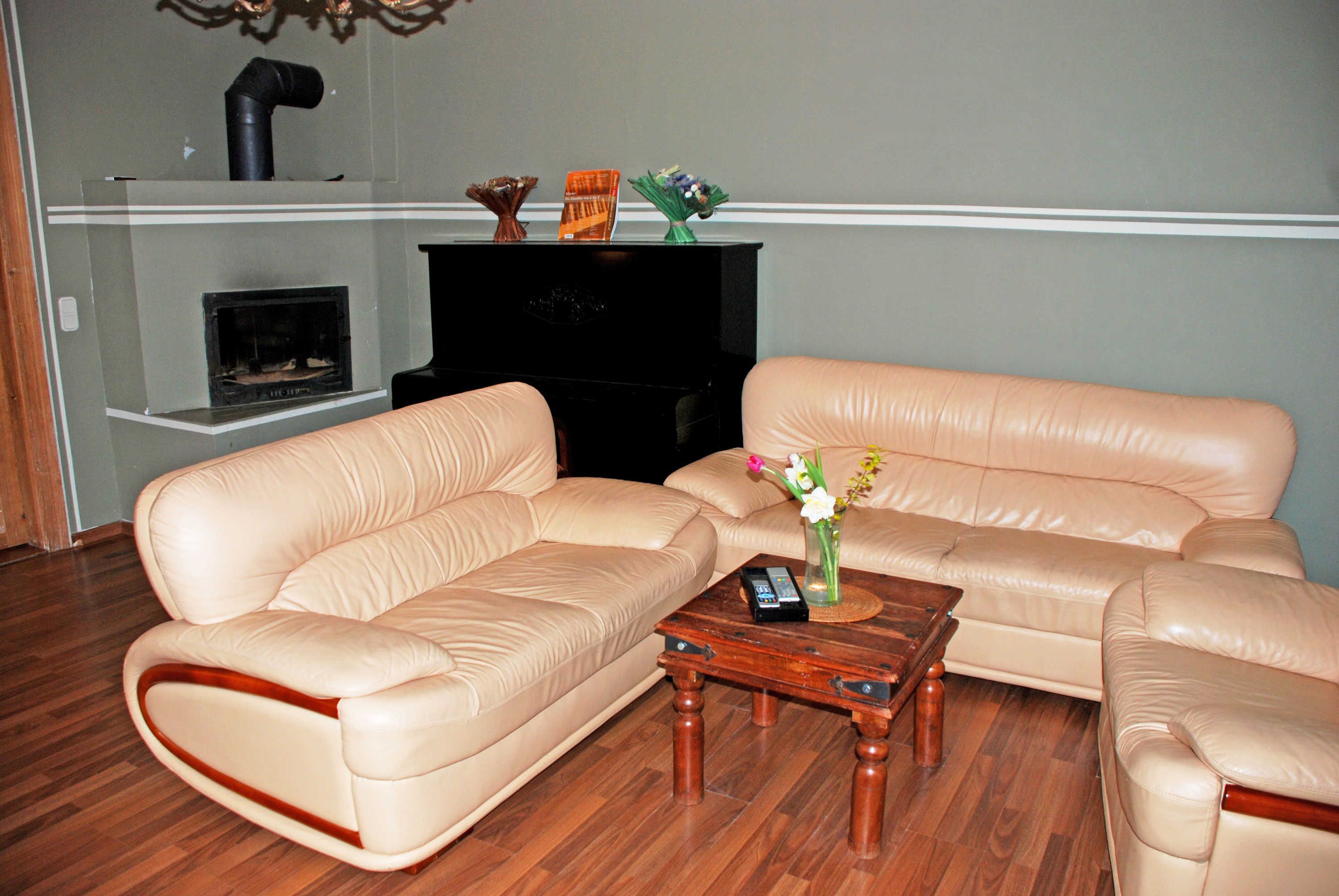 Sie verfügt über einen separaten Eingang. Im Wohnzimmer befinden sich eine Sitzcouch mit Tisch, ein Schrank und ein TV-Gerät. Ein schöner Kamin sorgt aauch im Winter für Behaglichkeit! Die kleine Pantryküche verfügt über einen Herd, Kaffeemaschine, Wasserkocher, Toaster, Tiefkühl- und Kühlschrank. Im Schlafzimmer stehen ein bequemes Doppelbett (140 x 200) mit Nachttischen und Leselampen, eine Liege (0,90 x 2,00 m) sowie ein Kleiderschrank.