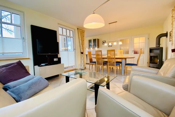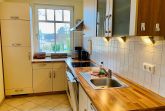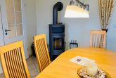 Sie hat einen großen lichtdurchfluteten Wohnbereich mit Couchecke, Esstisch und einem Kaminofen für die Gemütlichkeit ausgestattet. Die Komplettküche rundet das ganze ab.