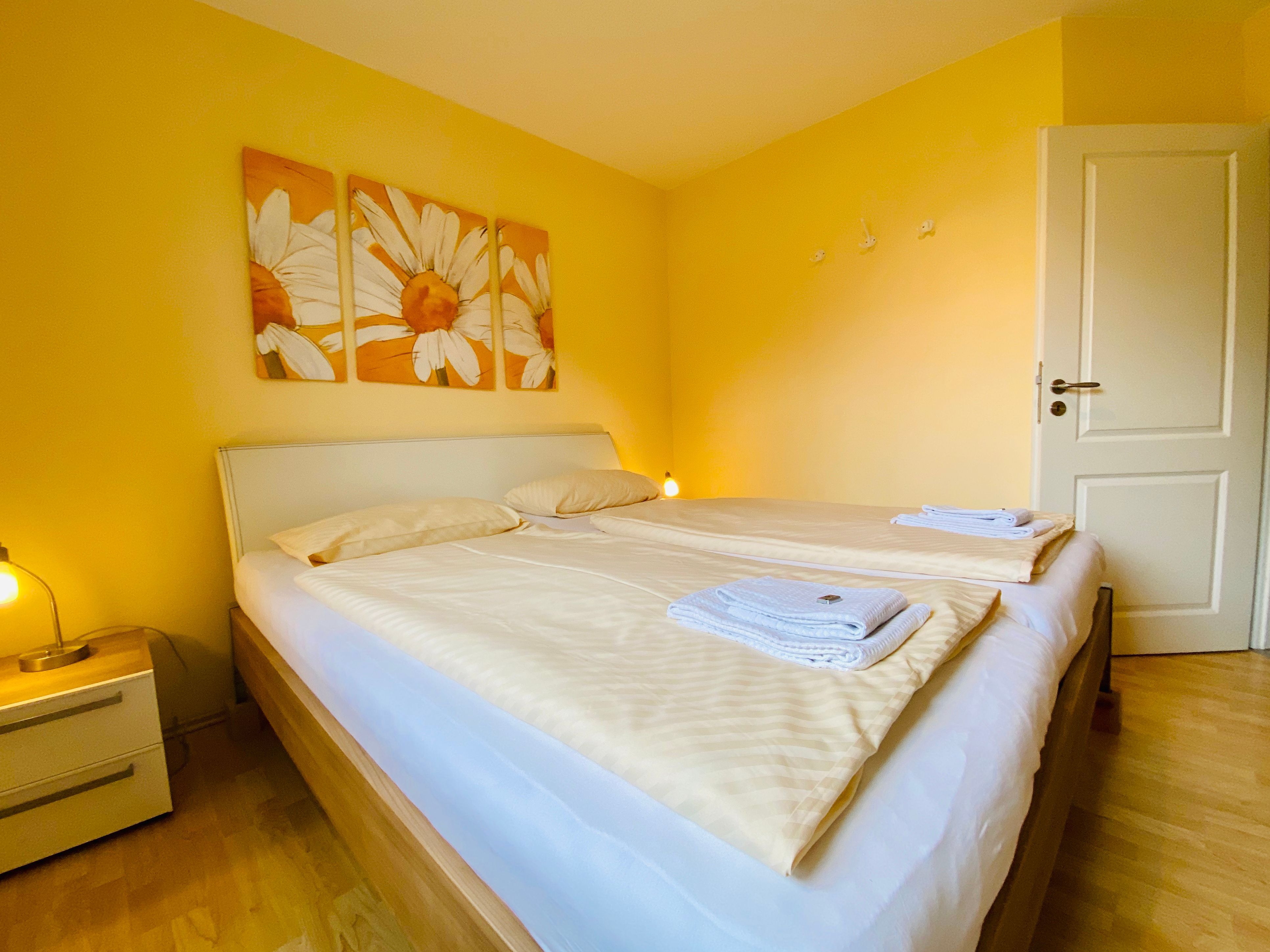 Zur Wohnung gehören zwei große Schlafzimmer mit Doppelbetten. Es gibt 2 Badezimmer mit Dusche oder Badewanne und einer Waschmaschine.