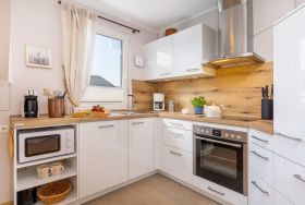 Küche mit Cerankochfeld, Mikrowelle und Geschirrspüler,