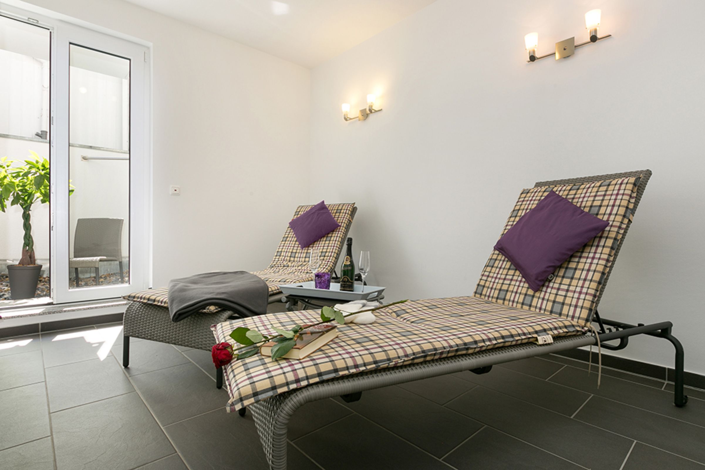 Ihren Pkw parken Sie in der Tiefgarage (Achtung - Einfahrtshöhe 1,97 m!) und mit dem Fahrstuhl erreichen Sie komfortabel Ihr Appartement. Die hauseigene Sauna lädt nach ausgedehntenSpaziergängen zur Entspannung ein.