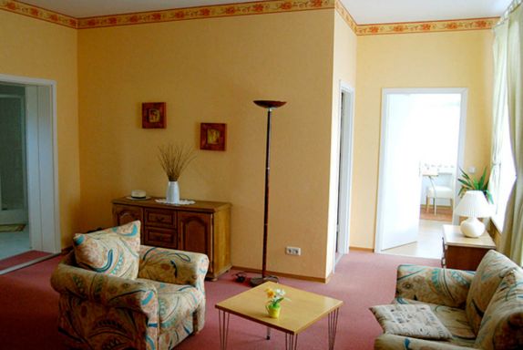 Unser Apartment Bernstein besteht aus einem großen Wohnzimmer, einem separaten Schlafzimmer, einem großzügigen Badbereich und einer großen Küche.