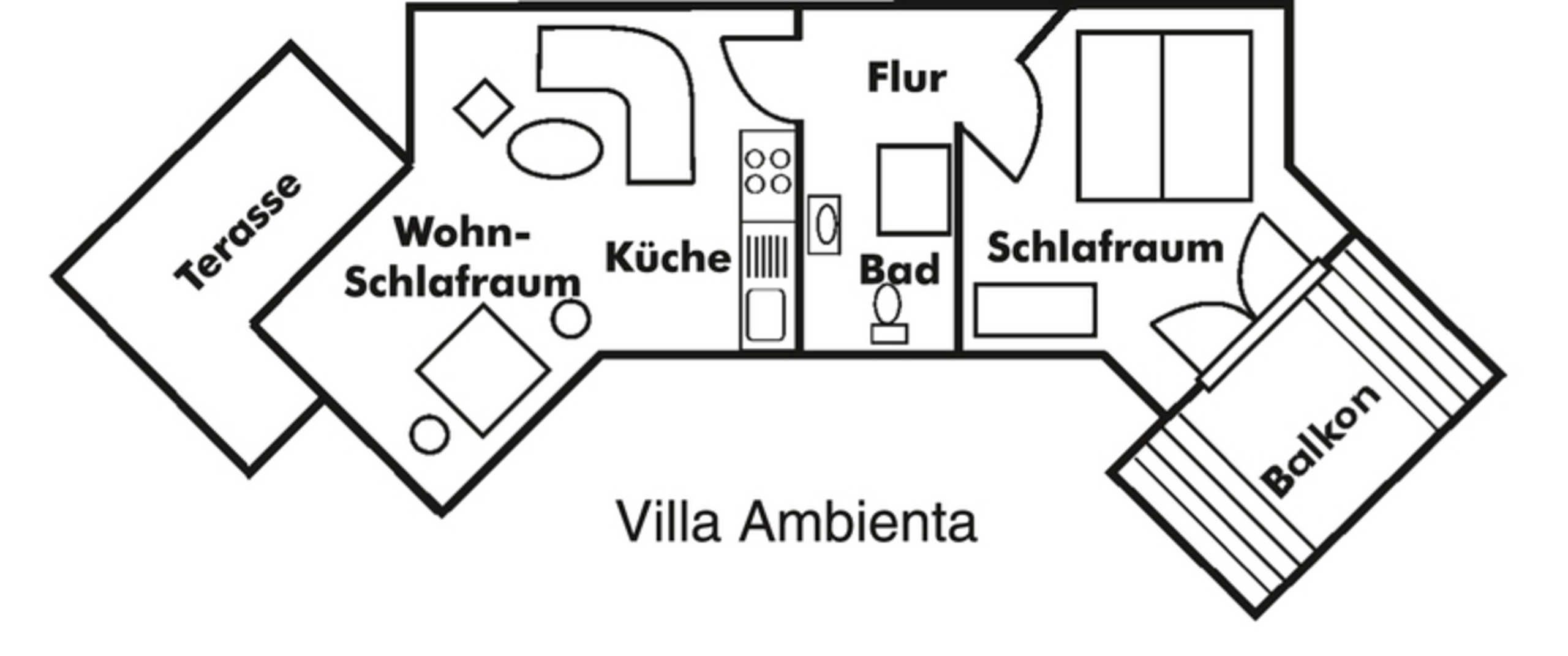 Nur 2 Minuten vom feinen Sandstrand und der Seebrücke entfernt, finden Sie die 1999 neu erbaute Villa Ambienta. Sie umfaßt 2 Häuser mit je 8 Zweiraumwohnungen für bis zu 4 Personen. Alle sind sehr geschmackvoll eingerichtet.  In der hauseigenen Tiefgarage können Sie Ihren Pkw ( für Kleinbusse nicht geeignet) kostenlos parken.