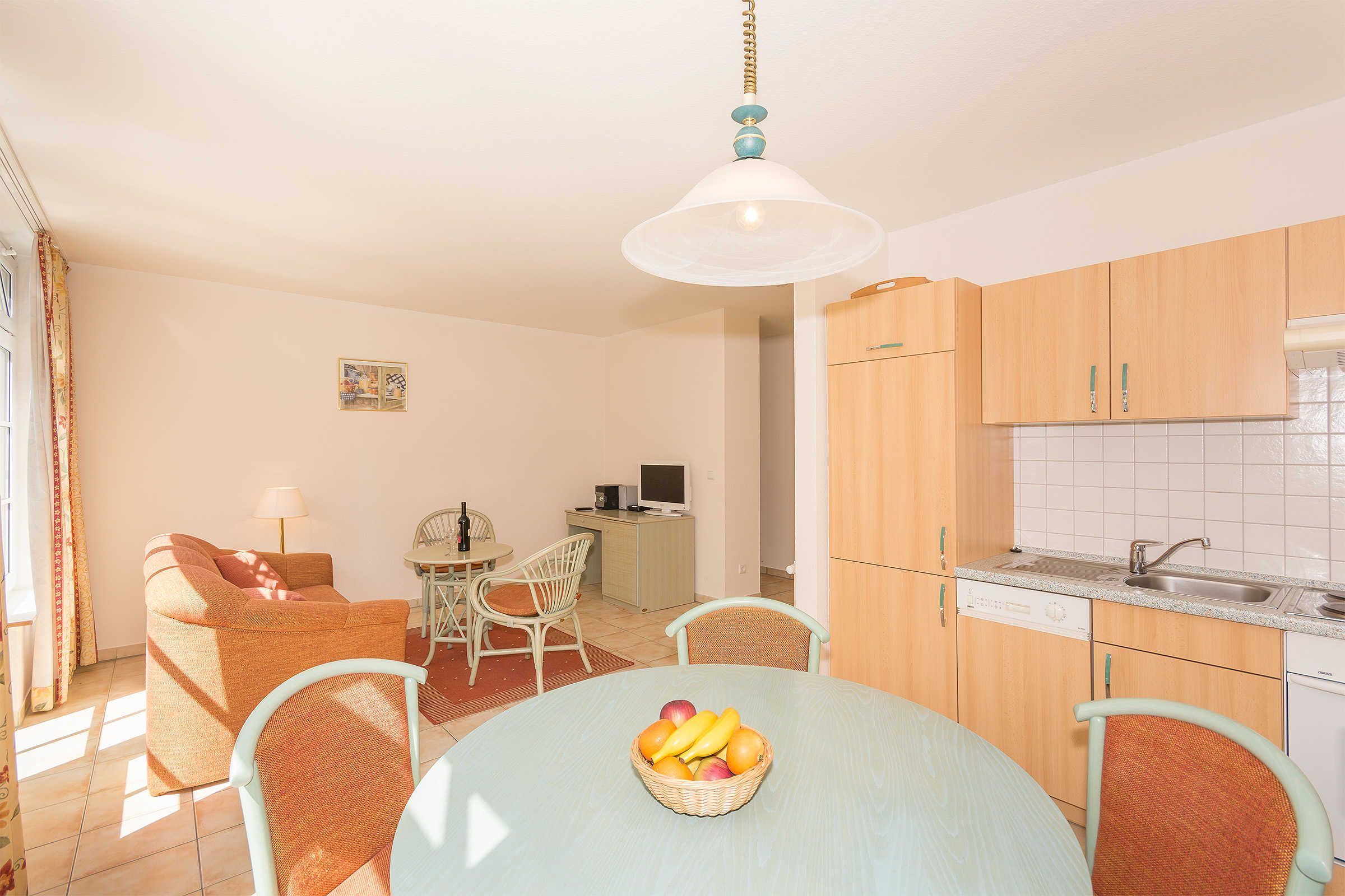Im Wohnraum erwartet Sie eine Schlafcouch, TV, Stereoanlage mit CD Player, die offene Küche ist mit Geschirrspüler, Backofen uvm. ausgestattet. Am runden Esstisch haben 4 Personen bequem Platz.