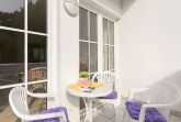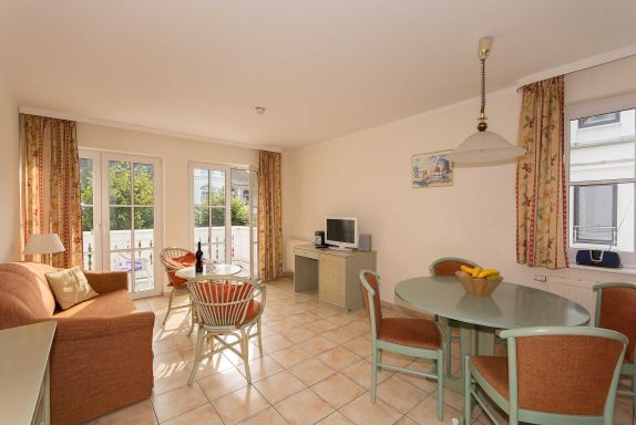 Mediterran eingerichtete Zweiraumwohnung ( 1.OG, Balkon) mit Rattanmöbeln in warmen Farben.