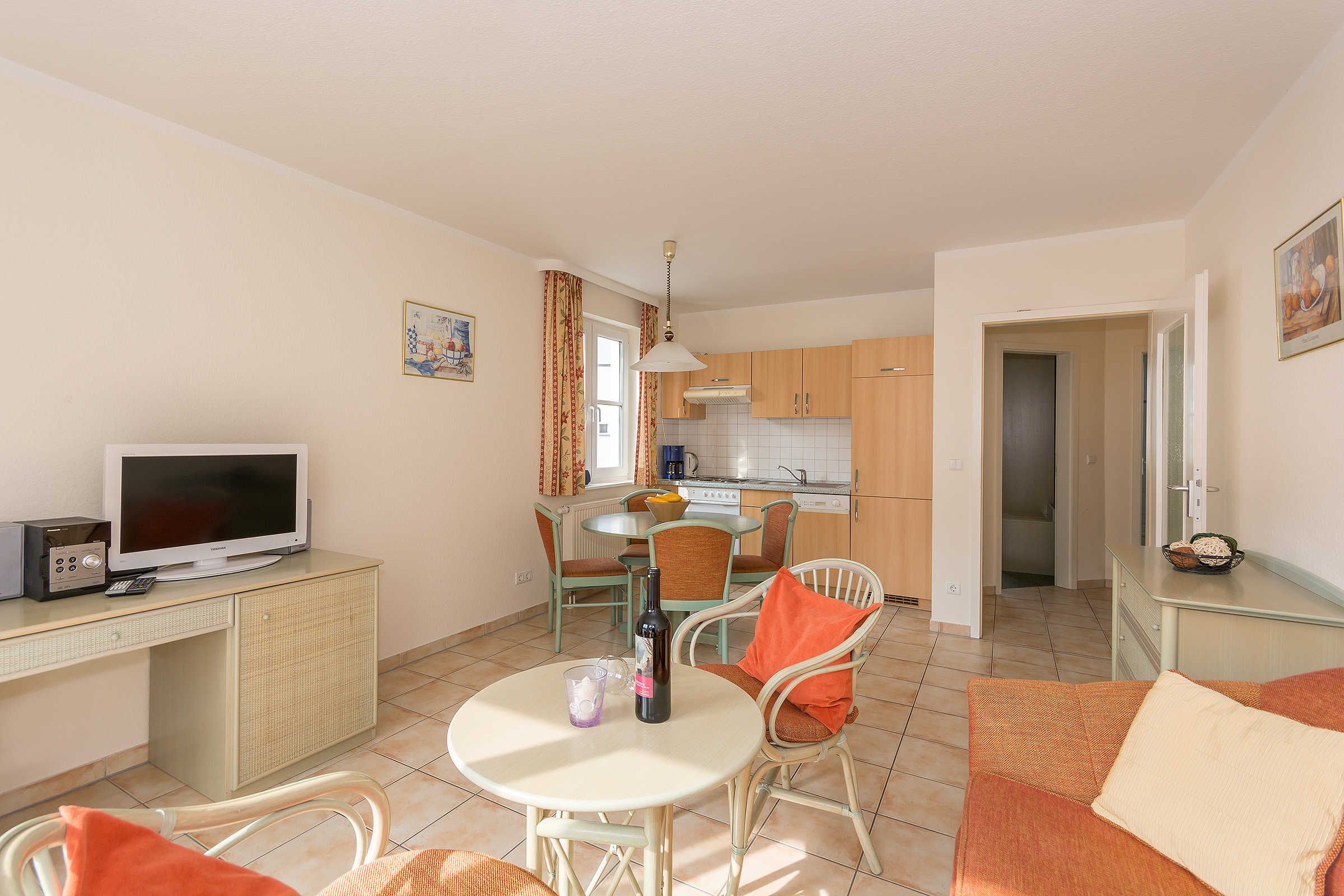 Im Wohnraum erwartet Sie eine Schlafcouch, TV, Stereoanlage mit CD Player, die offene Küche ist mit Geschirrspüler, Backofen uvm. ausgestattet. Am runden Esstisch haben 4 Personen bequem Platz.
