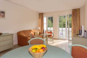 Die Zweiraumwohnungen verfügen über ein Wohn-/ Essbereich, einem Schlafzimmer mit Doppelbett und einem Duschbad.