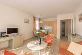 Im Wohnraum erwartet Sie eine Schlafcouch, TV, Stereoanlage mit CD Player, die offene Küche ist mit Geschirrspüler, Backofen uvm. ausgestattet. Am runden Esstisch haben 4 Personen bequem Platz.