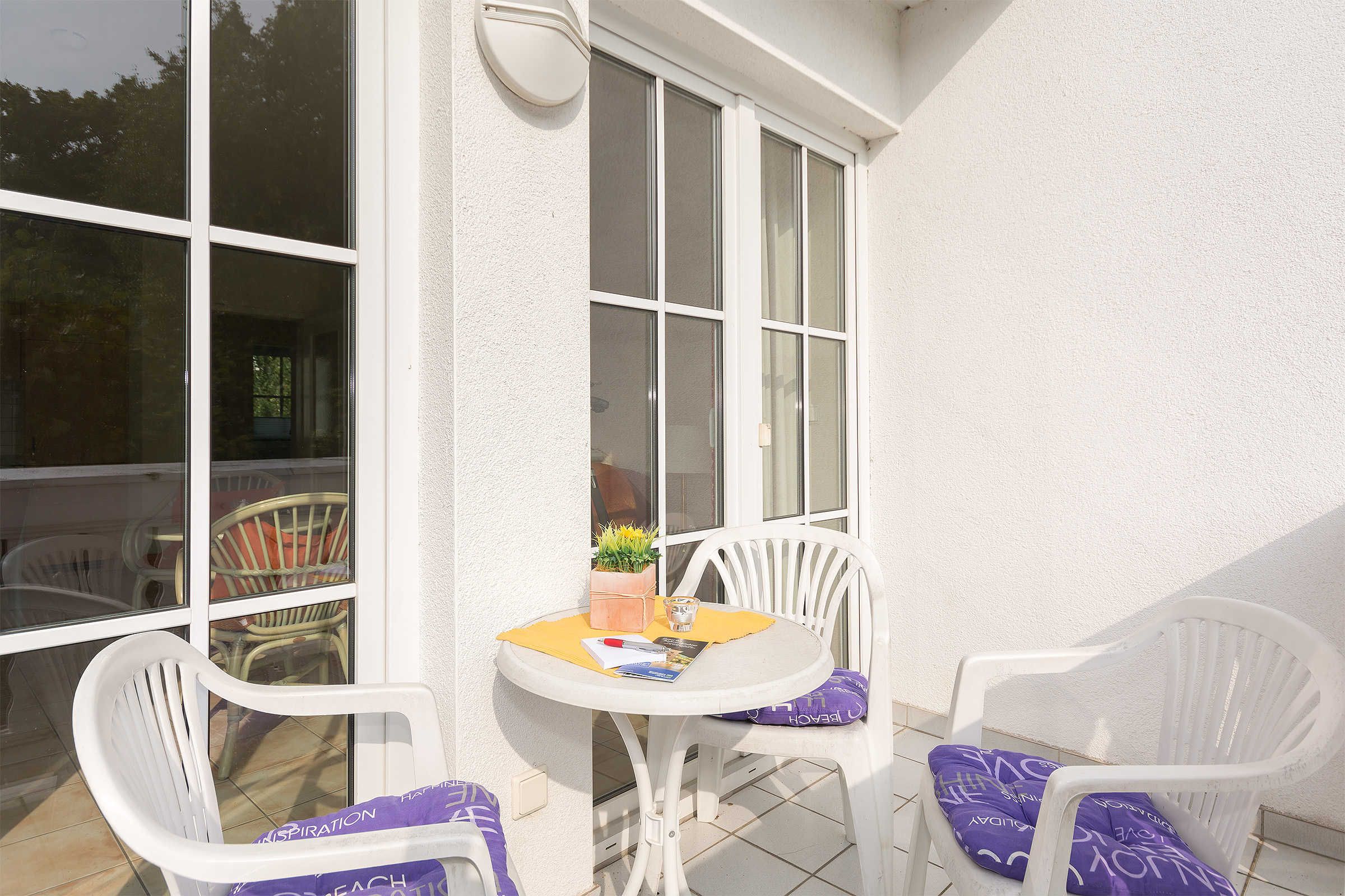 Mediterran eingerichtete Zweiraumwohnung ( 1.OG, Balkon) mit Rattanmöbeln in warmen Farben.