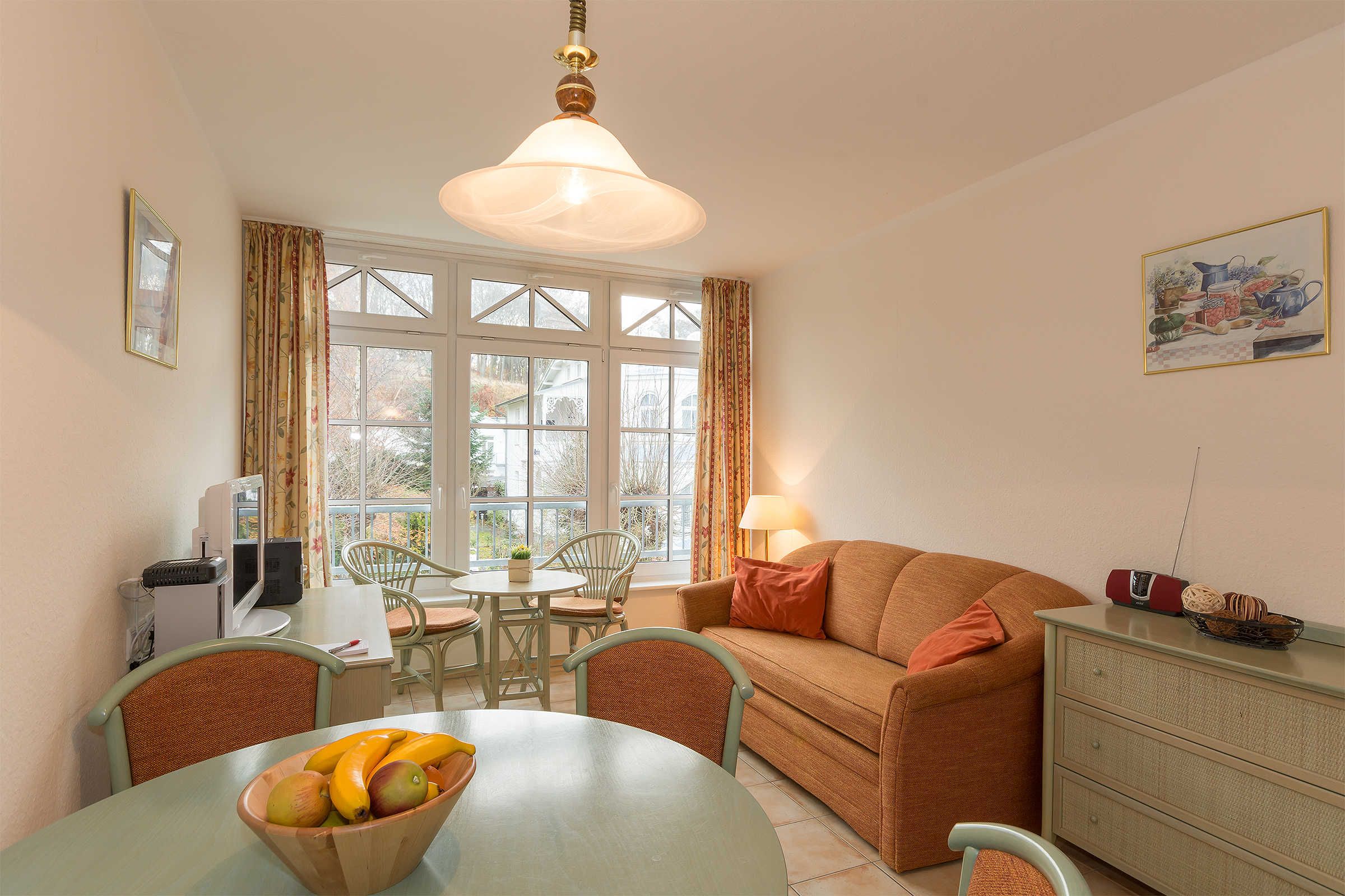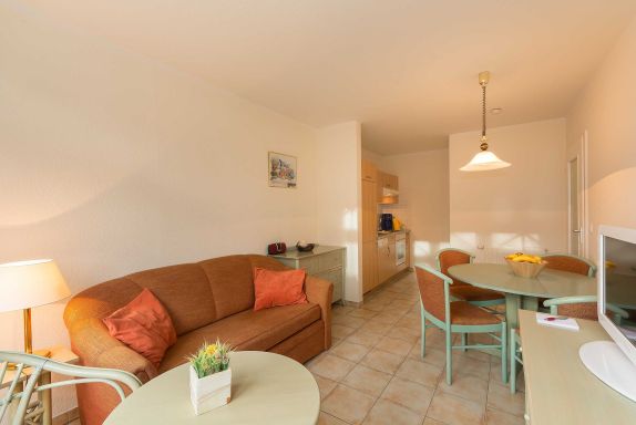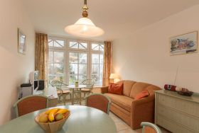 Mediterran eingerichtete Zweiraumwohnung für 2 Personen ( 1. OG, ohne Balkon) mit Rattanmöbeln in warmen Farben.