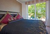 Für erholsame Stunden nach einem erlebnisreichen Tag befindet sich auch im Schlafzimmer ein Fernseher. Wenn Sie das Gefühl leiben, im Freien zu schlafen, öffnen Sie einfach die Schiebetür zum Ostteil des umlaufenden Balkons. Dann können Sie mit Blick auf die 100 jährige Eiche sogar den Sonnenaufgang erleben.