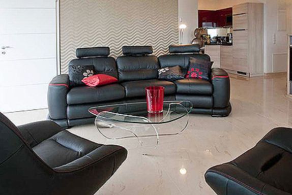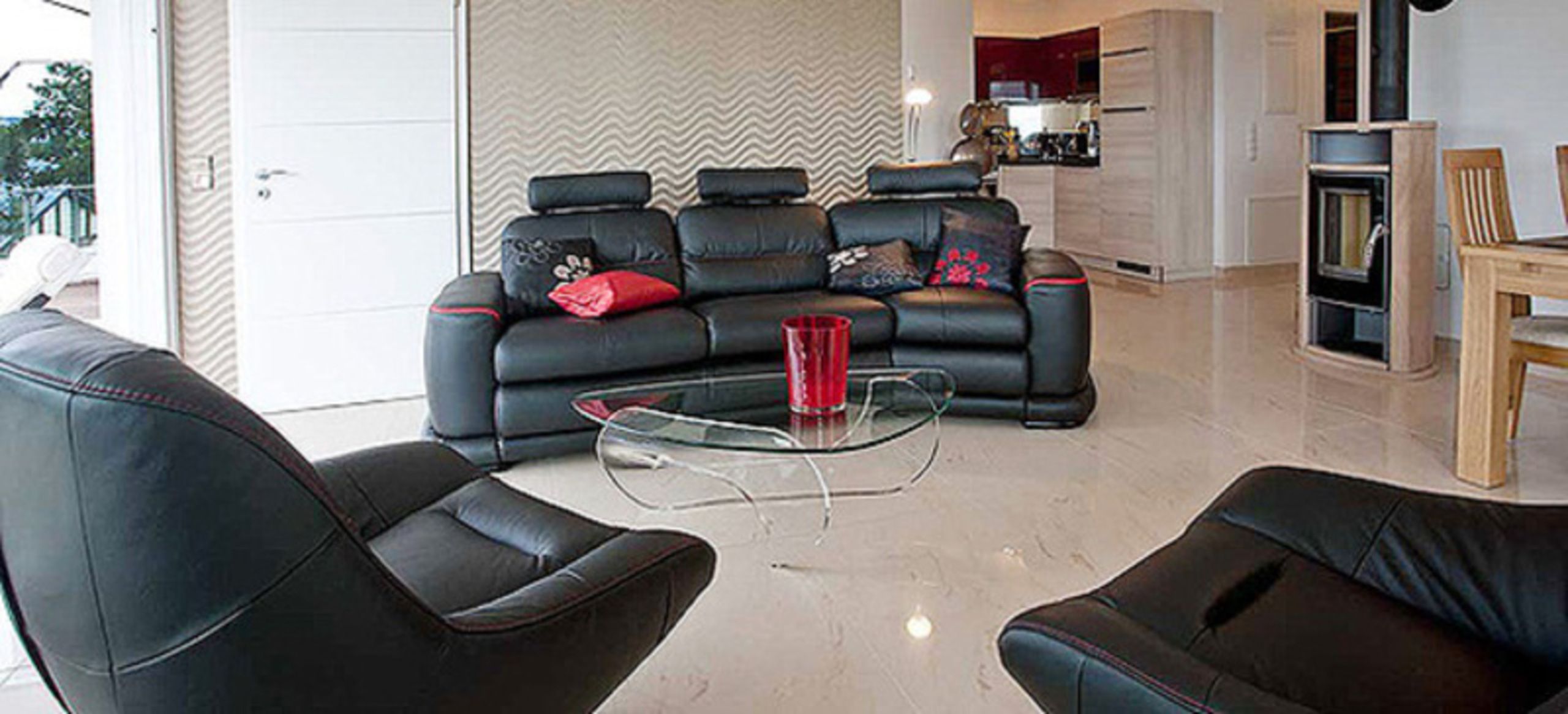 Der Wohnraum von 35 m² ist großzügig eingerichtet und mit Rosa Portogallo Marmor-Feinstein ausgelegt. Große Schiebetüren öffnen die Fensterfronten zur 30 m² großen umlaufenden Terrasse und Rasenfläche nach Süden mit Blick ins Grüne und nach Westen mit Blick auf die Zickerschen Berge.