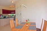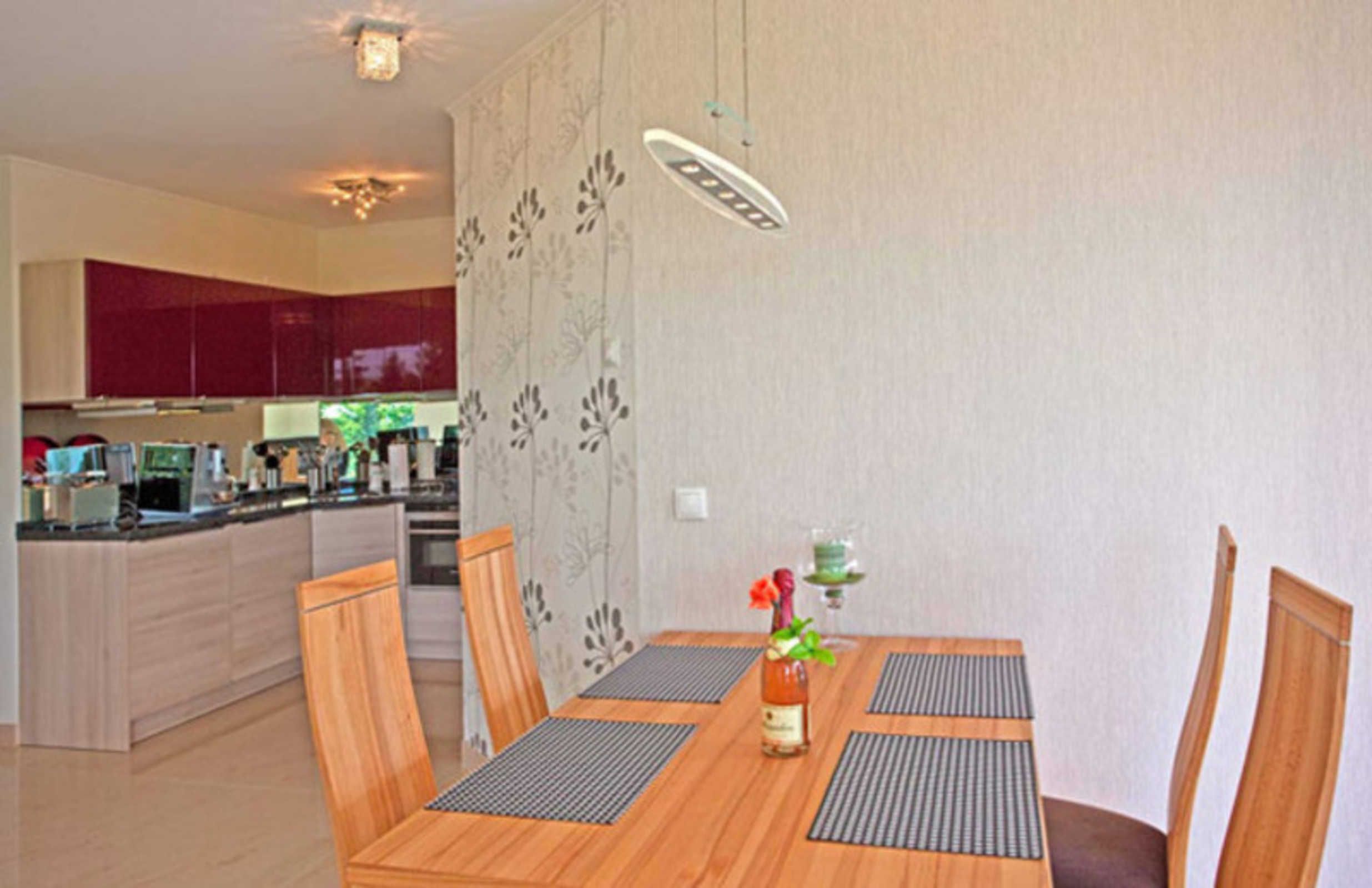 Ein Essplatz aus hochwertigem Kernbucheholz und die offene Küche, die unter anderem mit einer Arbeitsplatte aus Granit, Cerankochfeld, Backofen, Mikrowelle, Spülmaschine, Kaffeevollautomat, Wasserkocher und Toaster erstklassig ausgestattet ist, vollenden das Wohlbefinden in unserem Garten Appartement.