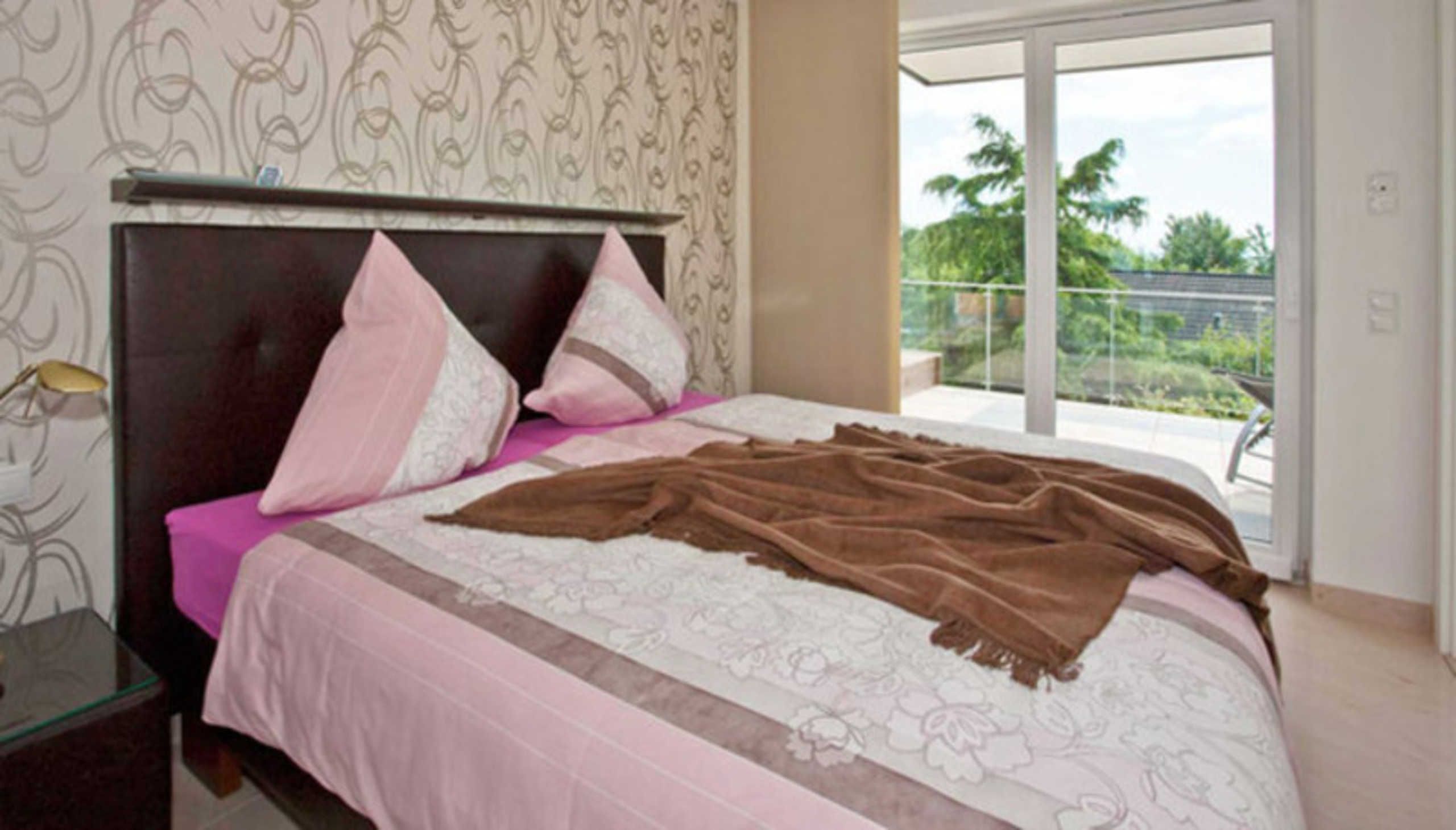 Für erholsame Stunden nach einem erlebnisreichen Tag befindet sich auch im Schlafzimmer ein Fernseher. Wenn Sie das Gefühl leiben, im Freien zu schlafen, öffnen Sie einfach die Schiebetür zum Südtteil der Terrasse.