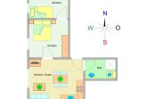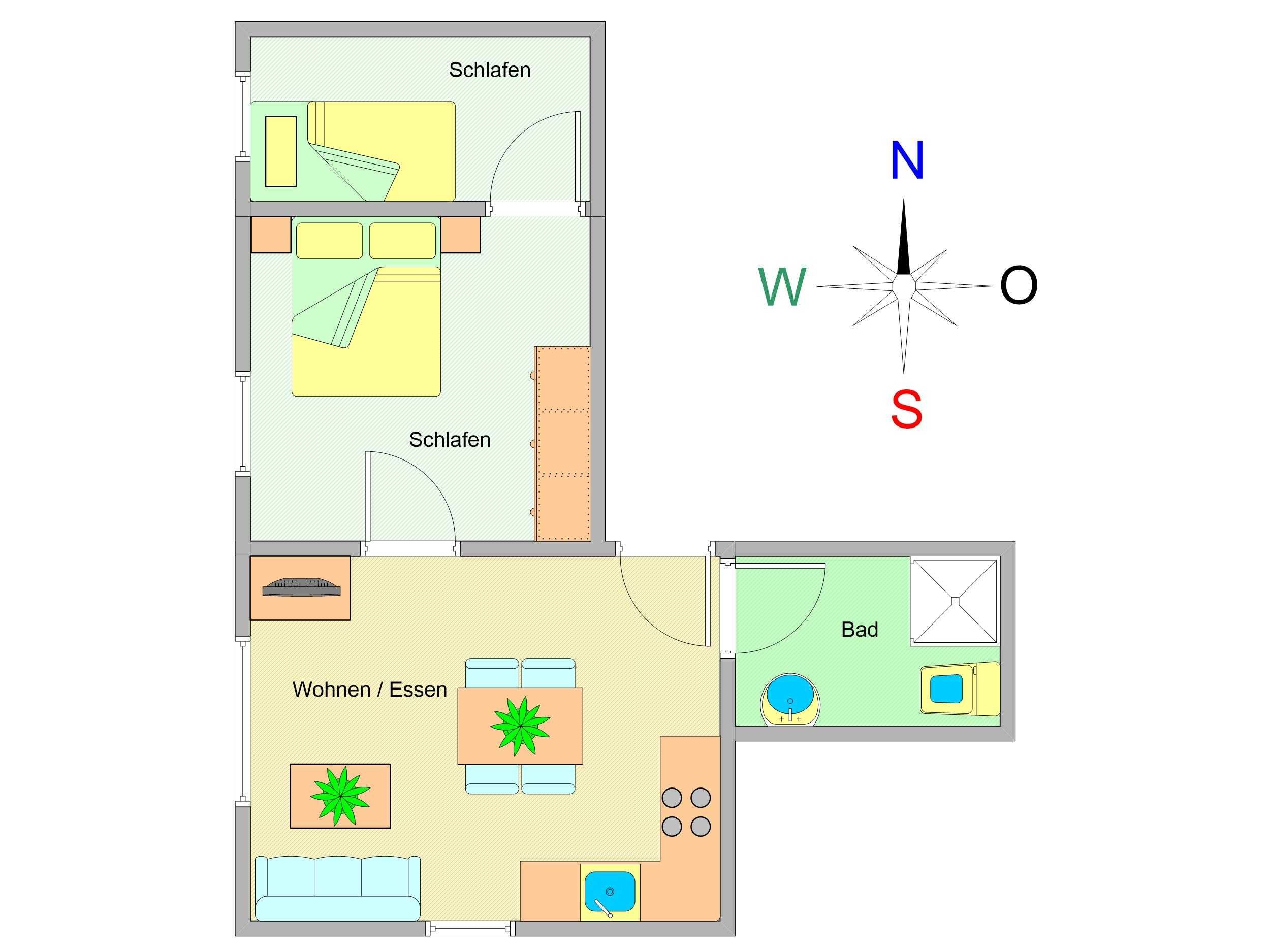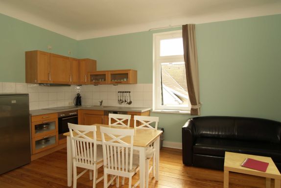 Sie erholen sich in einer großzügigen 2-Raum-Wohnung von ca. 50 qm Größe, die sich im zweiten Obergeschoss befindet. Das Wohnzimmer ist ausgestattet mit Küchenzeile (Herd mit Backofen, Geschirrspüler, Kaffeemaschine) und TV-Gerät. Ein Schlafzimmer mit Doppelbett, ein kleiner Raum mit Schlafliege sowie das Bad mit Dusche und WC vervollständigen das Gesamtbild dieser Wohnung.
