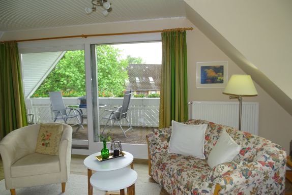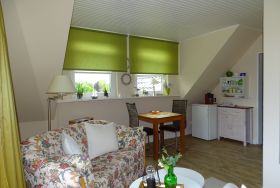 Im Appartment 1 (mit separater Küche) erwartet Sie ein Schlafzimmer mit Doppelbett, TV und Sitzecke. Das Duschbad mit Tageslicht ist direkt vom Schlafzimmer aus begehbar. Die Küche ist bestens ausgestattet mit Wasserkocher, Kaffeemaschine, Kühlschrank, Herd und Backofen sowie einer Mirkowelle und einem Esstisch für zwei Personen.