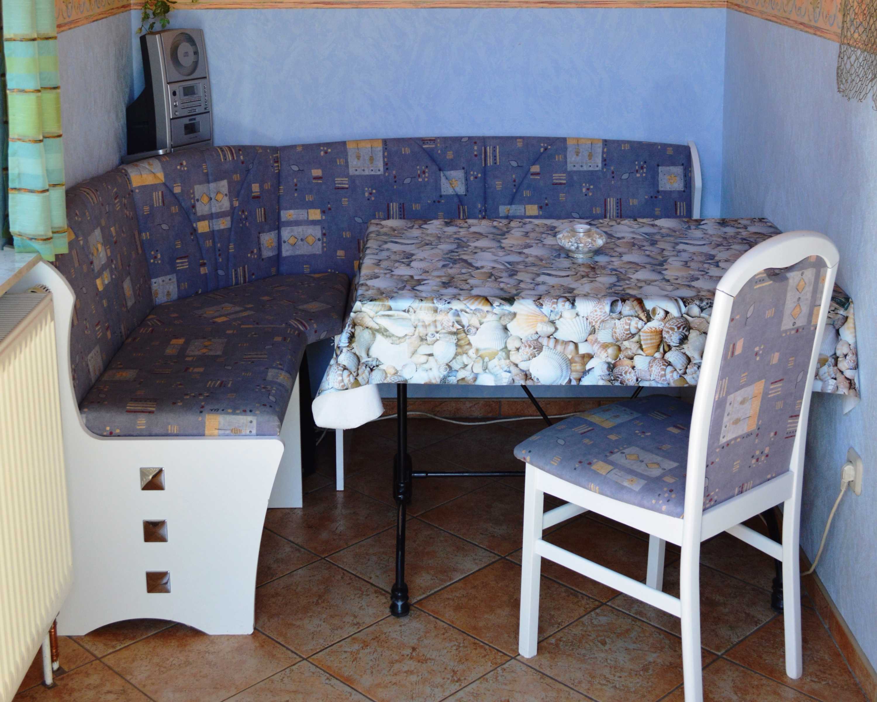 Im Erdgeschoss befindet sich das Schlafzimmer mit einen Doppelbett, Kleiderschrank, Kommode und einem zweiten Fernseher. Die Küche ist ausgestattet mit 4-Platten-Cerankochfeld, Backofen, Kühlschrank mit Gefriermöglichkeit, Mikrowelle, Kaffeemaschine, Wasserkocher, Toaster und Sitzecke. Die Küche befindet sich ebenfalls im Erdgeschoss, wie auch das Badezimmer mit Dusche und WC. Die Erstausstattung Bettwäsche und Handtücher sind im Preis enthalten.