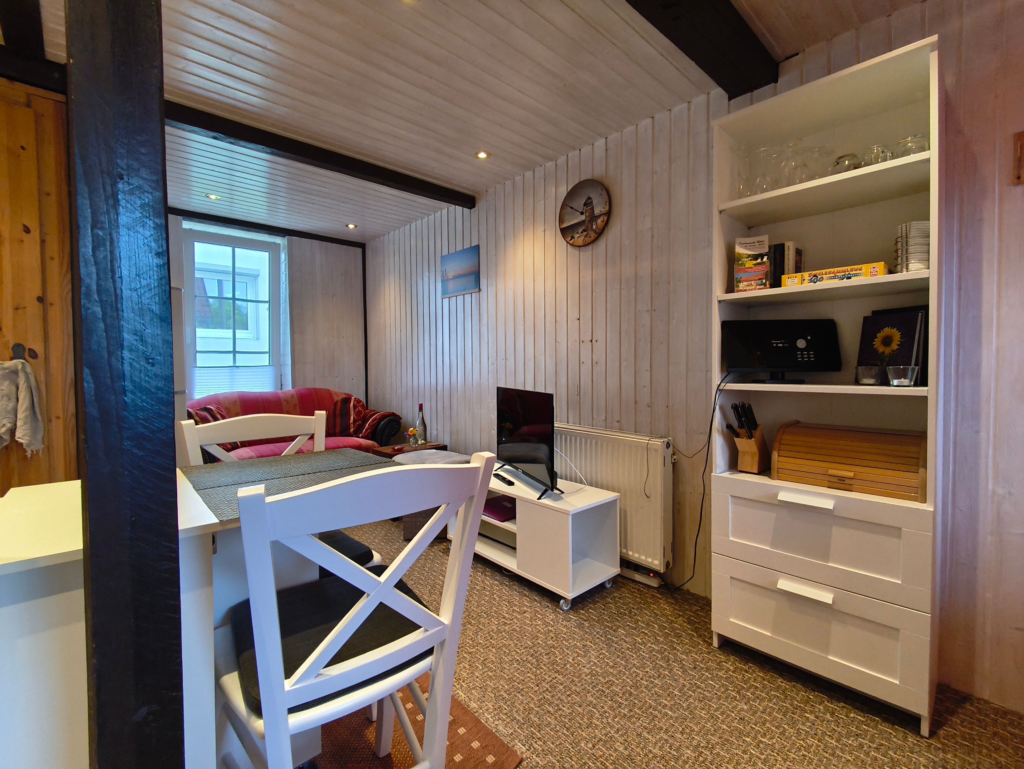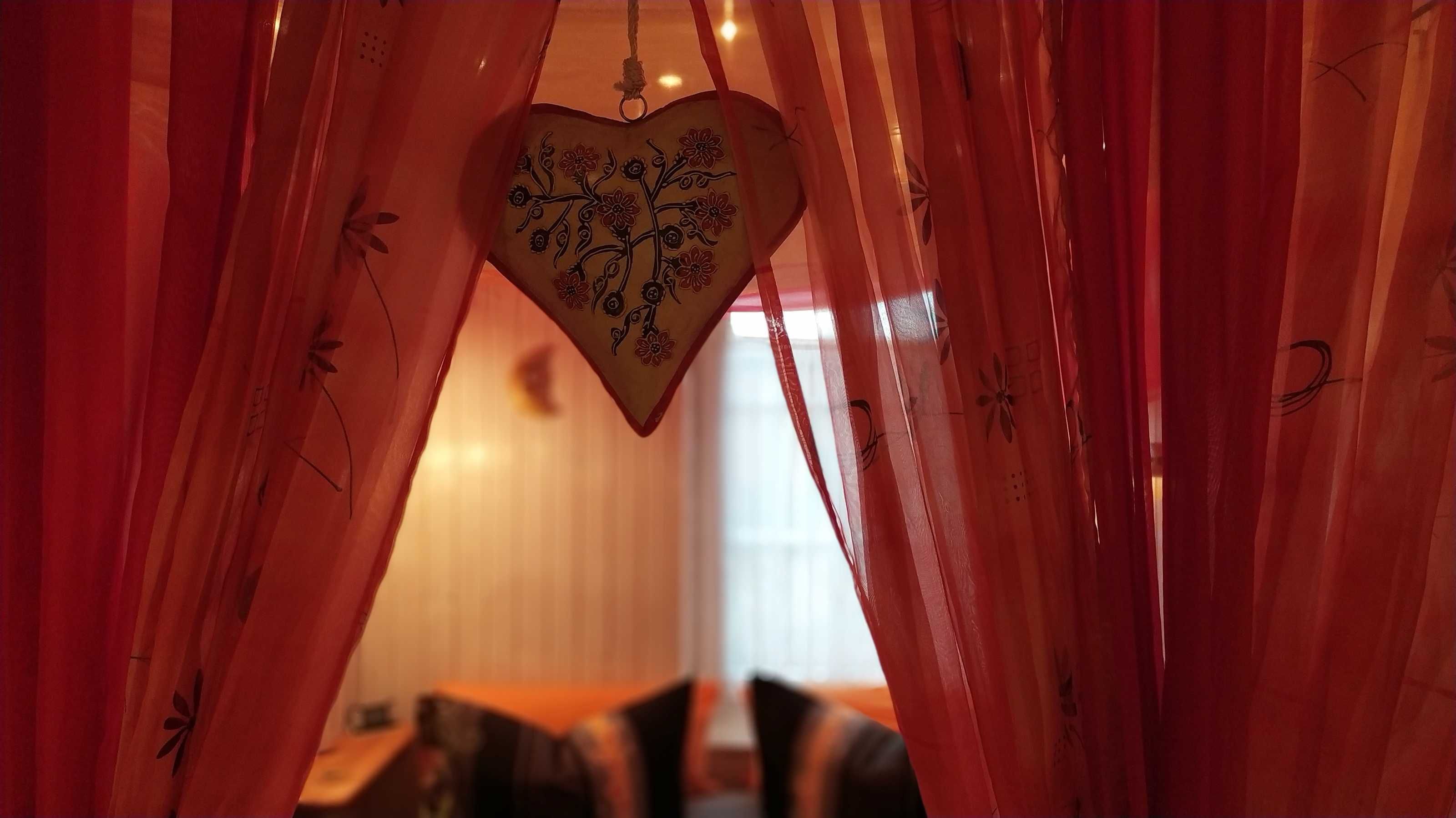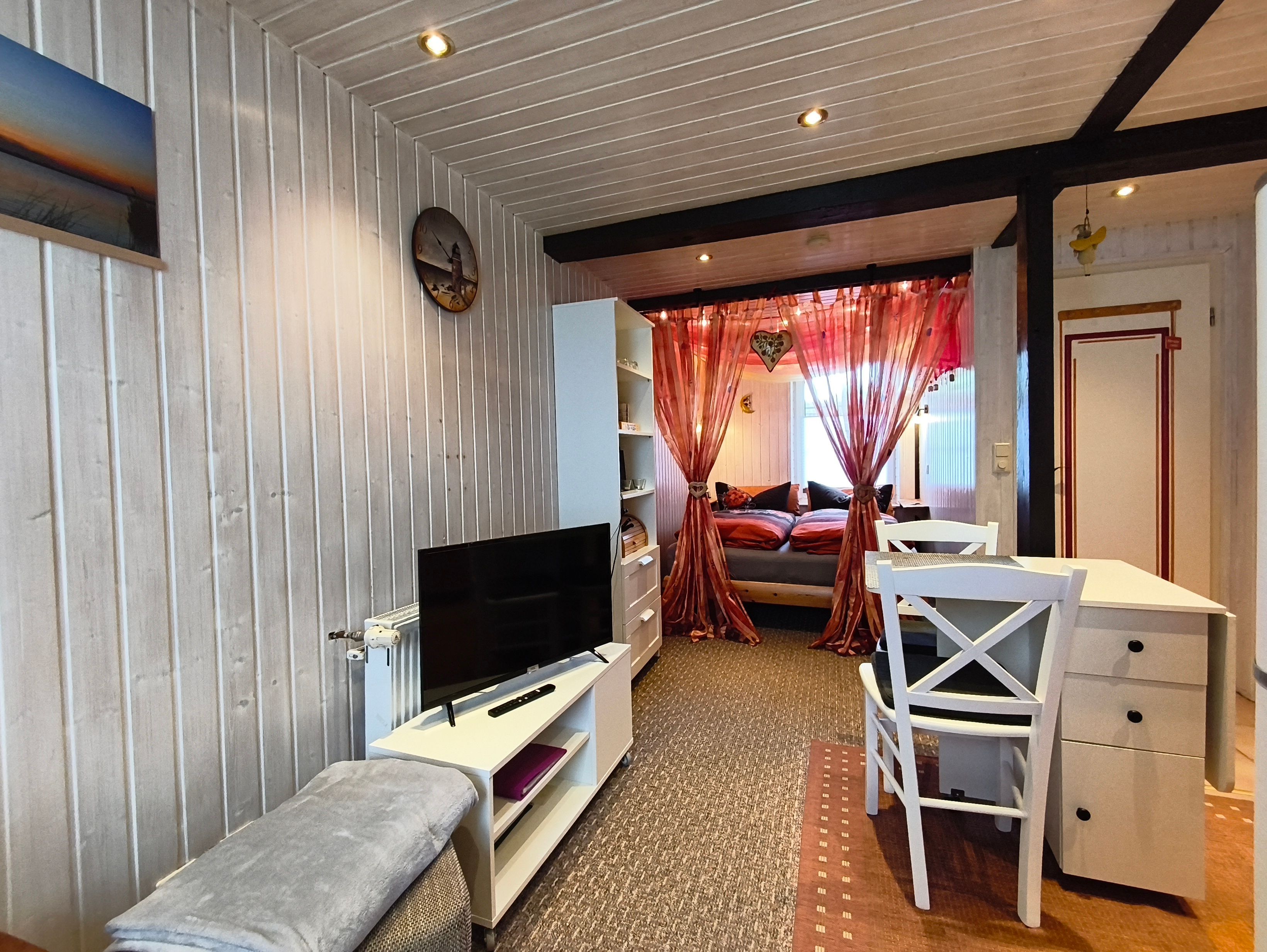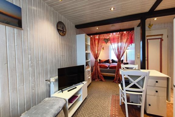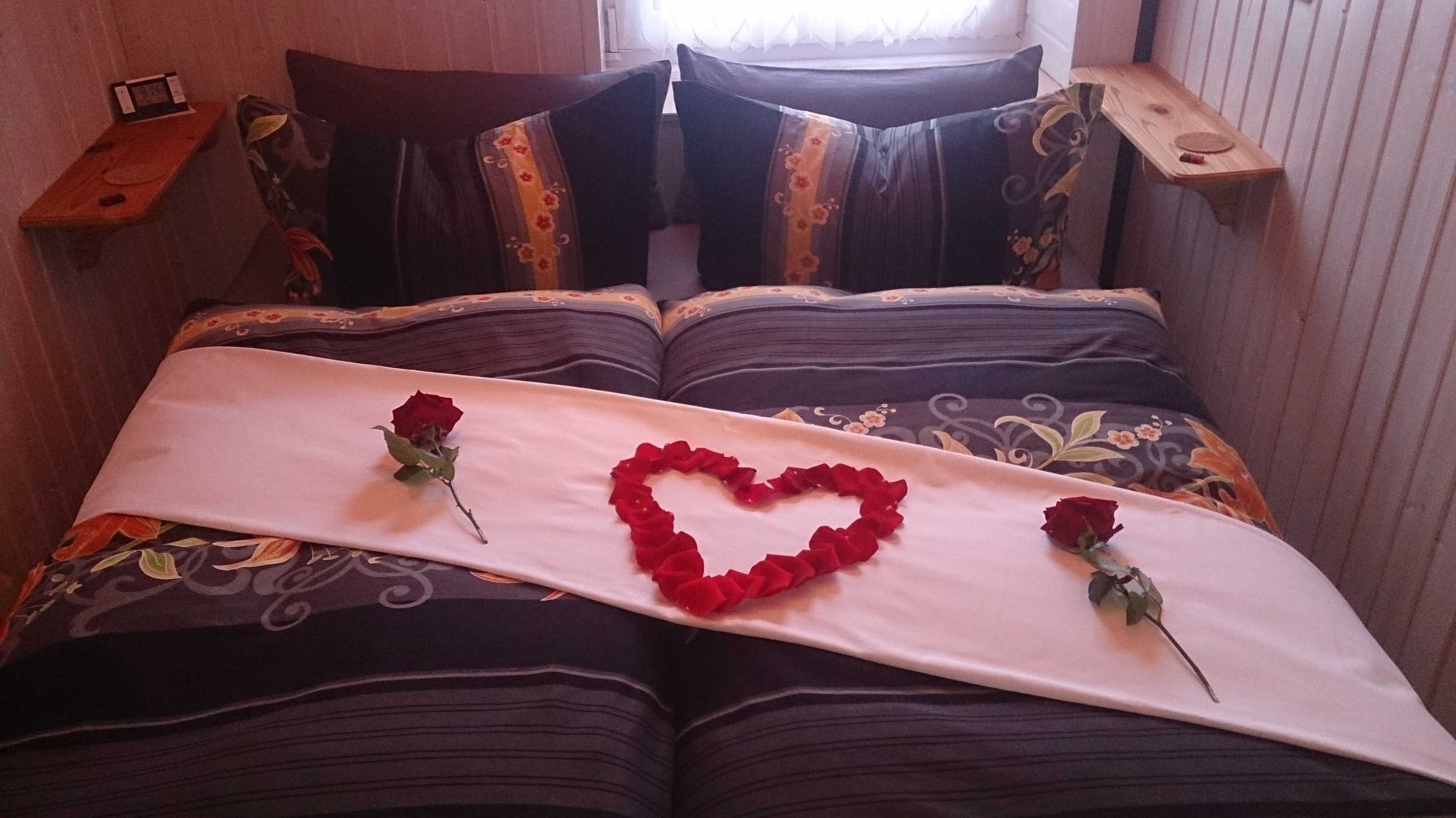 Das Doppelzimmer Honeymoon besticht durch sehr viel Romantik, Gemütlichkeit und eine fröhlich- farbige Innenausstattung. Ein Himmelbett mit dimmbarem Sternchenhimmel lädt zum Träumen ein. Das Sofa sorgt für eine angenehme Atmosphäre. Eine voll eingerichtete Miniküche steht zur Verfügung. Im Bad mit Fenster gibt es sowohl einen Fön und einen Kosmetikspiegel als auch diverse Kosmetikprodukte, falls Sie Ihre eigenen vergessen haben. Angeboten werden ofenfrische Brötchen in Varianten ab 9 Uhr an die Tür gehängt. Oder ein Tellerfrühstück ab 9 Uhr. Bei Gelegenheit gibt es einen Grillabend, einen Fischabend oder ab und an selbstgebackenen Kuchen. Alles ist auf Bequemlichkeit und Freundlichkeit ausgerichtet - der Gast möge sich von Anfang an zu Hause fühlen.