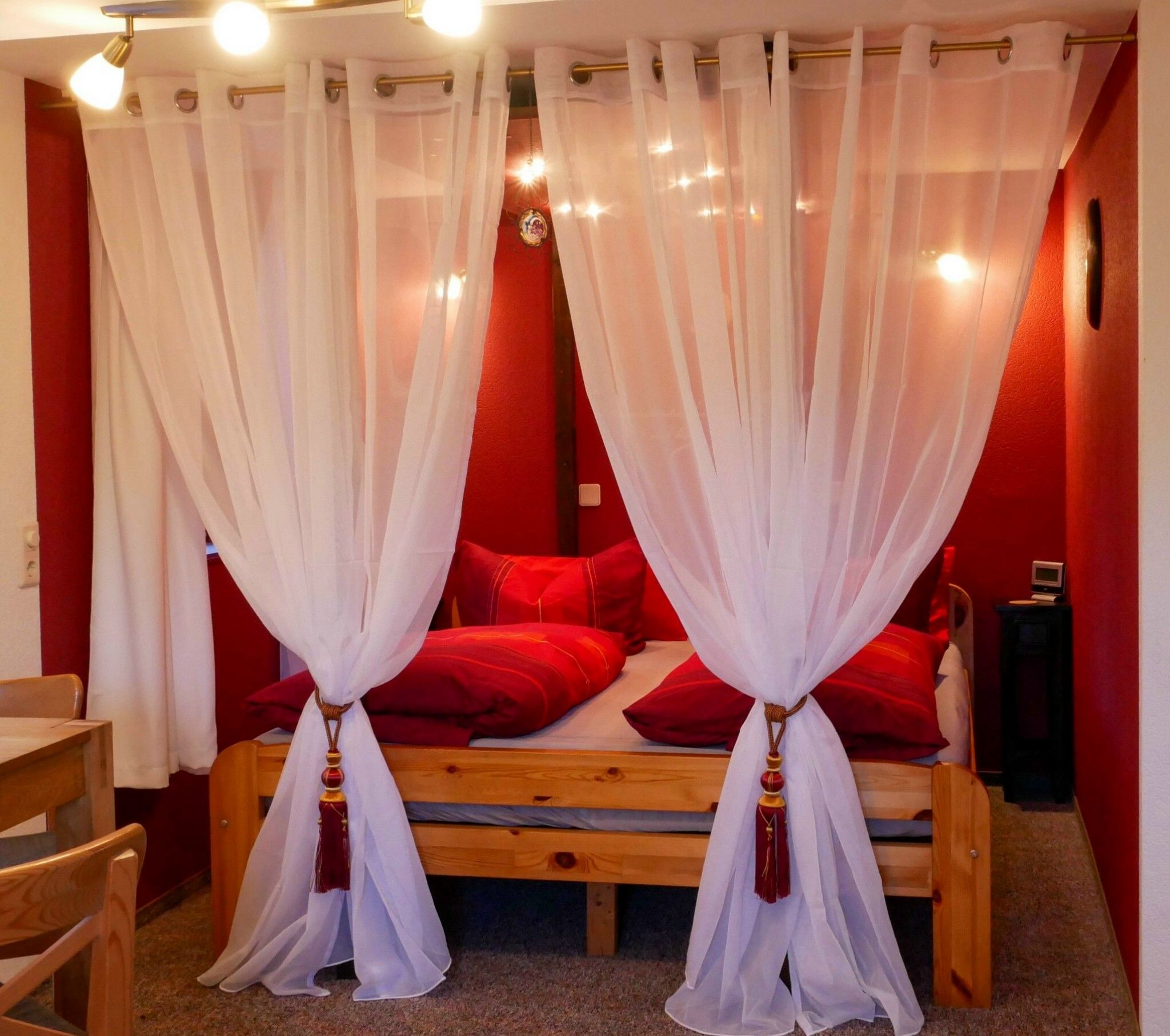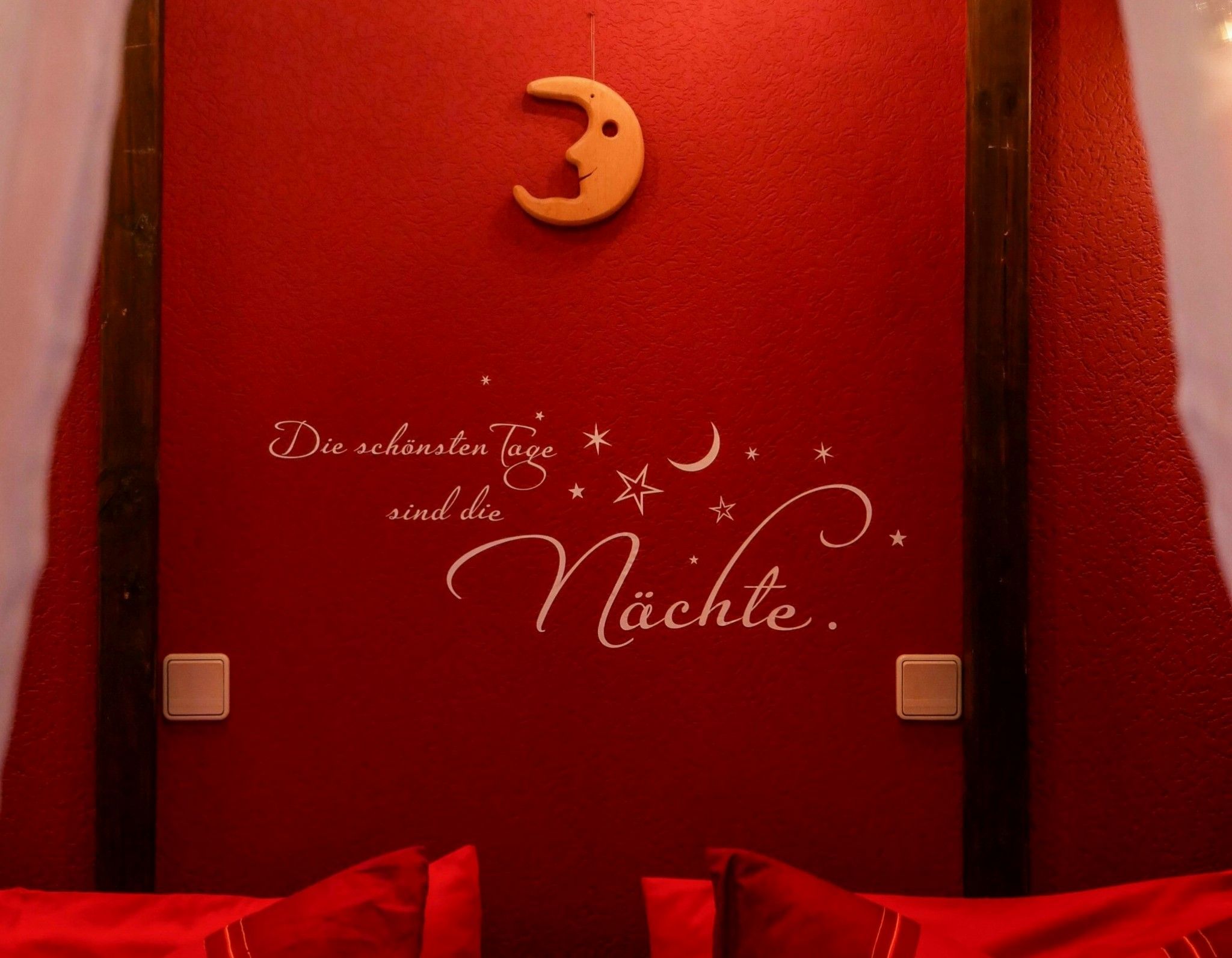 Das Doppelzimmer Moonlight besticht durch sehr viel Romantik, Gemütlichkeit und eine fröhlich- farbige Innenausstattung. Ein Himmelbett mit dimmbarem Sternchenhimmel lädt zum Träumen ein. Das Sofa sorgt für eine angenehme Atmosphäre. Eine voll eingerichtete Miniküche steht zur Verfügung. Im Bad gibt es sowohl einen Fön und einen Kosmetikspiegel als auch diverse Kosmetikprodukte, falls Sie Ihre eigenen vergessen haben. Angeboten werden ofenfrische Brötchen in Varianten ab 9 Uhr an die Tür gehängt. Oder ein Tellerfrühstück ab 9 Uhr. Bei Gelegenheit gibt es einen Grillabend, einen Fischabend oder ab und an selbstgebackenen Kuchen. Alles ist auf Bequemlichkeit und Freundlichkeit ausgerichtet - der Gast möge sich von Anfang an zu Hause fühlen.