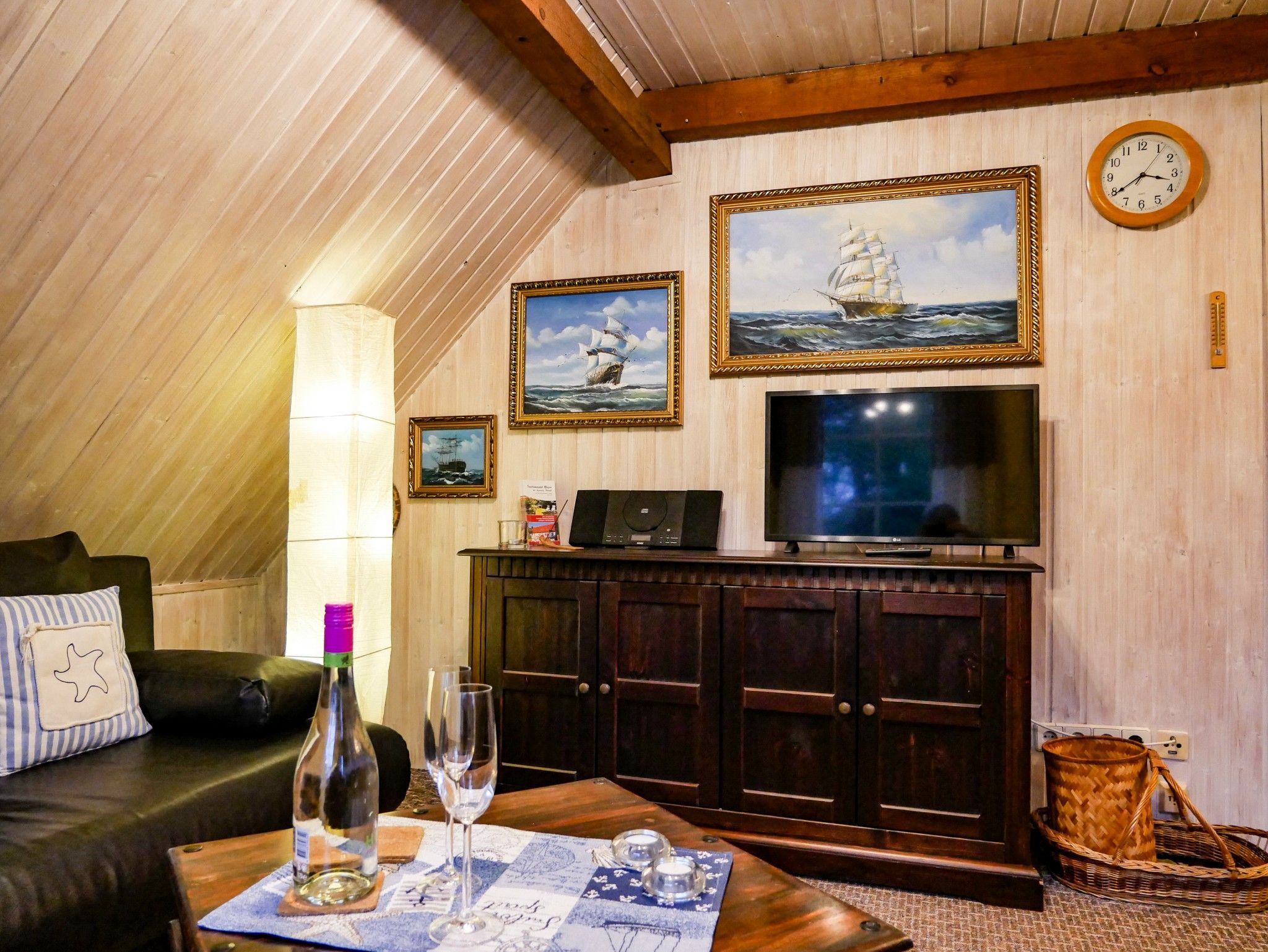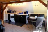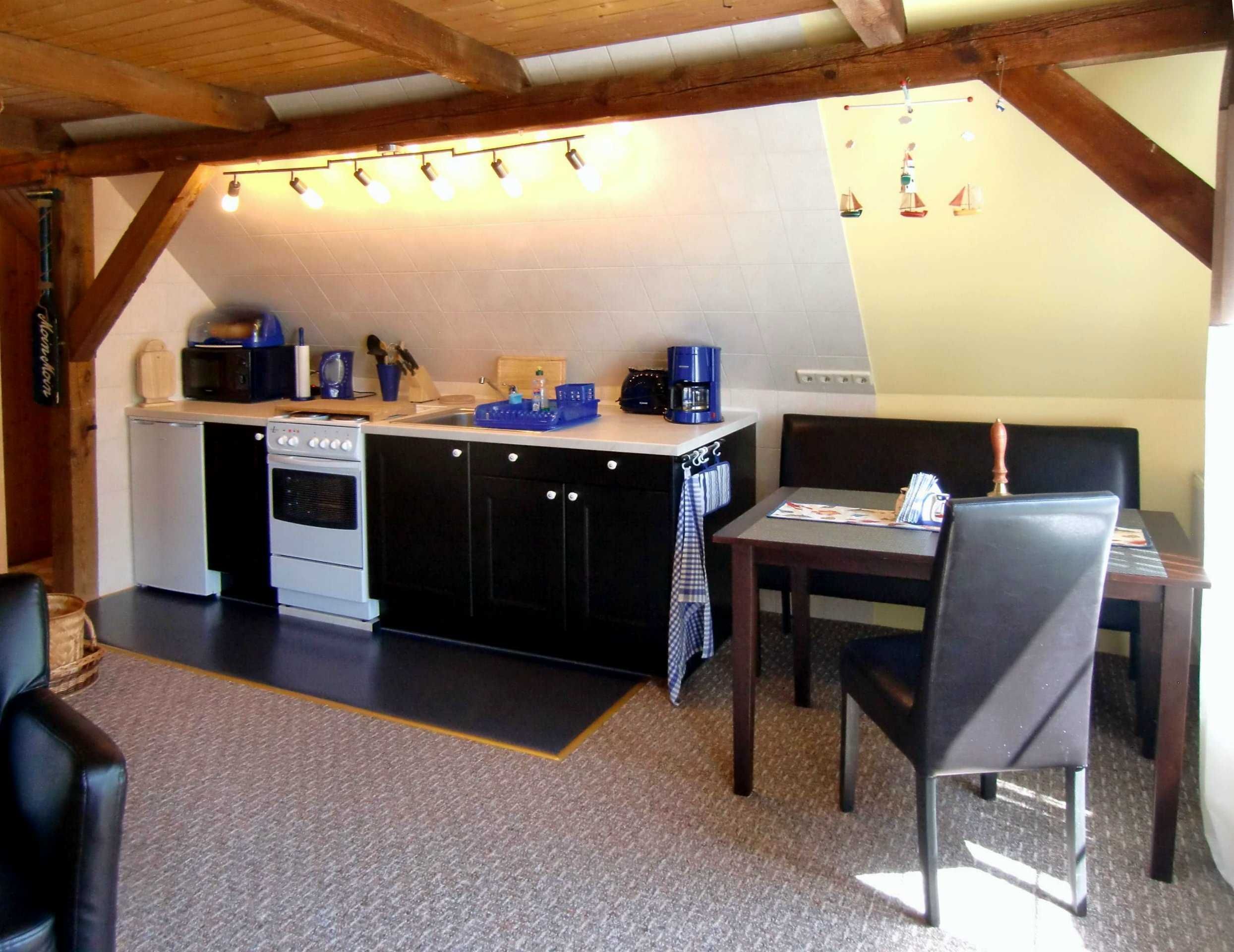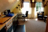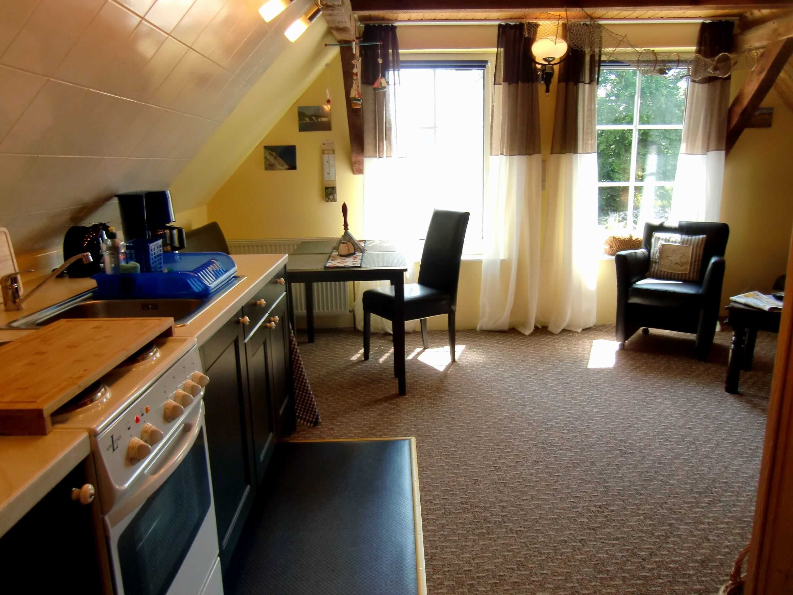 Das Appartement Captains Inn ist genauso eingerichtet: typisch nordisch, etwas kolonial, sehr gemütlich. Ein unmöglicher Mix? Die urige Atmosphäre in dieser ländlichen Ruhe passt prima. Dazu komfortabel mit volleingerichteter Küchenzeile und einem großen, hellen Bad mit Fenster, Fön und Kosmetikspiegel. Auch diverse Kosmetikprodukten sind vorhanden, falls Sie Ihre eigenen vergessen haben. Das Bett im holzverkleideten Schlafzimmer wie auch die Schlafcouch sind 1,40 m breit und äußerst bequem. Angeboten werden ofenfrische Brötchen in Varianten ab 9 Uhr an die Tür gehängt. Oder ein Tellerfrühstück ab 9 Uhr (nur außerhalb der Saison). Bei Gelegenheit gibt es einen Grillabend, einen Fischabend oder ab und an selbstgebackenen Kuchen. Alles ist auf Bequemlichkeit und Freundlichkeit ausgerichtet - der Gast möge sich von Anfang an zu Hause fühlen.