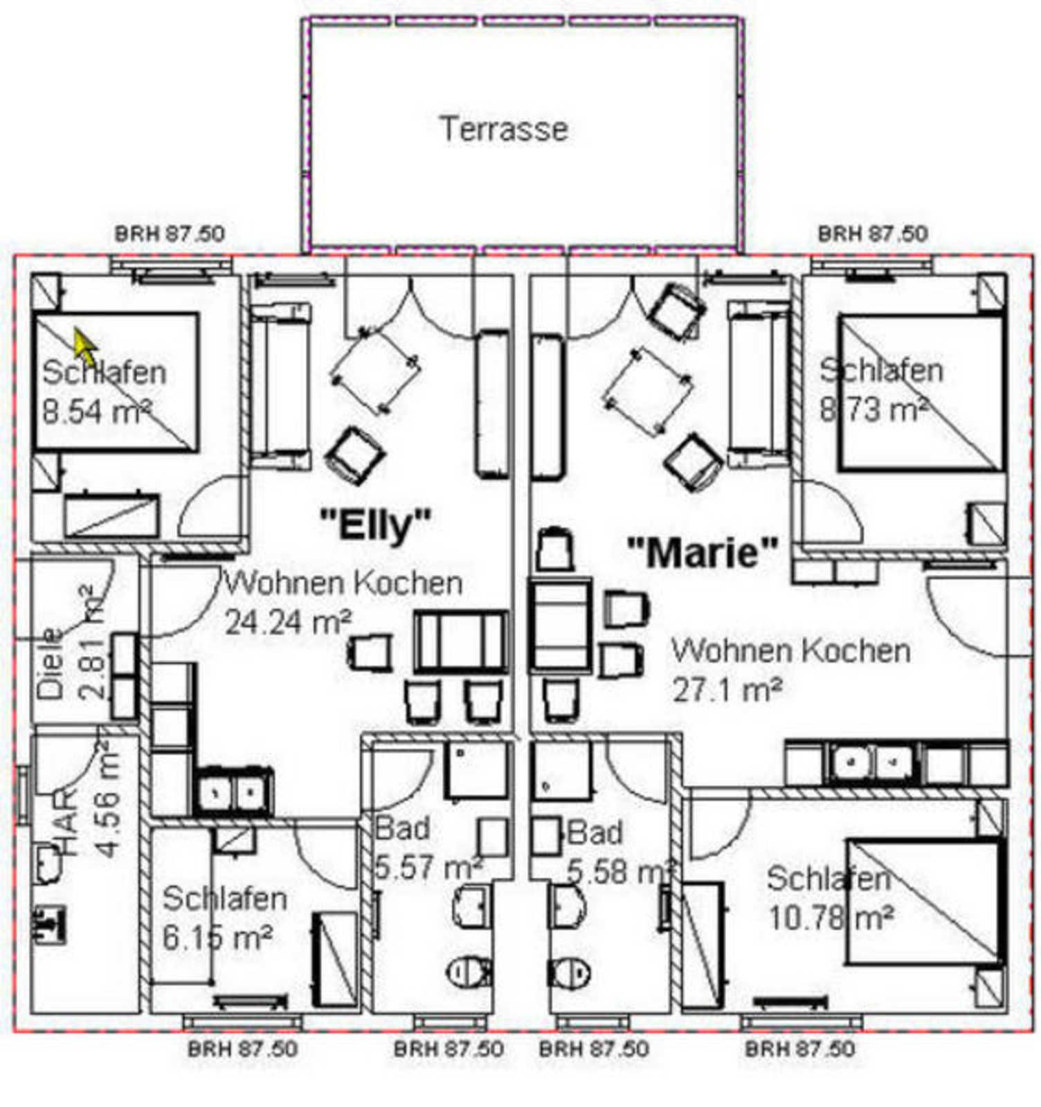 Die Wohnungen im EG bestehen aus jeweils 2 Schlafzimmern, Bad sowie einem kombinierten Wohn-Kochbereich mit Essplatz.