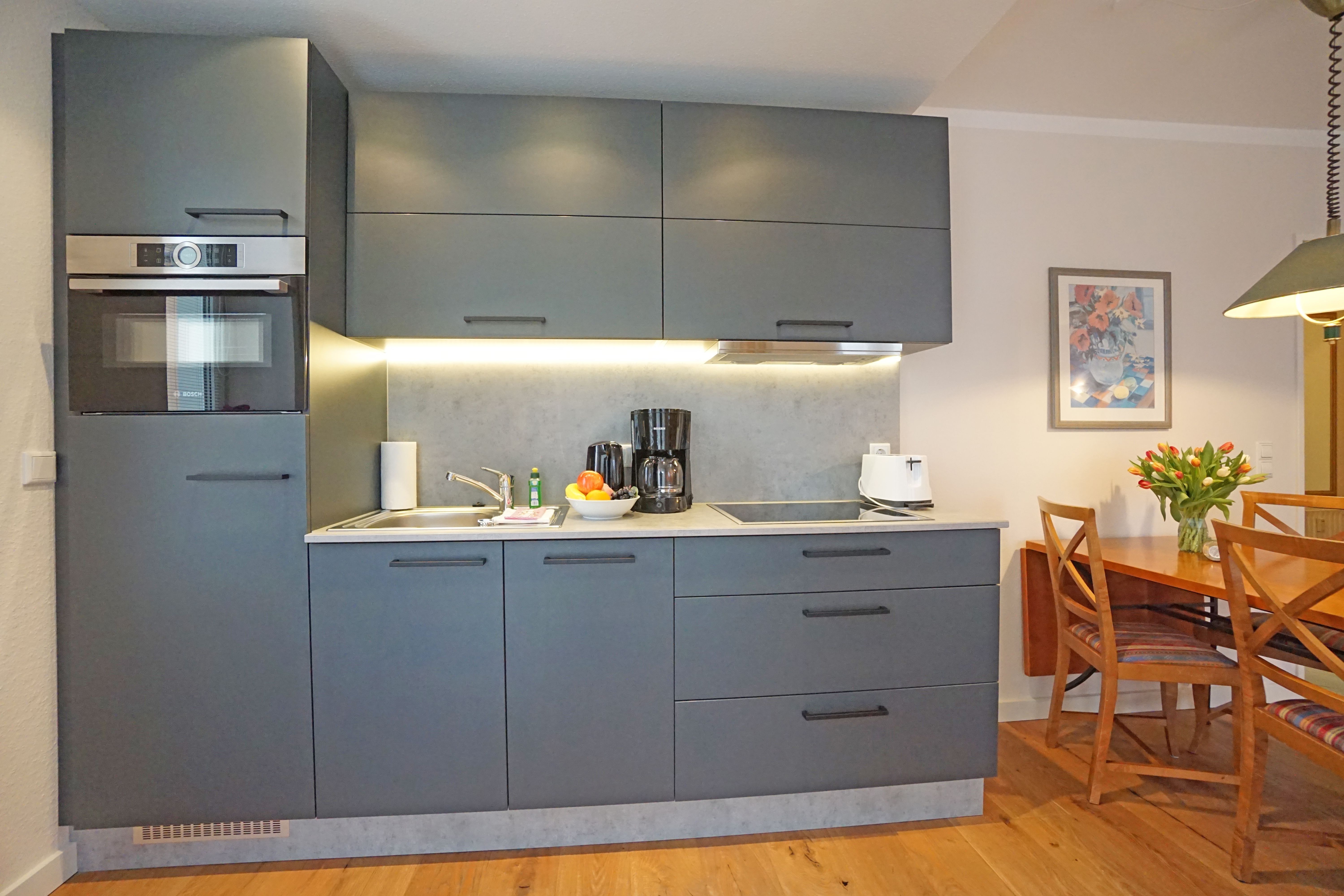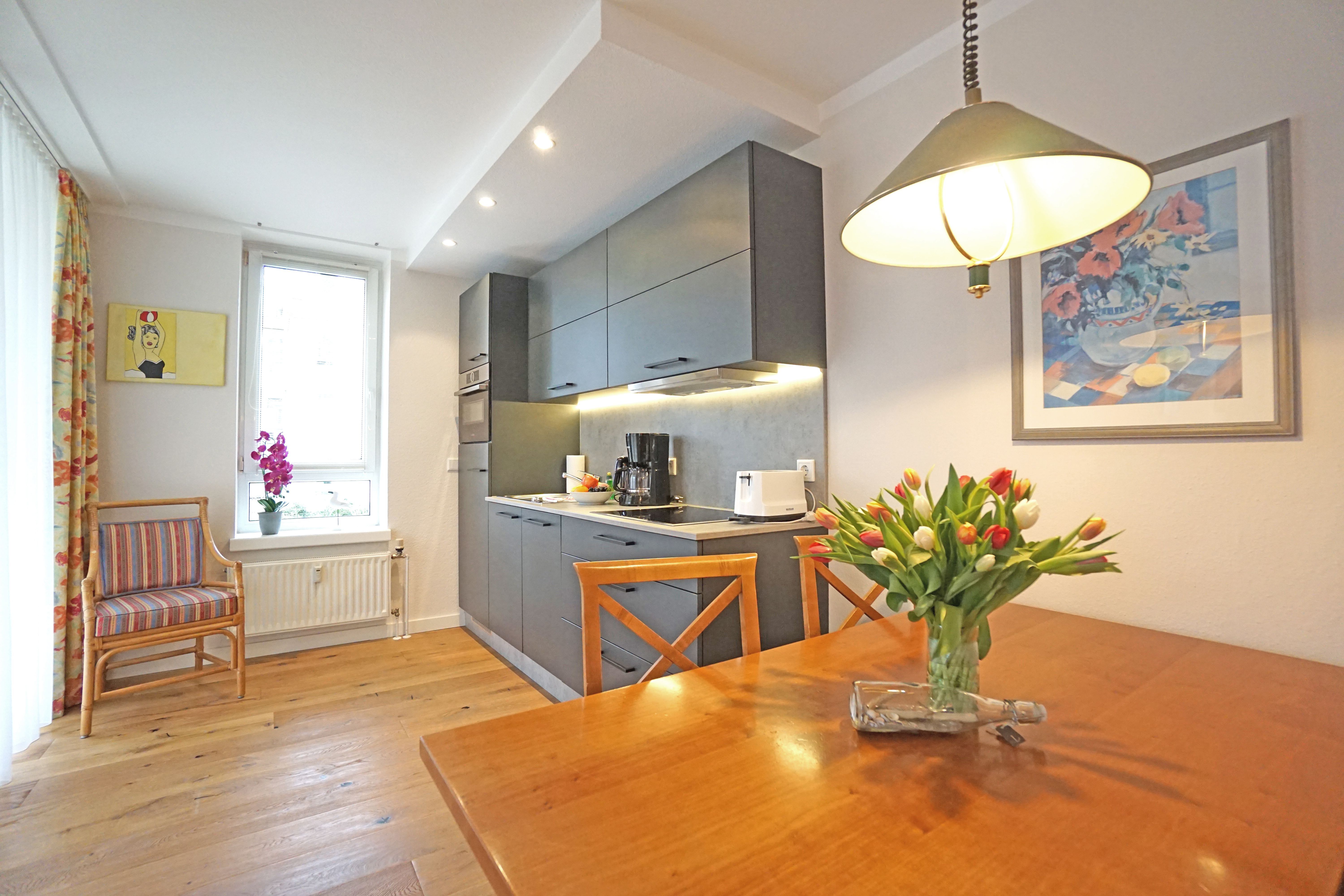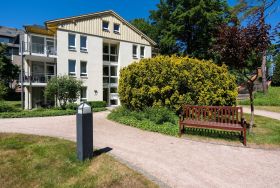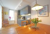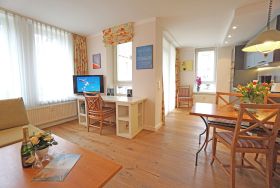 Freundliche,sehr helle Zweizimmer Ferienwohnung (45qm) für 2 - 4 Personen mit Balkon, direkt an der Promenade in gepflegtem Park mit altem Baumbestand gelegen. Die Wohnung hat neben dem Wohn- und Essbereich eine offene Küche mit Mikrowelle, Herd und Backofen. Das Schlafzimmer verfügt über ein Doppelbett, die Doppelschlafcouch im Wohnbereich ist für die 3. und 4. Person.