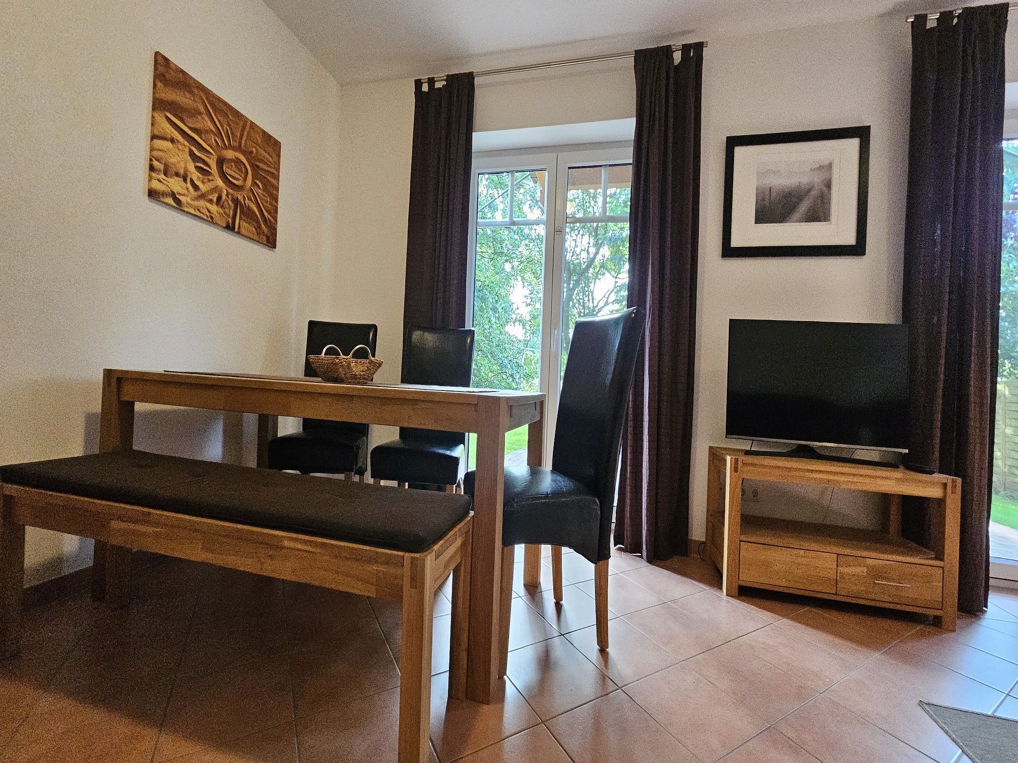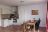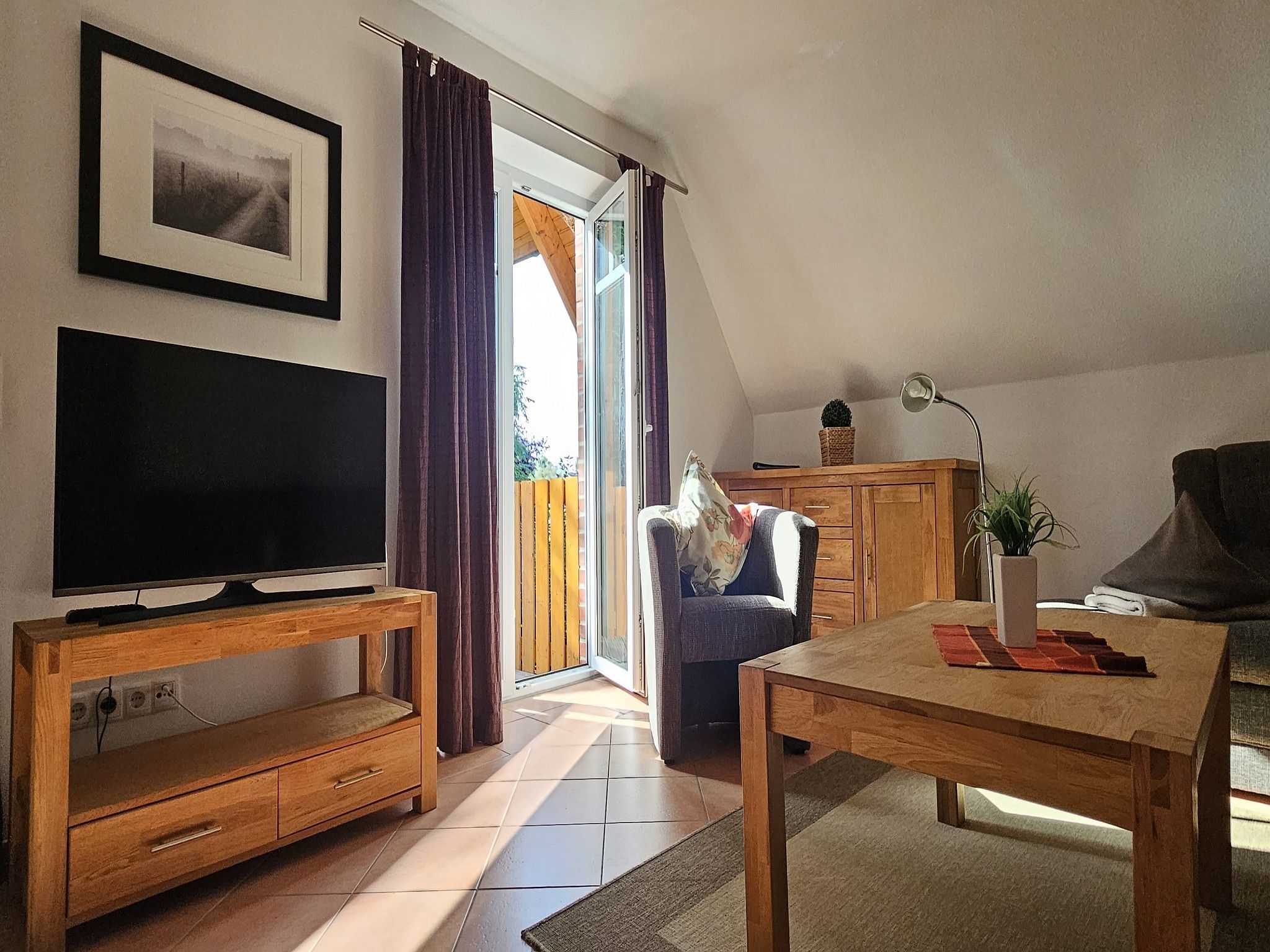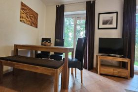 Im gemütlich eingerichtetem Wohnzimmer mit Balkon befindet sich ein großes Sofa. Die integrierte Küchenzeile ist voll ausgestattet, ein großer Esstisch mit sechs Sitzgelegenheiten steht direkt am Balkon.