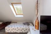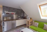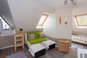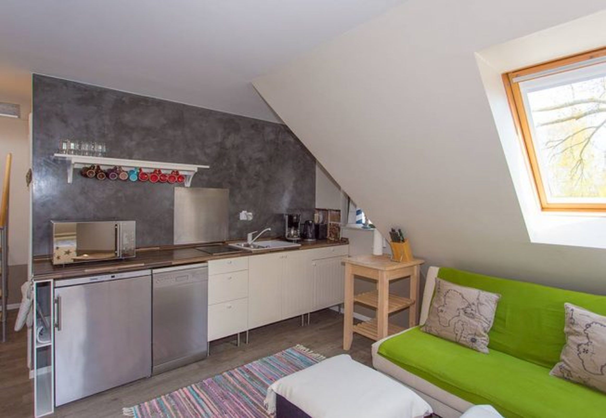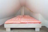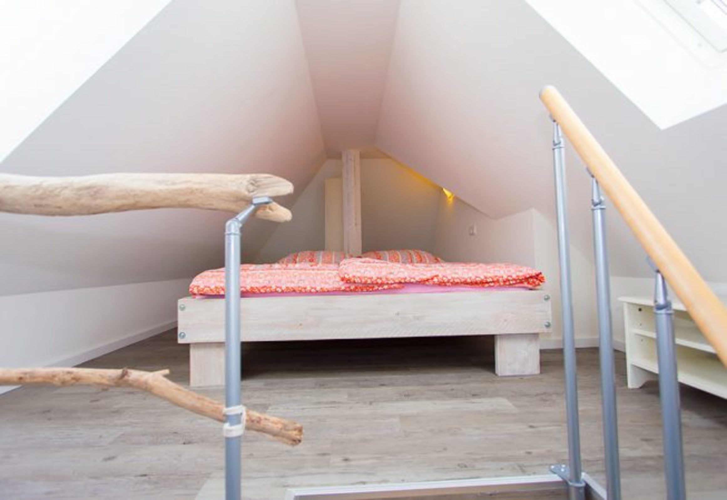 Ein Schlafbereich befindet sich optisch durch einen Wandvorsprung getrennt vom Wohnbereich. Hier stehen zwei Einzelbetten.Über eine Raumspartreppe gelangt man in das im Dachgeschoss liegende Schlafzimmer, welches mit einem bequemen Doppelbett ausgestattet ist. Das Bad verfügt über eine Dusche, WC und Waschtisch. Bettwäsche und Handtücher sind bei Ihrer Anreise selbstverständlich inklusive.