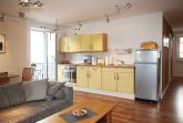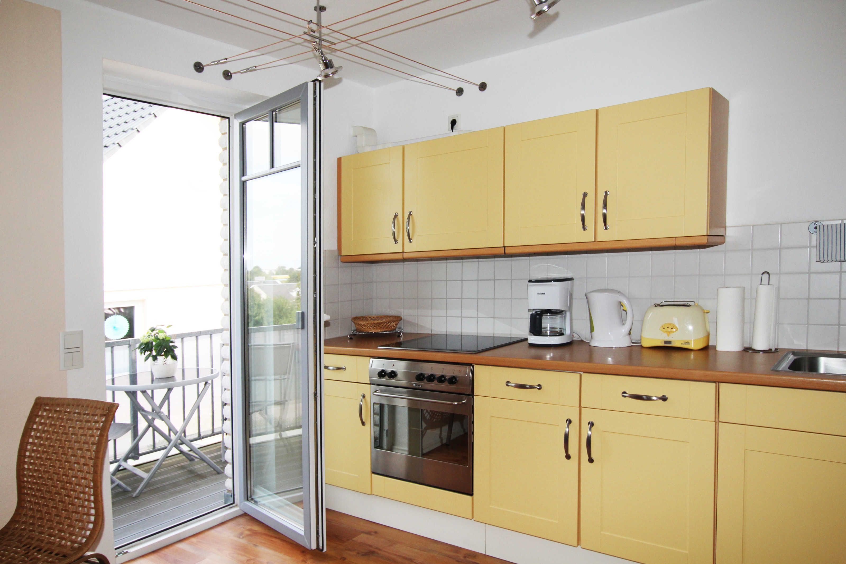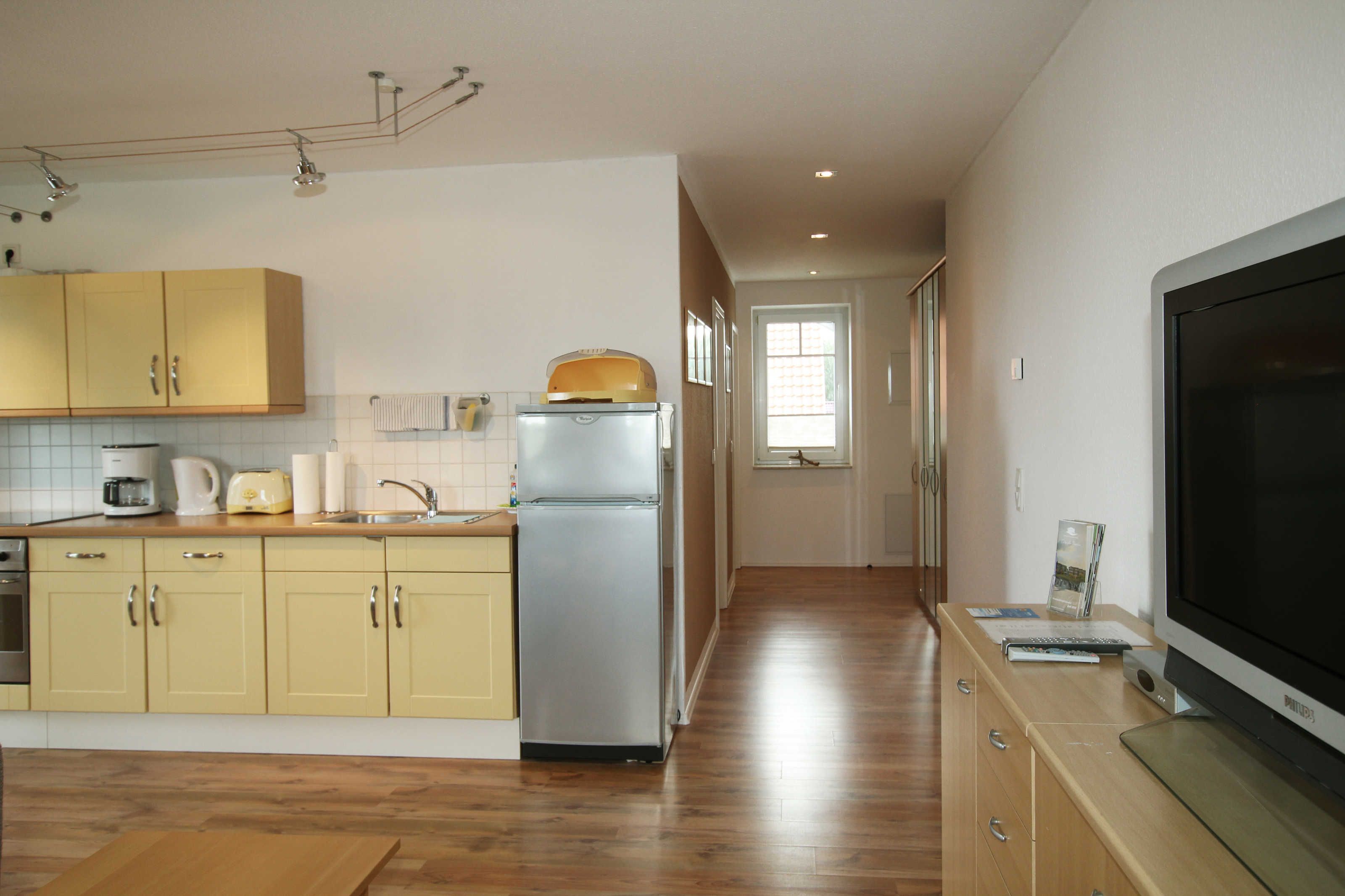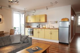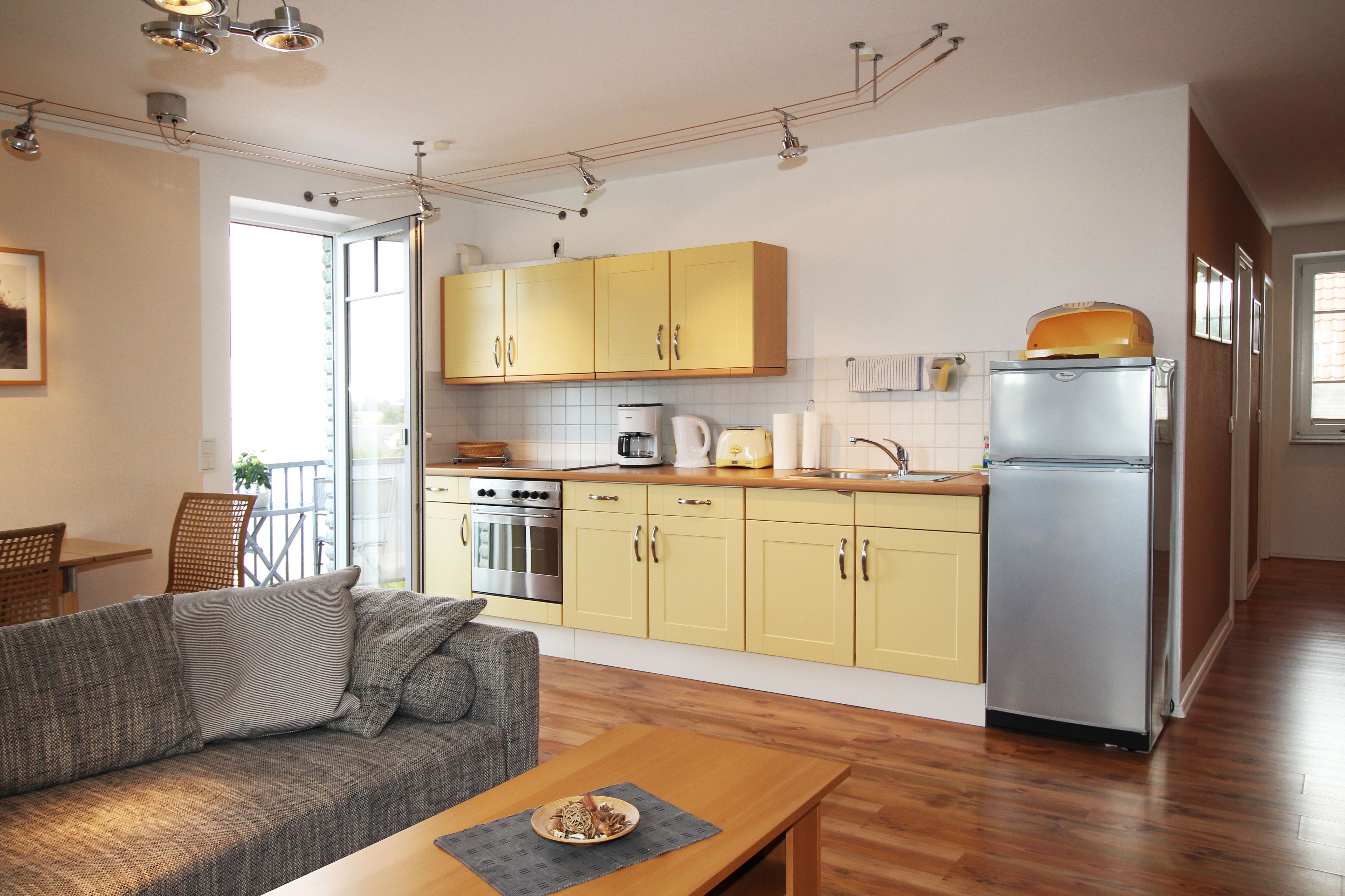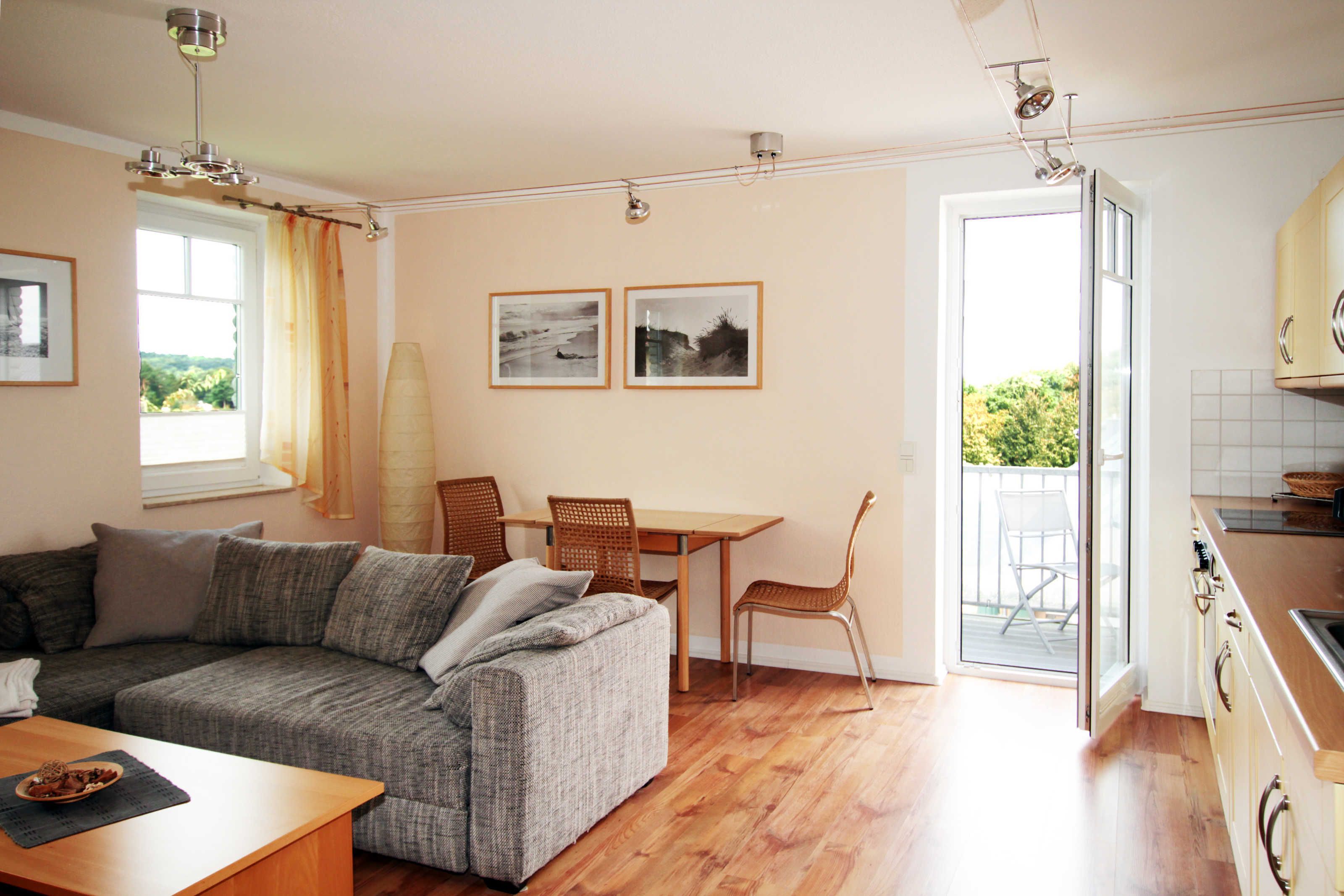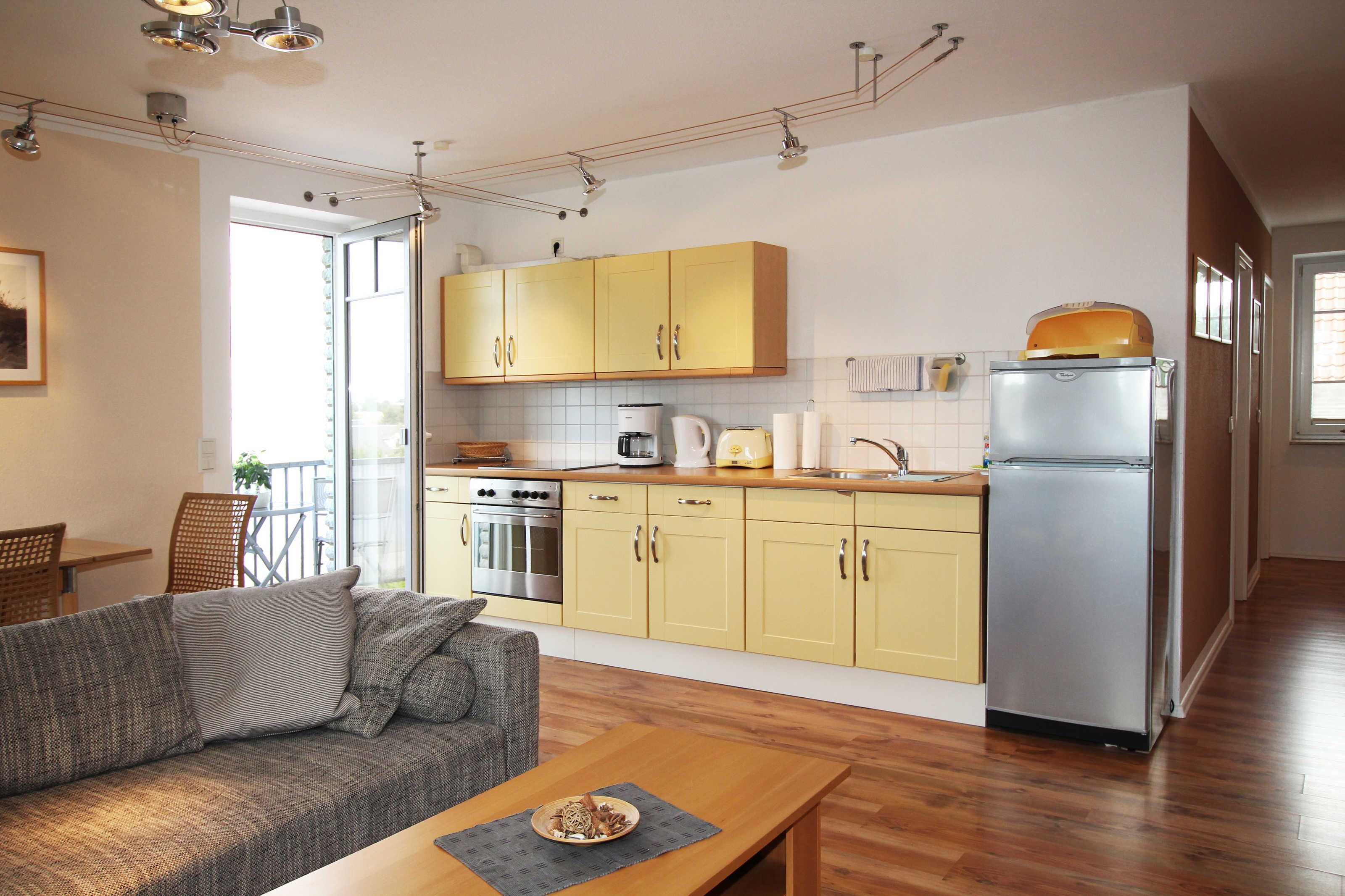 Die Ferienwohnung teilt sich auf in ein Wohnzimmer mit offener Küche, einem separaten Schlafzimmer mit Doppelbett und einem Badezimmer mit Dusche. Die Wohnung ist mit Laminat- und Fliesenfußböden mit Fußbodenheizung ausgestattet. Zur Wohnung gehört auch ein möblierter Balkon, der vom Wohnzimmer aus zu erreichen ist.