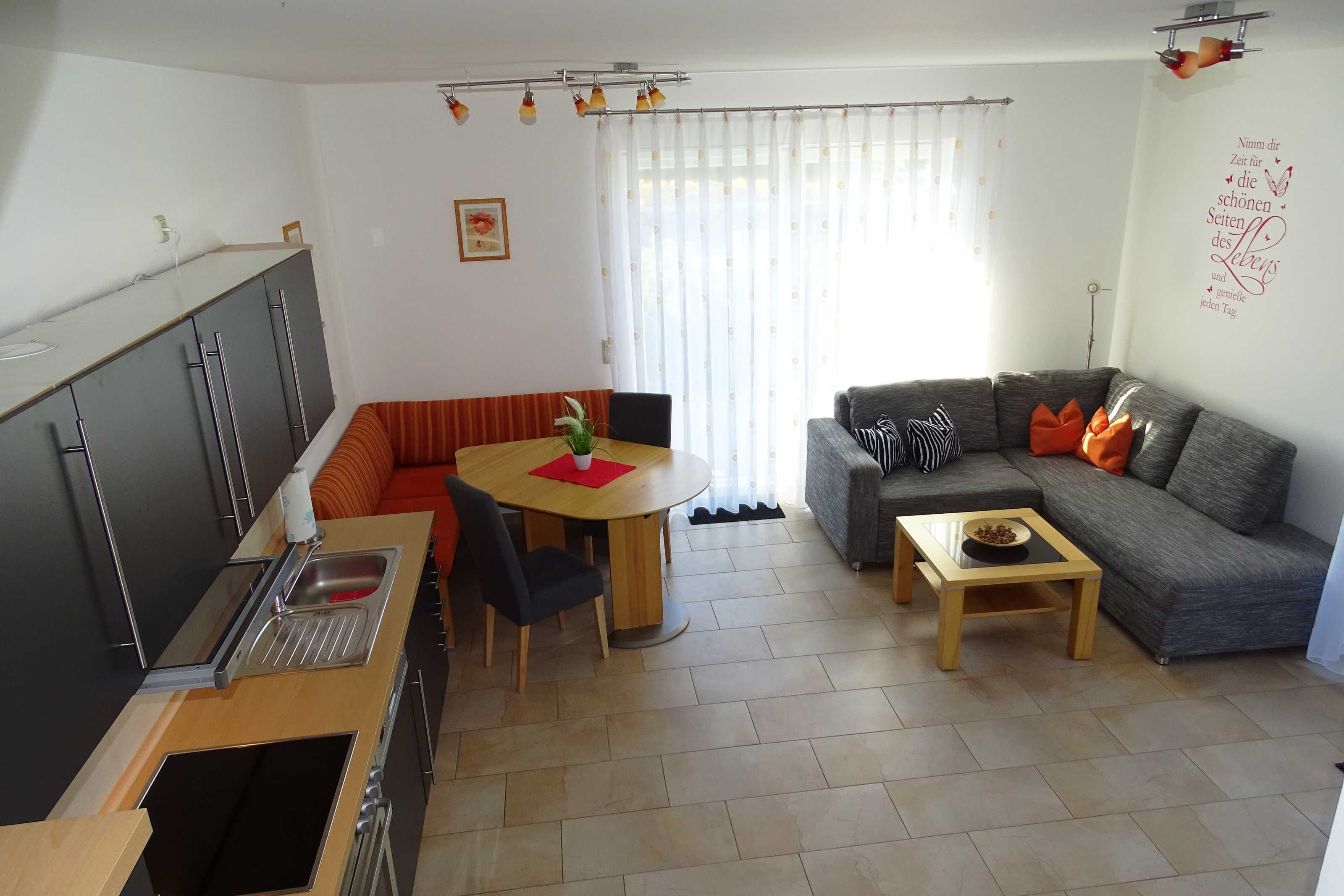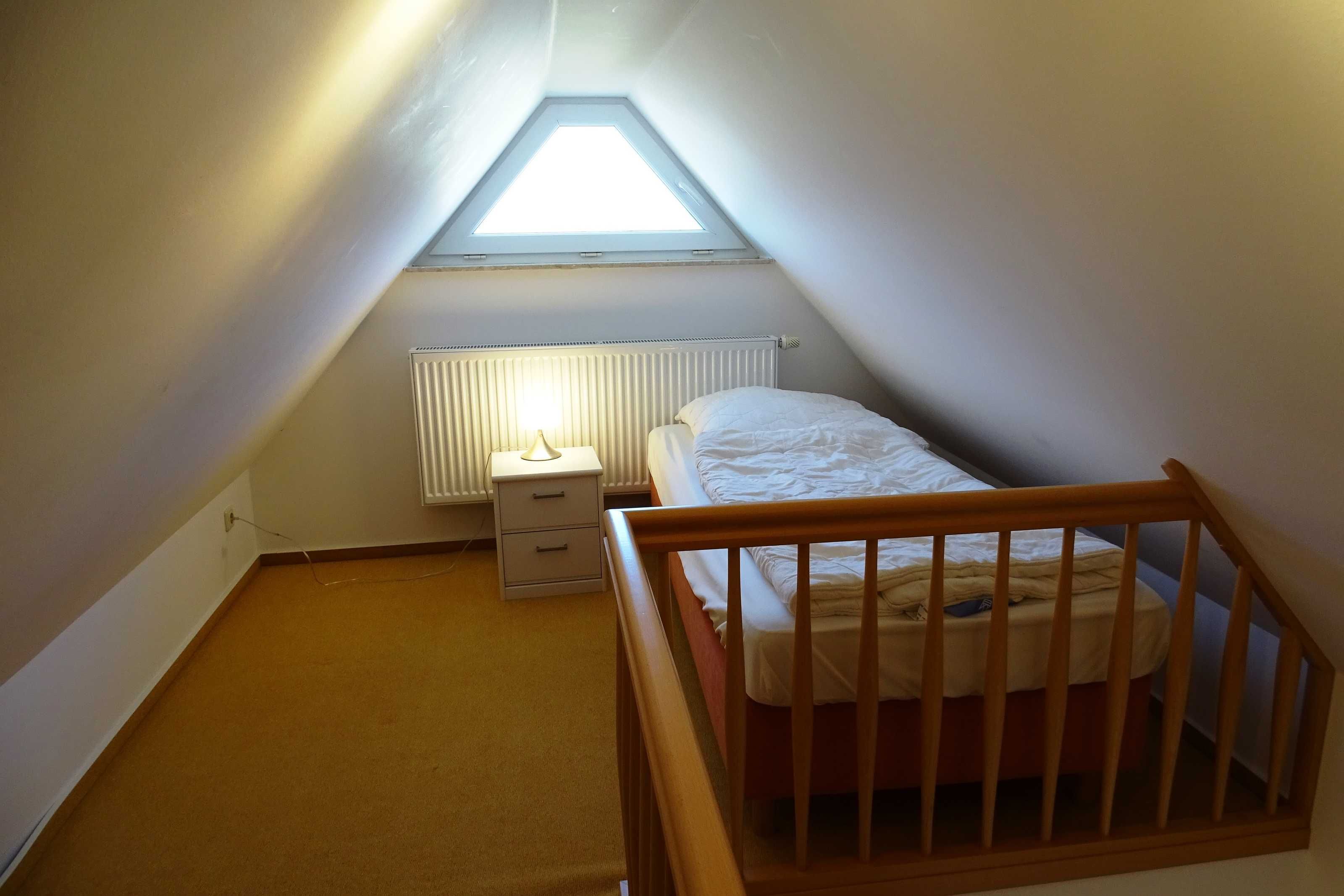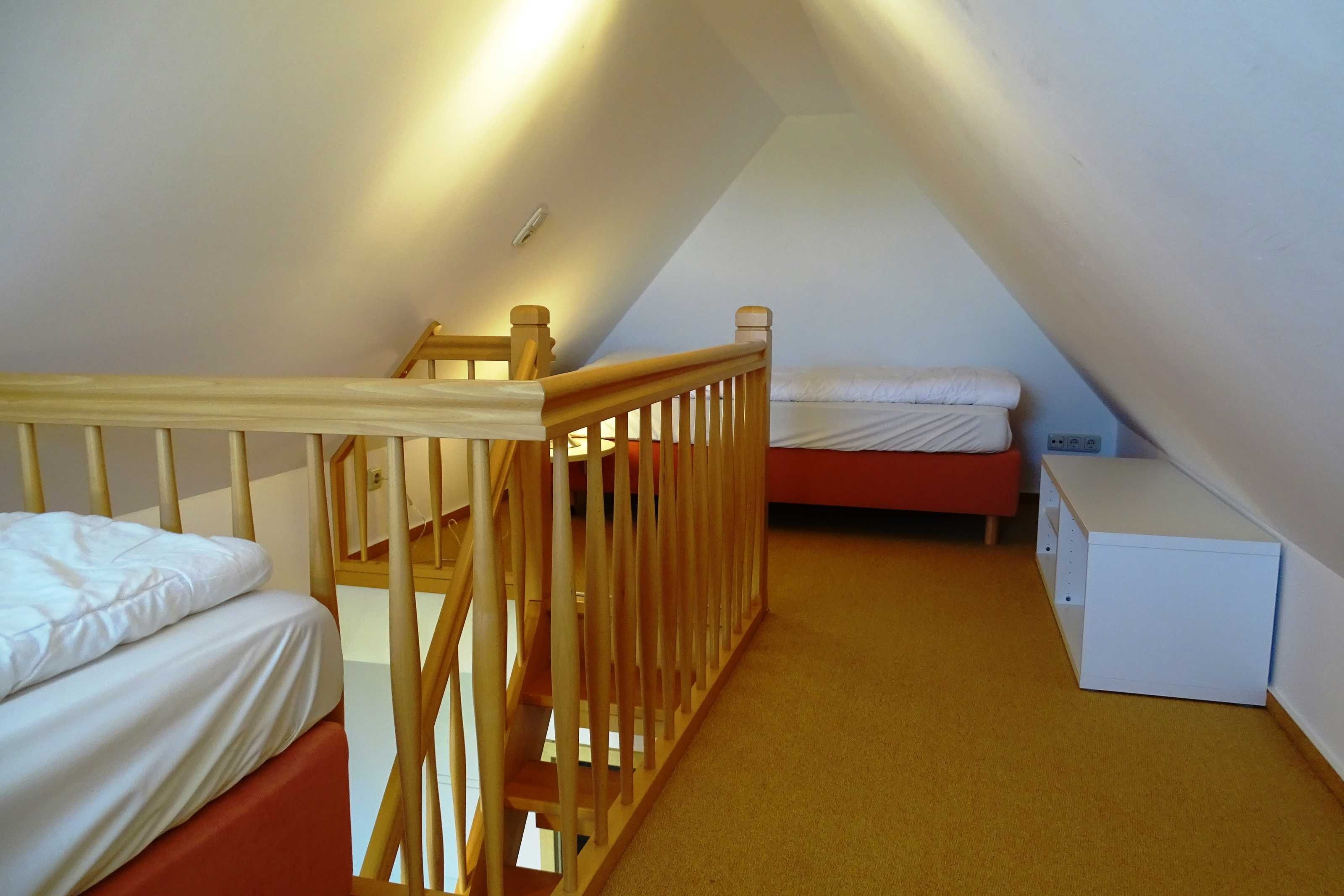 Die 70 m² große Ferienwohnung hat einen separaten ebenerdigen Eingang und jeweils eine Terrasse in Süd- und in Westlage mit Sitzgruppen. Erleben Sie hier einen unvergesslichen Sonnenuntergang! Im Erdgeschoss befindet sich das Wohnzimmer mit integrierter voll ausgestatteter Küche sowie ein Gäste-WC. Im ersten Obergeschoss befindet sich ein Schlafzimmer mit einem Doppelbett sowie ein Bad mit Dusche/WC. Vom ersten Obergeschoss erreichen Sie über eine normale Treppe den ausgebauten Schlafboden mit zwei Betten.