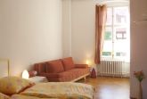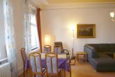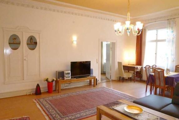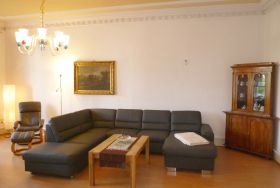 Ferienwohnung mit herrschaftlicher Raumhöhe und wunderschönen Stuckdecken. Das herrschaftliche, helle Wohnzimmer ist 40 m² groß. Komfortables Schlafzimmer mit Doppelbett und zusätzlicher Schlafcouch. Das Schlafzimmer verfügt über einen wunderschönen geölten Originalfußboden. Die Wohnung befindet sich im ersten Obergeschoss auf der rechten Seite.