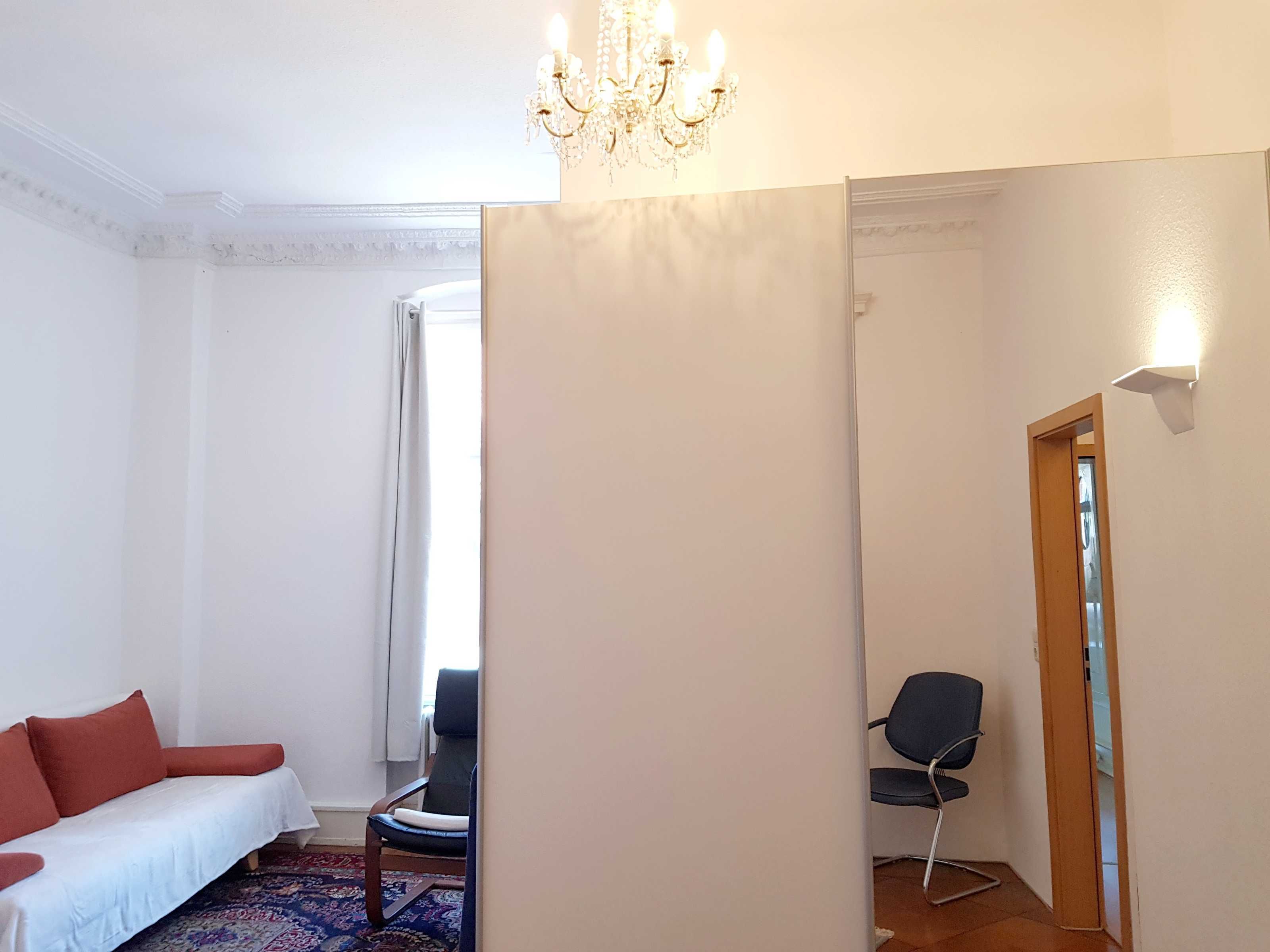Herrschaftliches Wohnzimmer mit sehr schöner Stuckdecke. Schlafzimmer mit Doppelbett und zusätzlicher Schlafcouch (1,40 m x 2m). Badezimmer mit Badewanne und Dusche. Erleben Sie eine ganz besondere Atmosphäre.