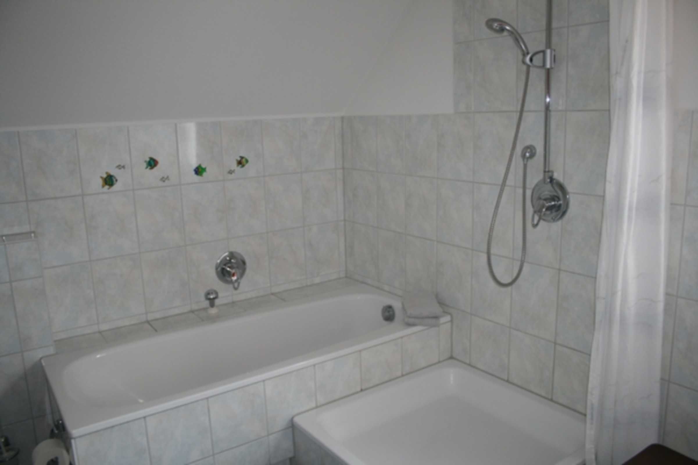3 Schlafräume: 1 mit Doppelbett und Kinderbett, 1 x mit 2 Einzelbetten , 1 x mit 1,40 m Futonbett (Zimmer erreichbar über zusätzliche Treppe in der Wohnung). Großes Badezimmer mit Badewanne, Dusche und Wickeltisch.