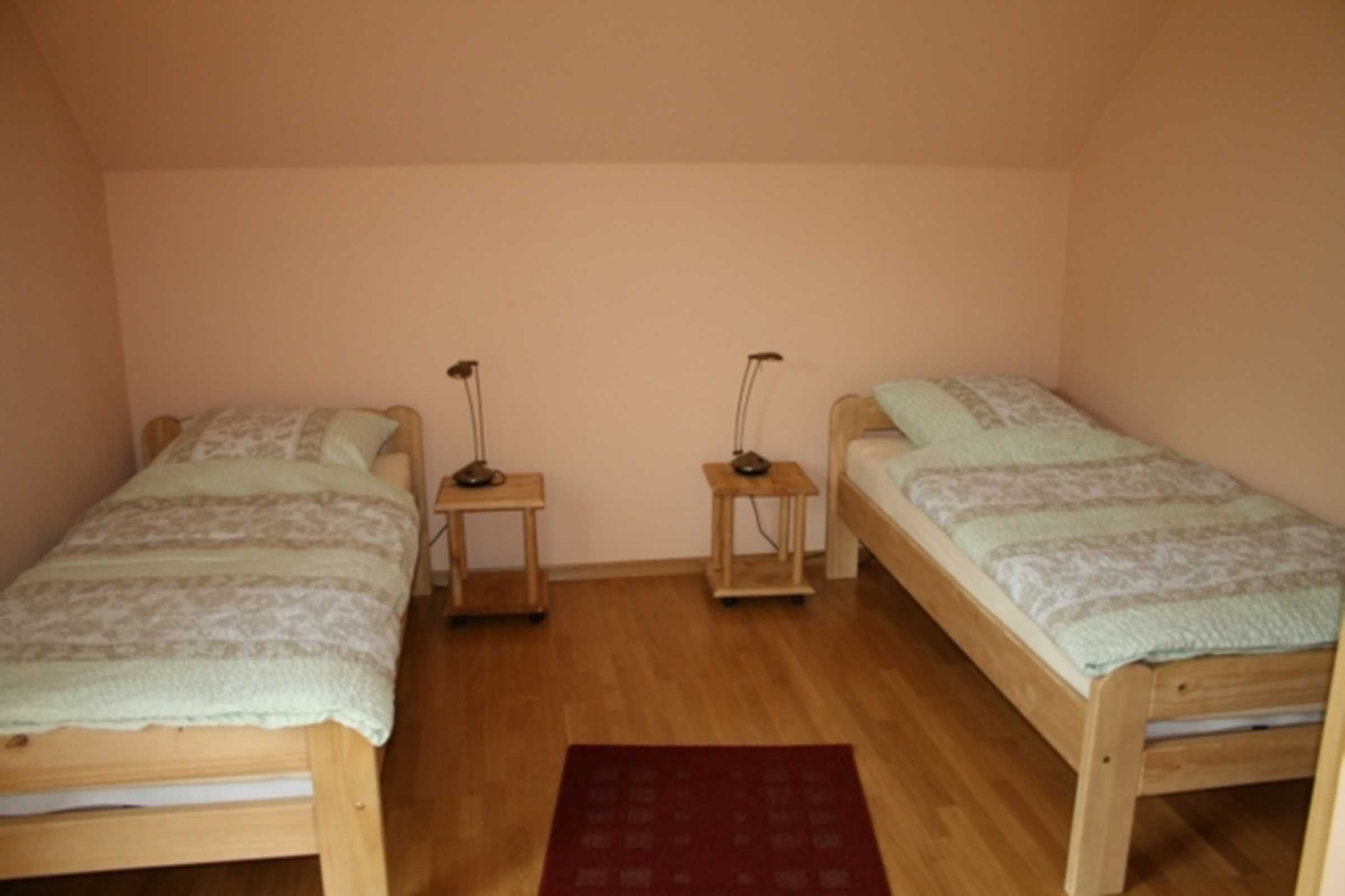 Unterkunft: Geräumige 4-Zimmer-Ferienwohnung im Dachgeschoss, mit separatem Eingang. Wohnzimmer mit integrierter Küche, 3 separate Schlafzimmer, Balkon, Bad mit Wanne und Dusche, eigene Sitzecke im Garten, Kinderspielplatz im Garten.