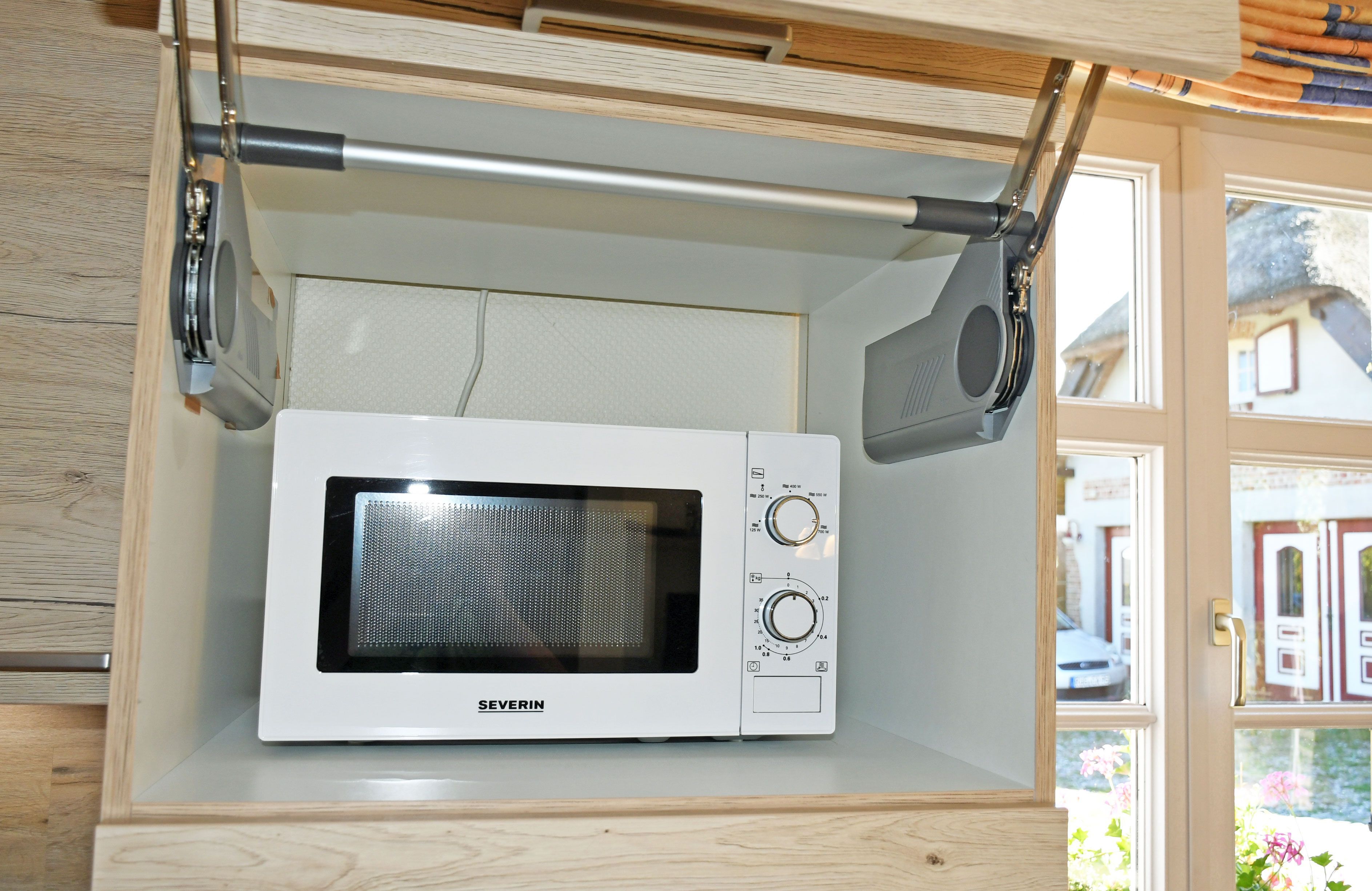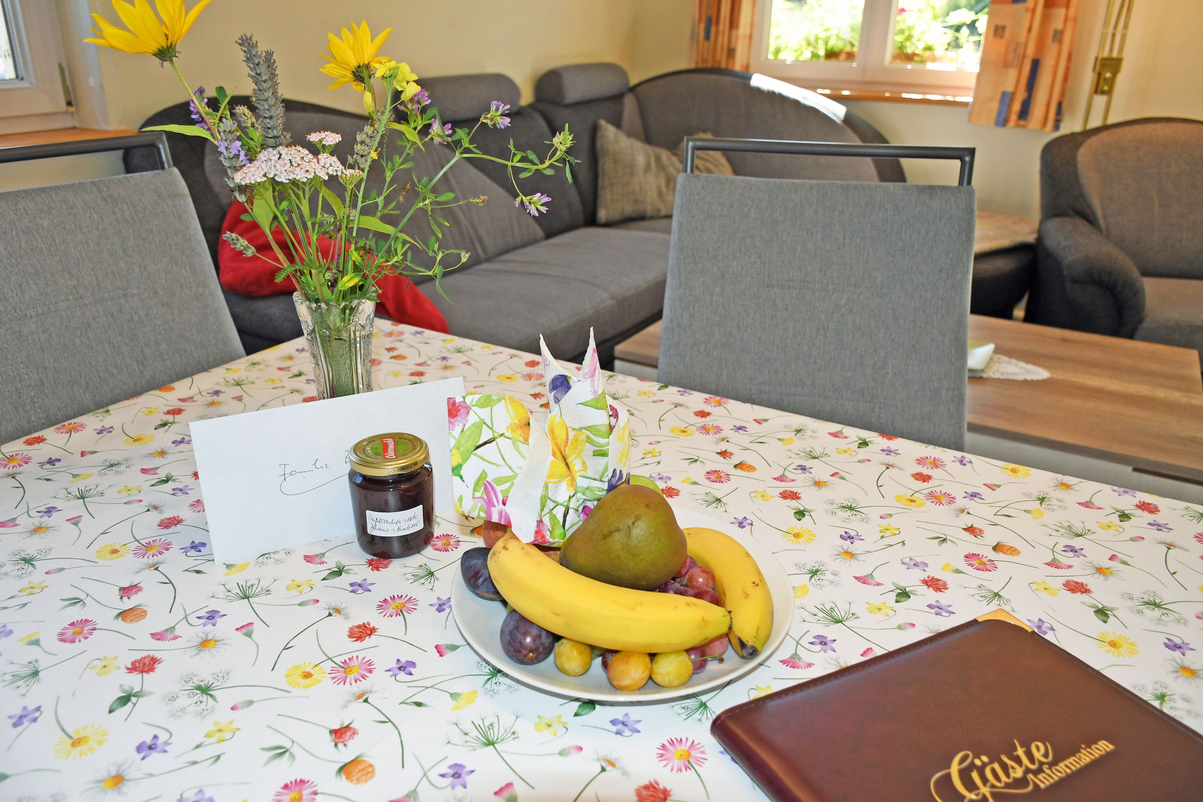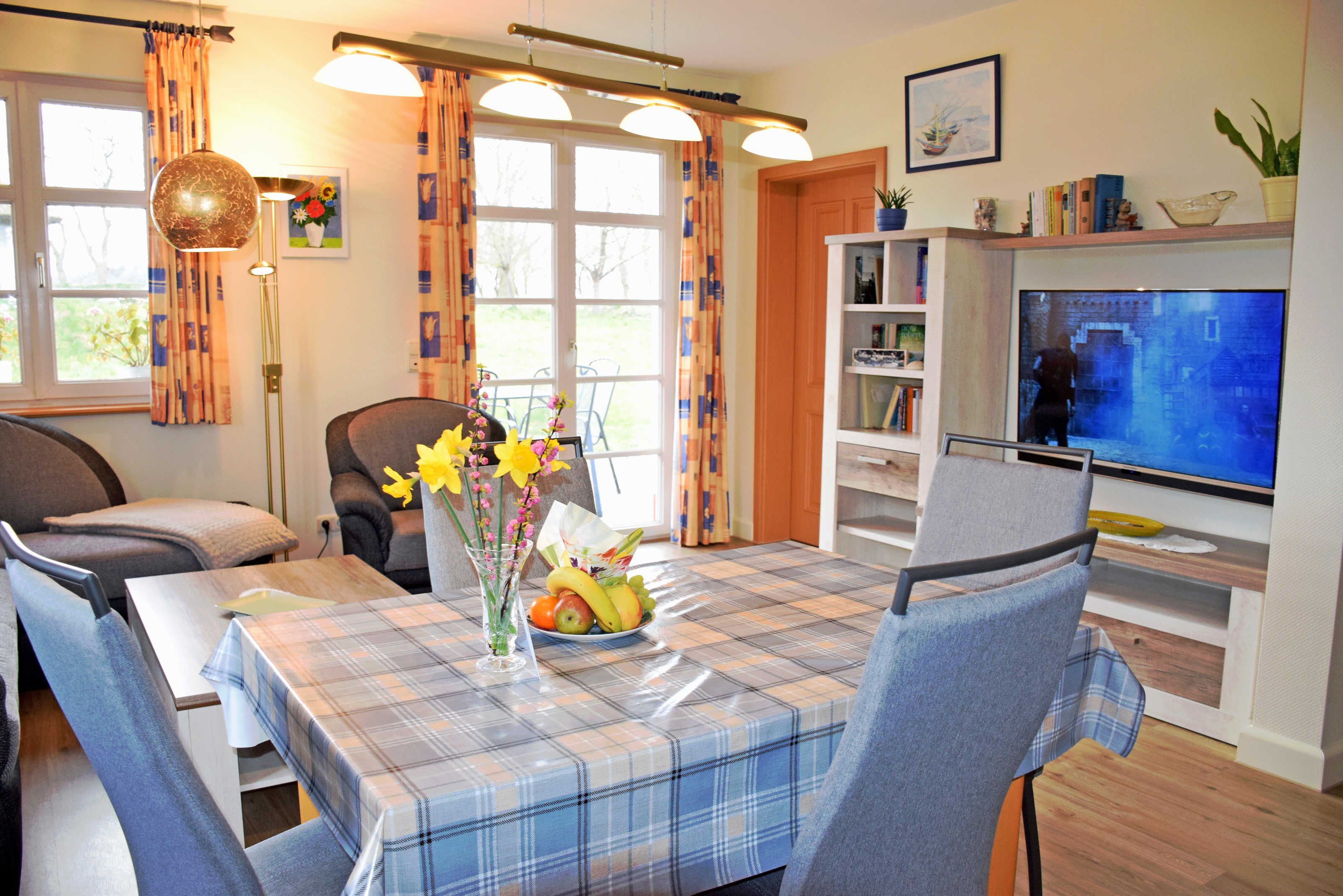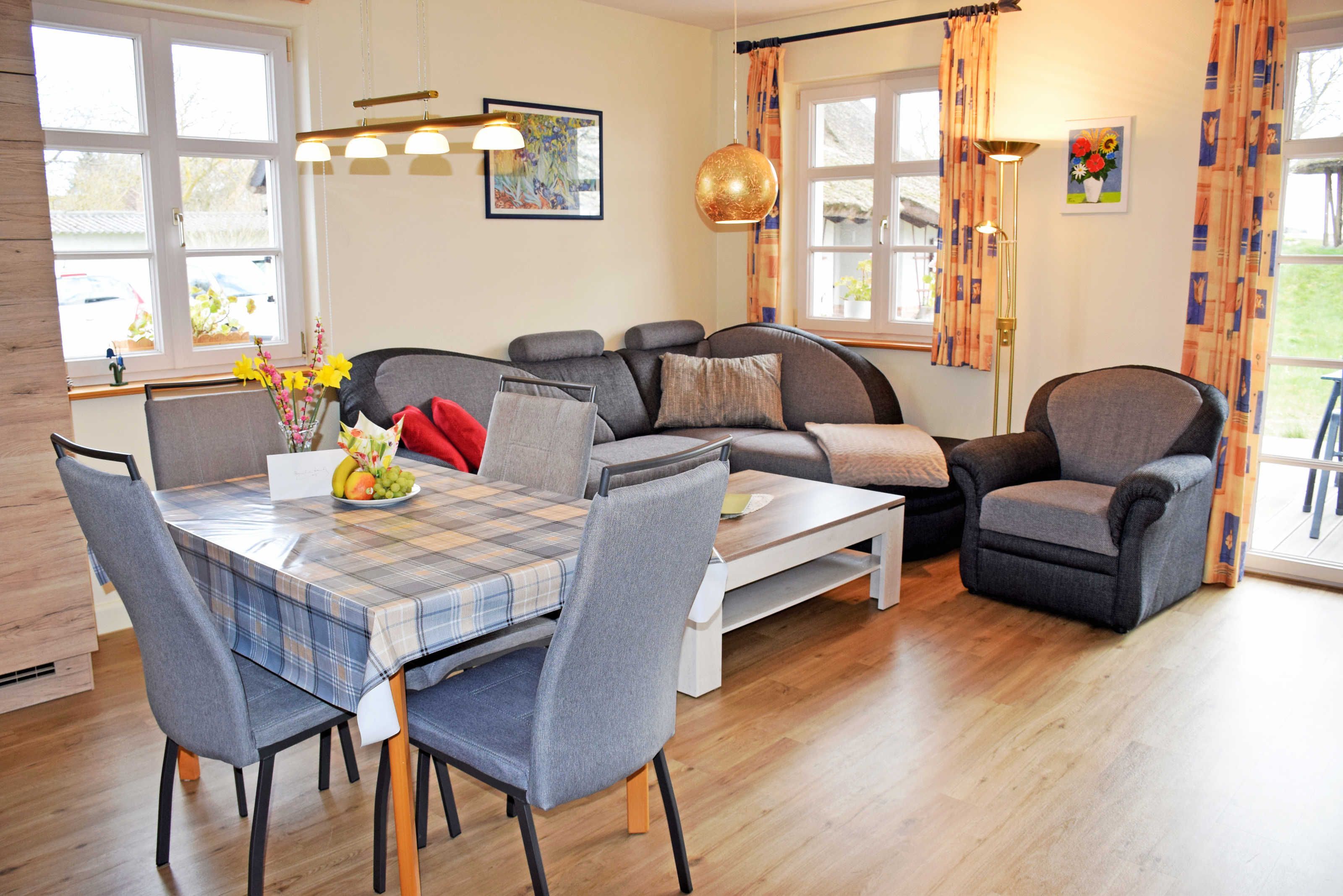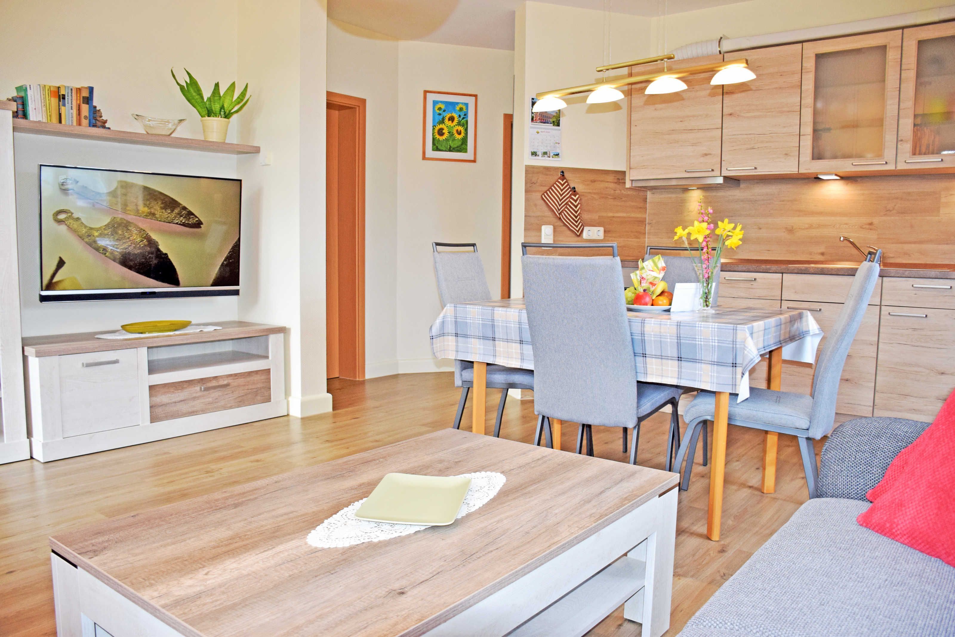 Es verfügt über ein Wohnzimmer mit Flachbild-TV, Sitzcouch mit Sessel und Tisch, Esstisch mit Stühlen und eine Küchenzeile mit Cerankochfeld (4 Felder), Backofen, Geschirrspüler, Kühlschrank, Gefrierschrank und Mikrowelle.