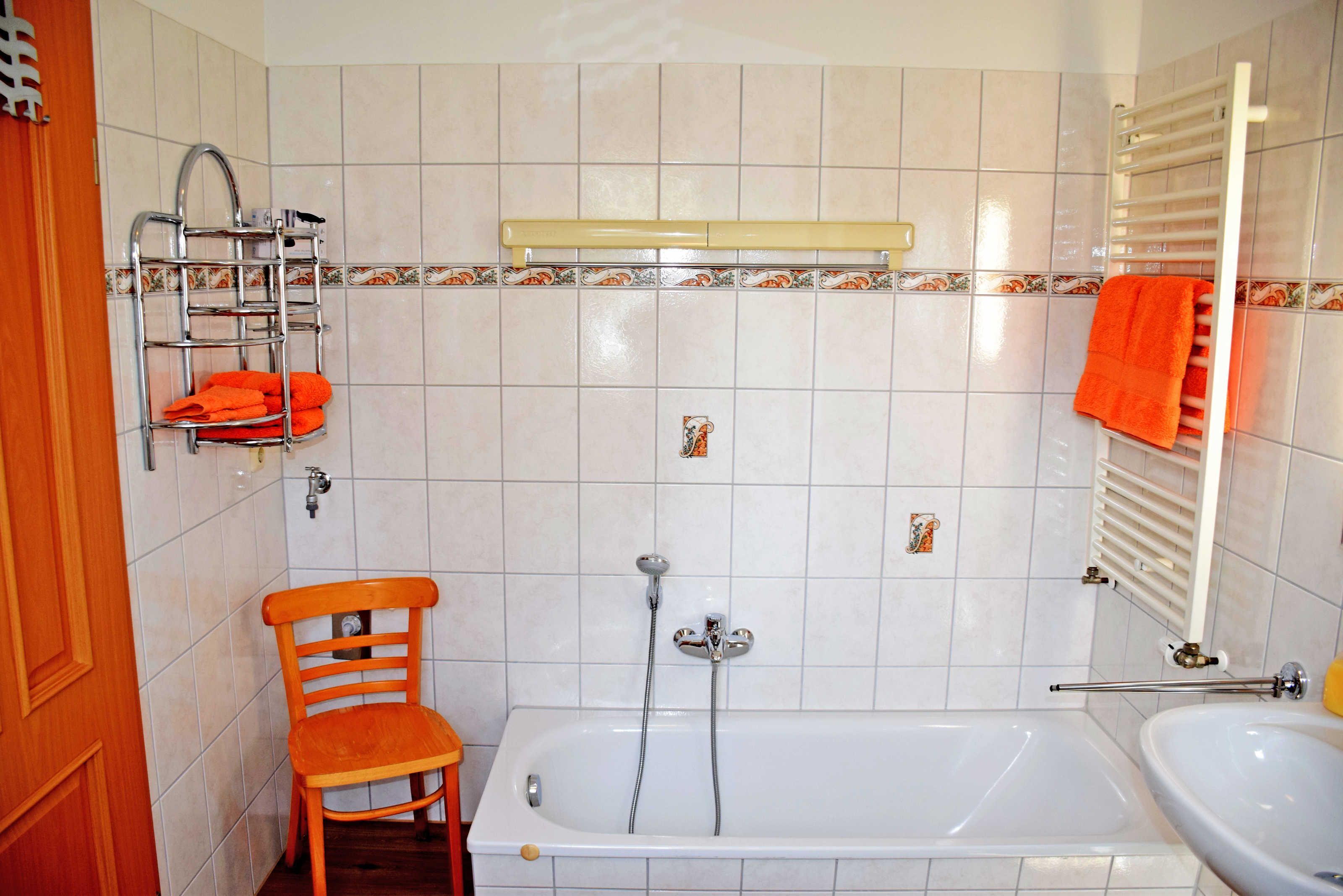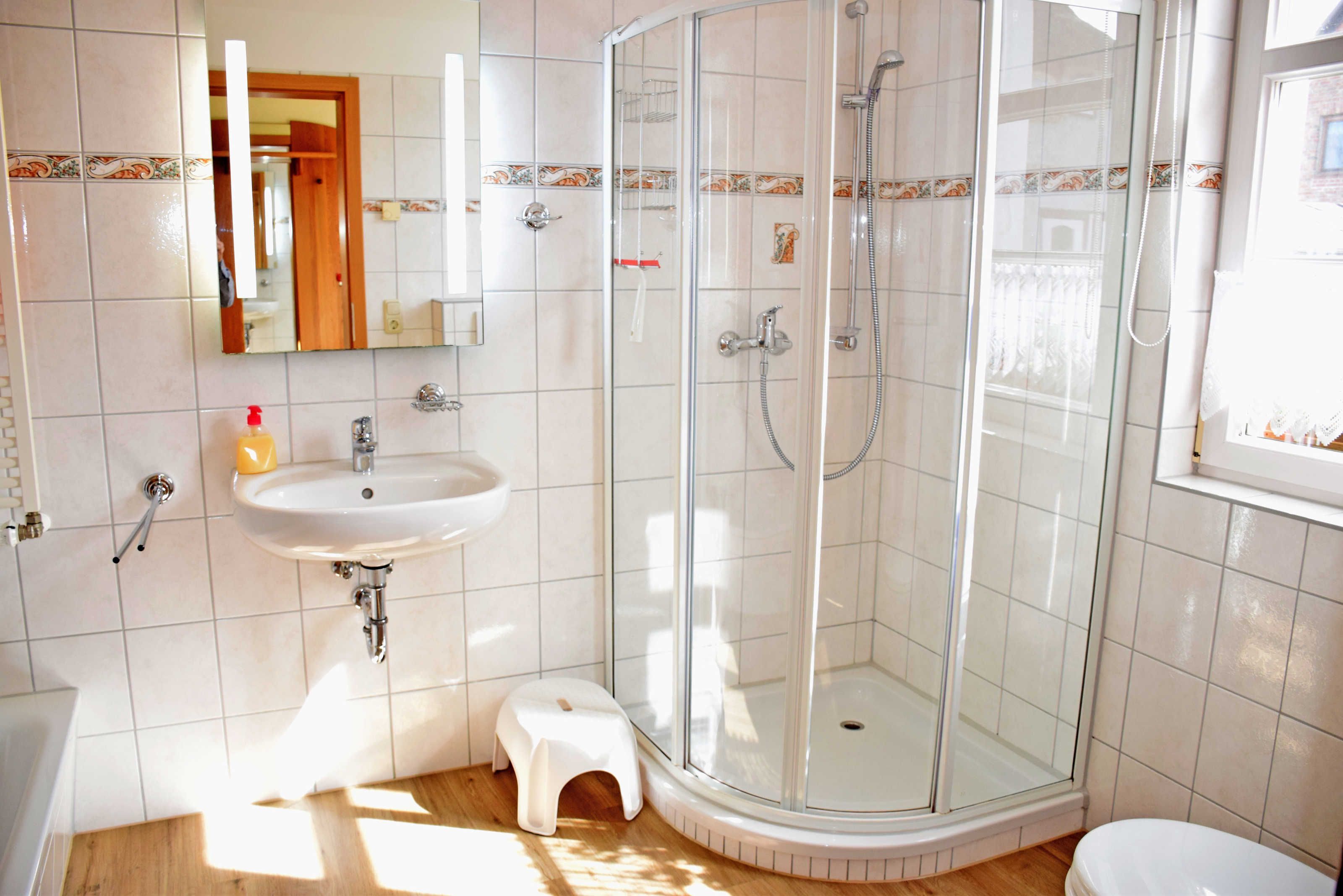 Das große Bad mit Tageslicht verfügt über Dusche und Badewanne. Handtuchwärmer, Fön sowie Waschbecken und WC.