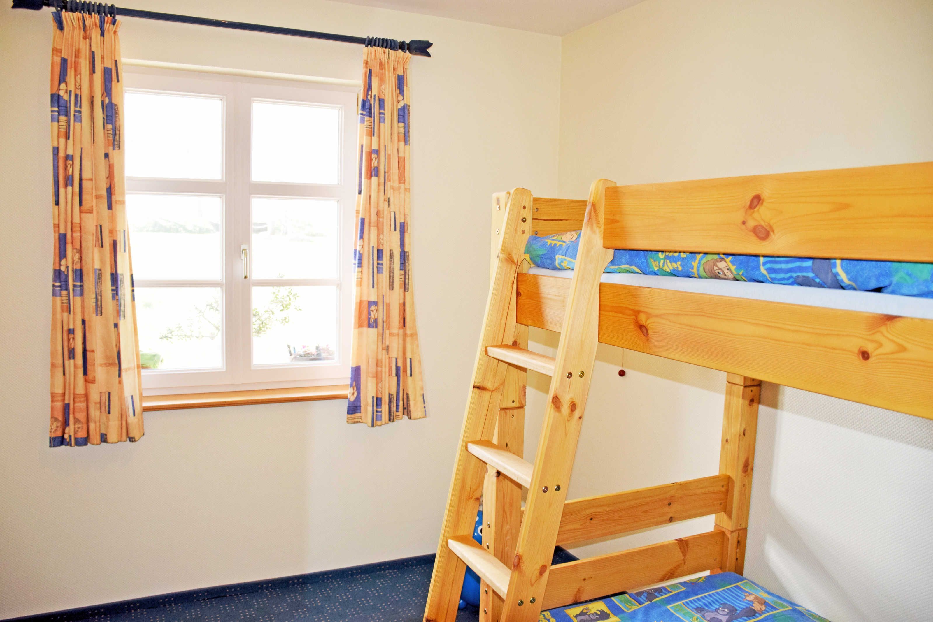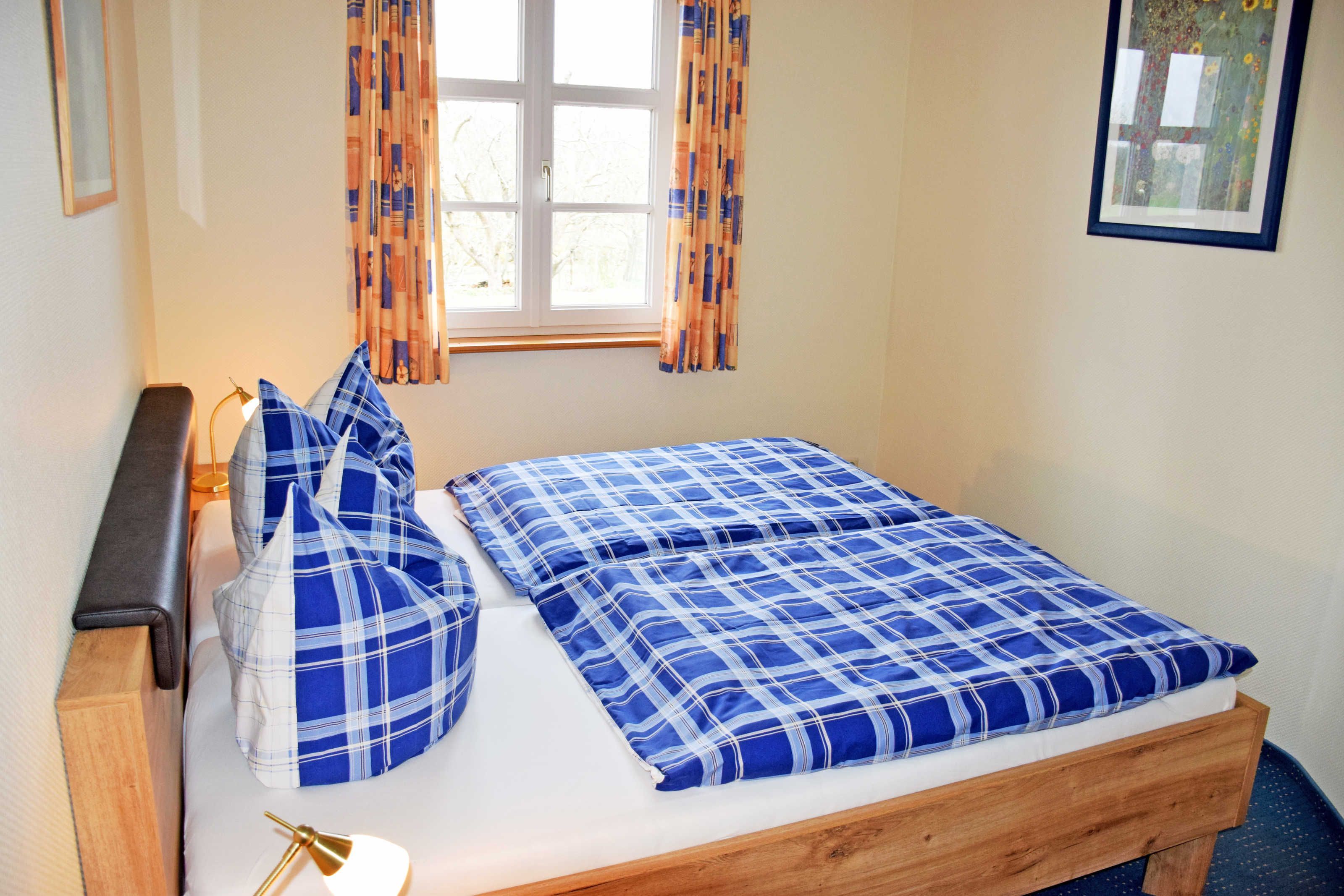 Vom Flur aus erreichen Sie das 1. Schlafzimmer mit bequemen Doppelbett, Nachttischen und Leselampen sowie Kleiderschrank. In einem weiteren Schlafzimmer stehen ein Etagenbett, Nachttisch und Leselampe und ein Kleiderschrank.