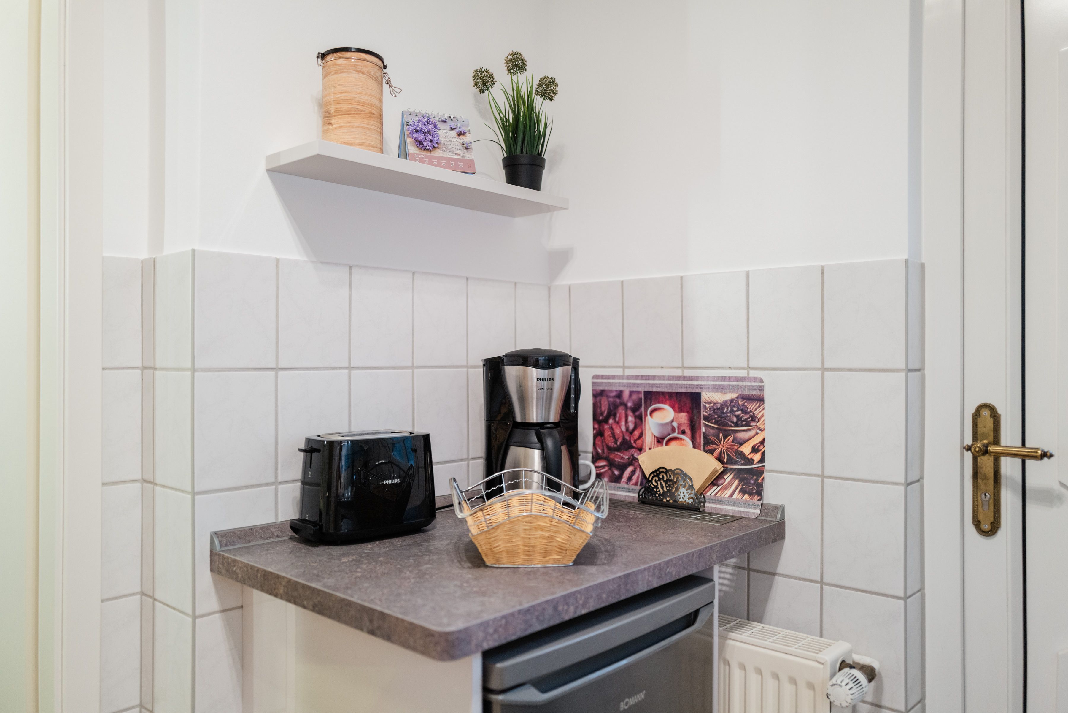 Eine voll ausgestattete Küchenzeile mit Herd, Backofen, Kühlschrank, Kaffeemaschine, Wasserkocher und Mikrowelle